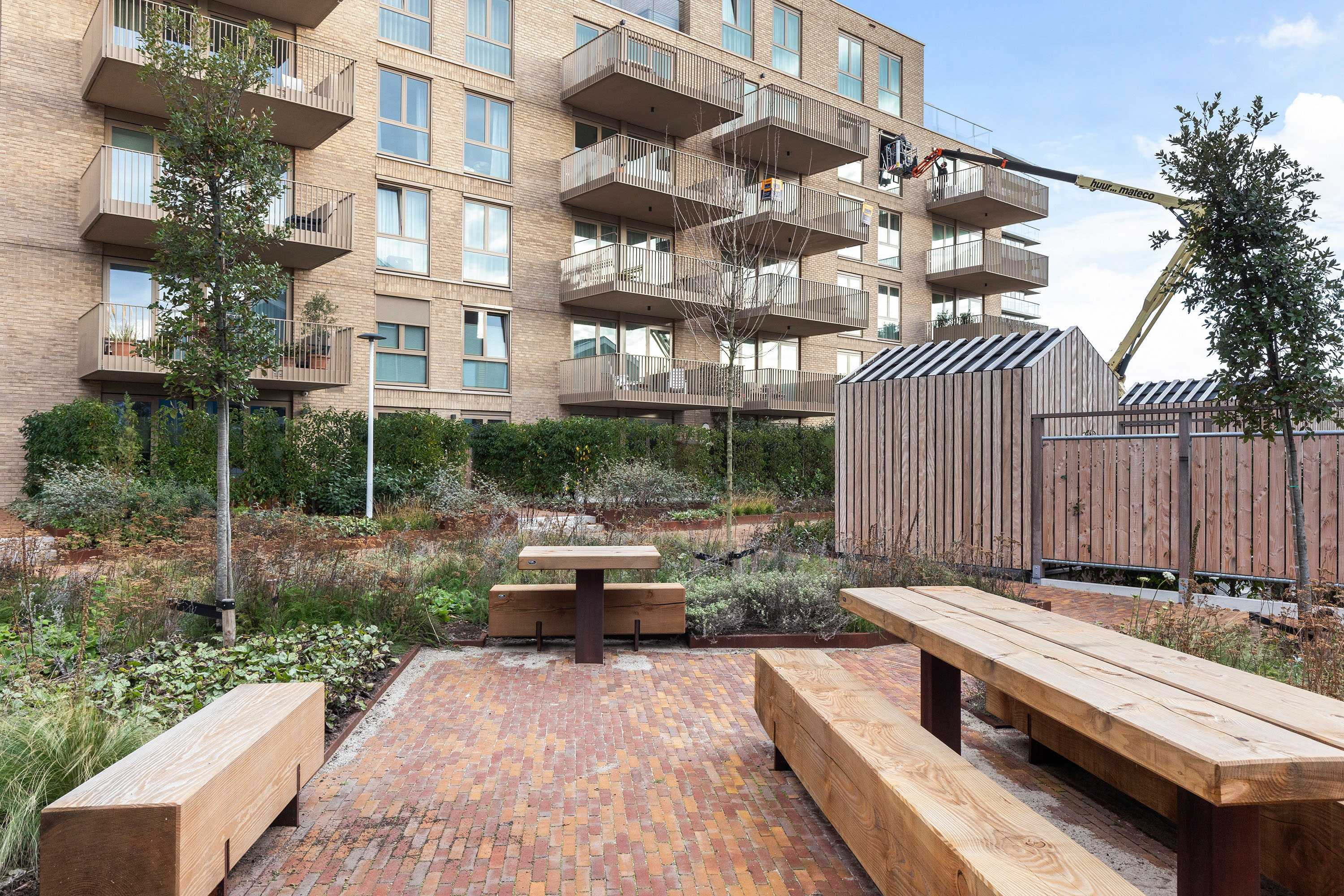 Two French doors open onto the sun terrace and private garden, ideal for morning coffee or summer evenings with friends. The garden borders the communal courtyard, offering a green and serene outdoor experience rarely found in an apartment setting.