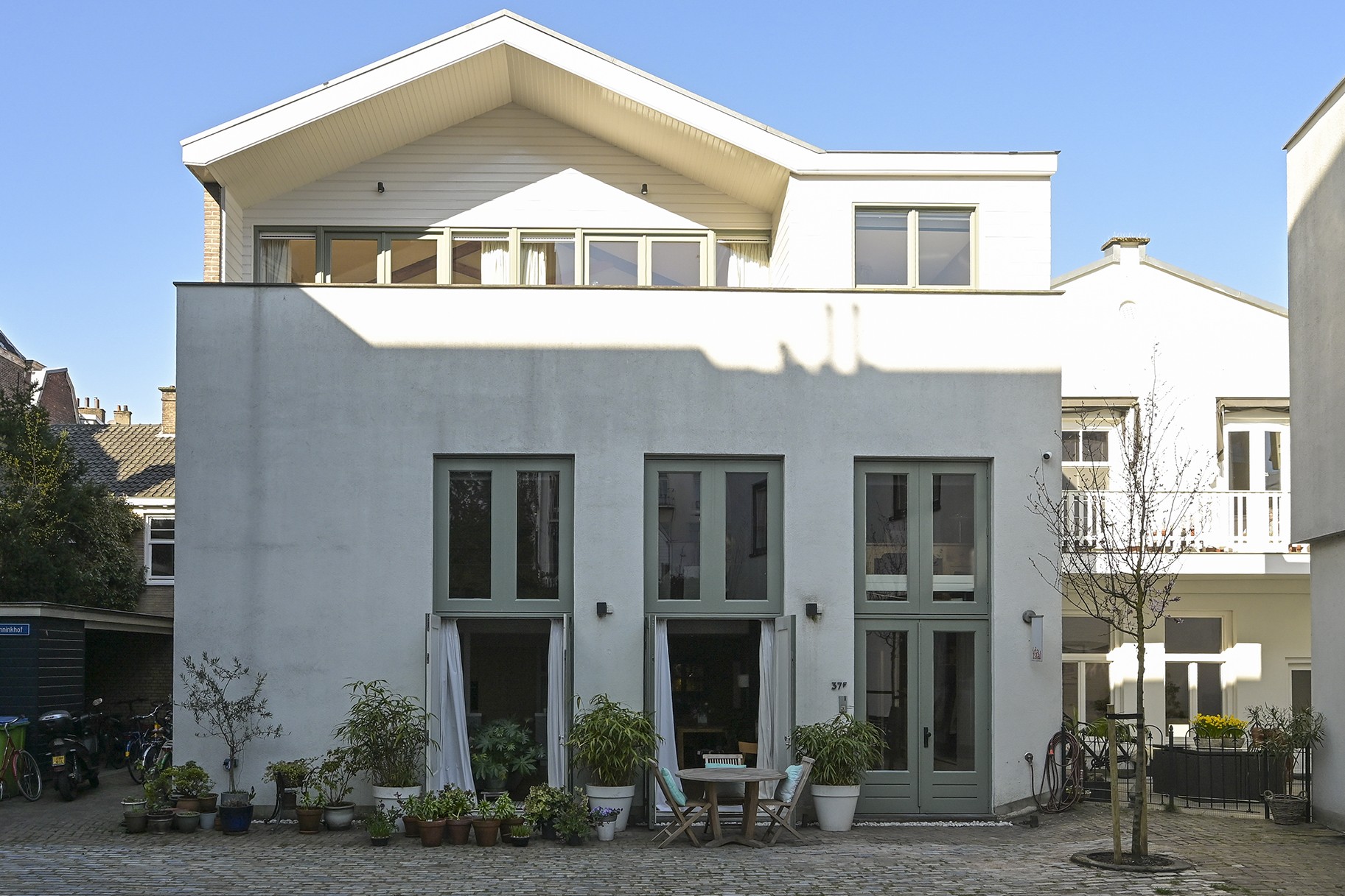 Achter de historische gevel bevindt zich deze royale en lichte woning welke beschikt over drie ruime slaapkamers, twee moderne badkamers en een indrukwekkende living van ca. 70 m². De hoge plafonds en de open vide versterken het gevoel van ruimte. Openslaande deuren naar de binnenplaats met eigen terras op het zuiden geven veel vrijheid en privacy. Heel veel privacy mede omdat ‘s avonds en in het weekend het toegangshek gesloten is.