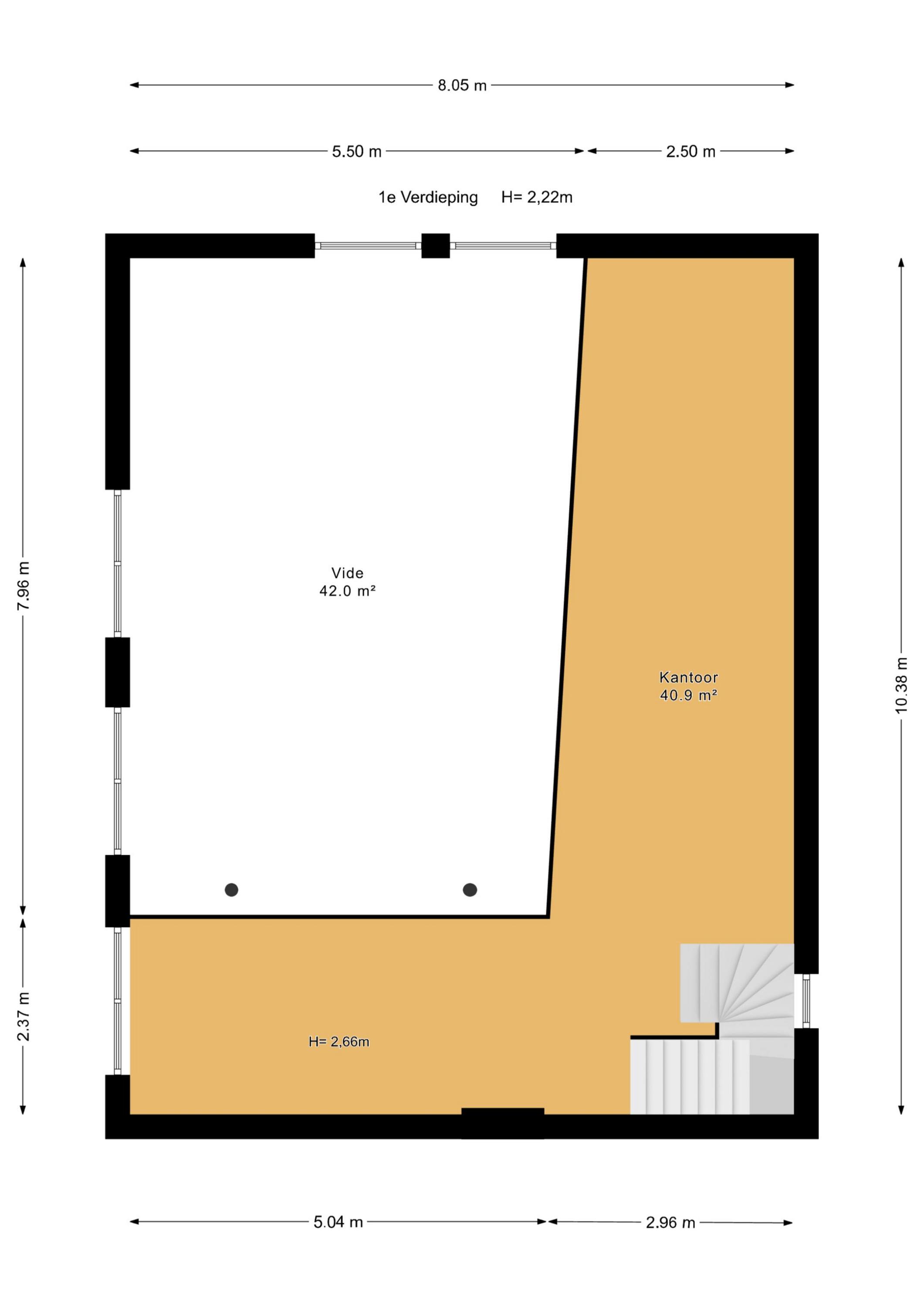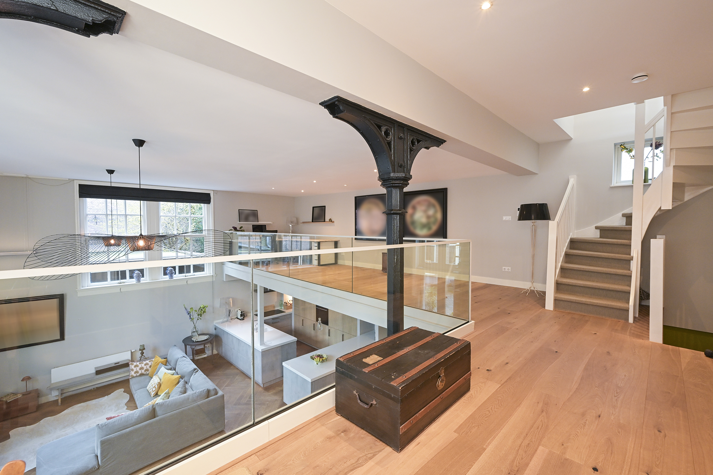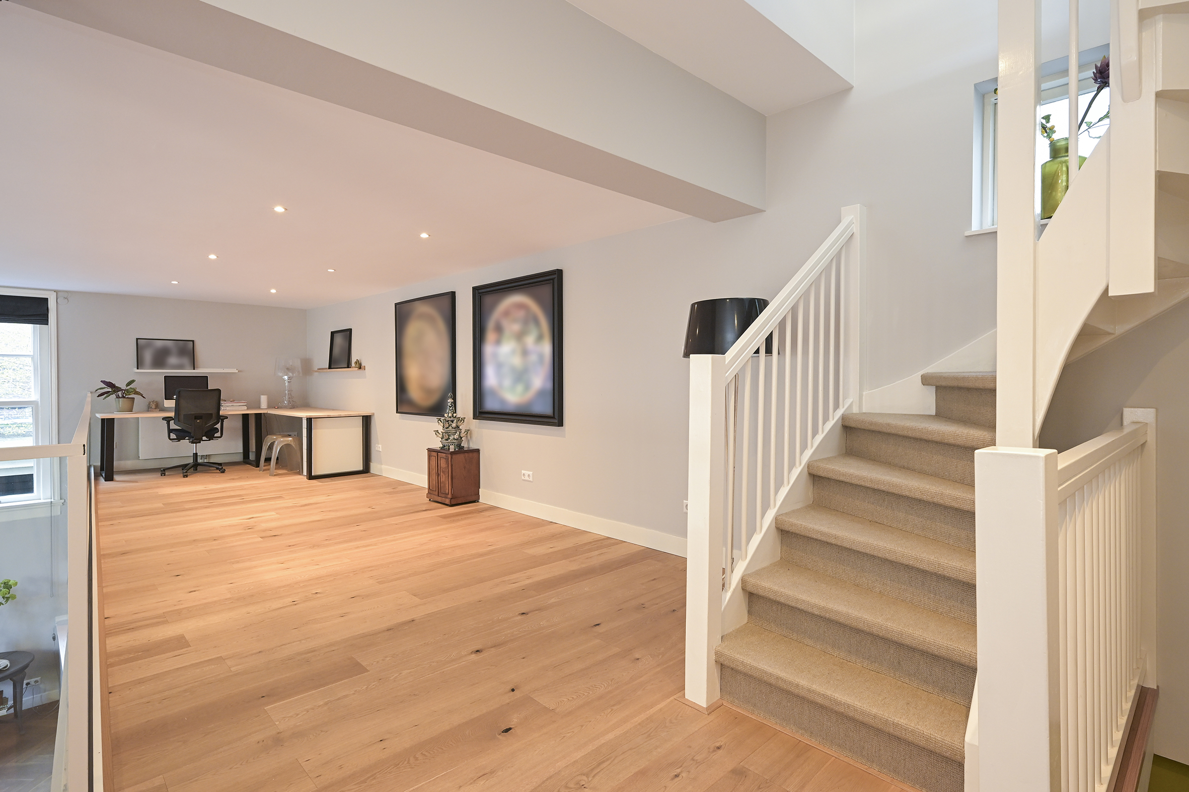 De 1e verdieping bestaat uit een grote L-vormige vide die op verschillende wijze kan worden benut. Thans zijn hier twee heerlijke lichte werkplekken gesitueerd maar mocht men behoefte hebben aan extra slaapkamers dan kunnen deze hier worden gecreëerd.