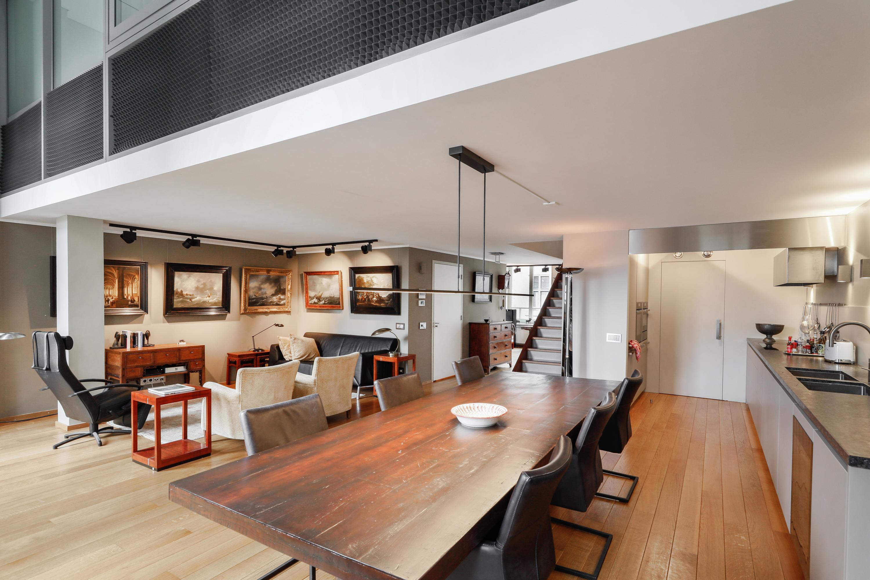 It's quite special to find this modern home behind the historic facade. During the renovation/reconstruction, only the front facade remained. With the tall windows, that history still permeates your luxury apartment. And thankfully so. The ceiling height on the facade is still approximately 580 cm. Beautiful, and it allows light to penetrate deeply into your home. Where a loggia was planned in 2001, there's now a space that can be used year-round. So even on a summer day, it can be used as a loggia by opening the large, tall windows. A cozy seating area and the kitchen are located downstairs.