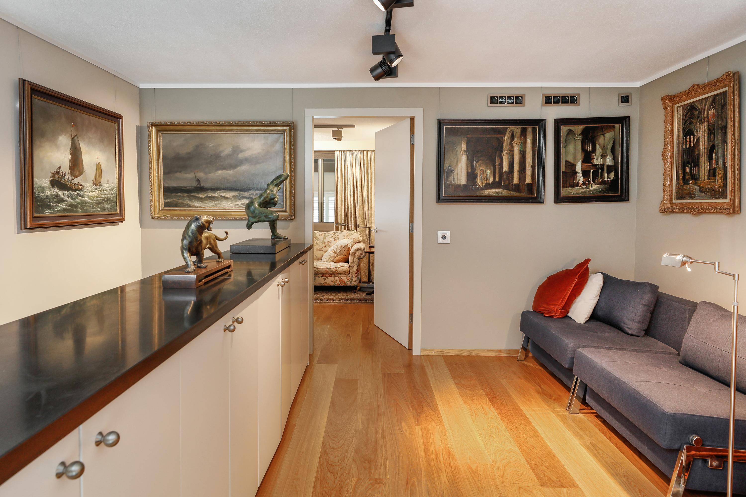 On the street side, you'll find the library. Here, too, a beautiful high ceiling. On a slightly cloudy day, it's bright here, but when the sun comes out, you'll be amazed. The abundant light can be tempered with wooden Jasno blinds. There's a beautiful classic fireplace with a bio-ethanol fire, connected to a central exhaust system via a damper. With a few adjustments, this library space could also be transformed into a fantastic bedroom. It's on the same level as the living area. But the house offers plenty of opportunities for long-term living for all ages and mobility levels.