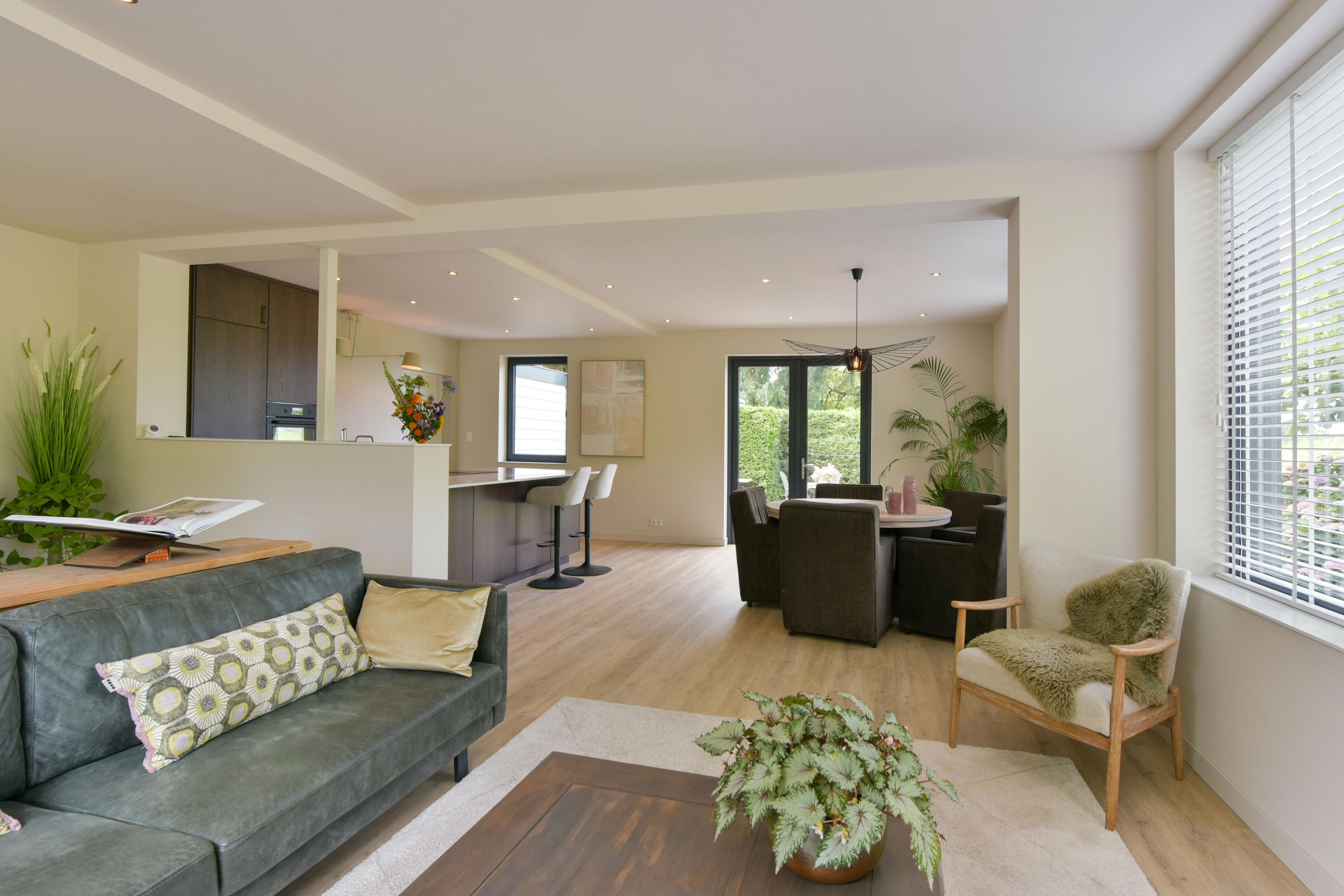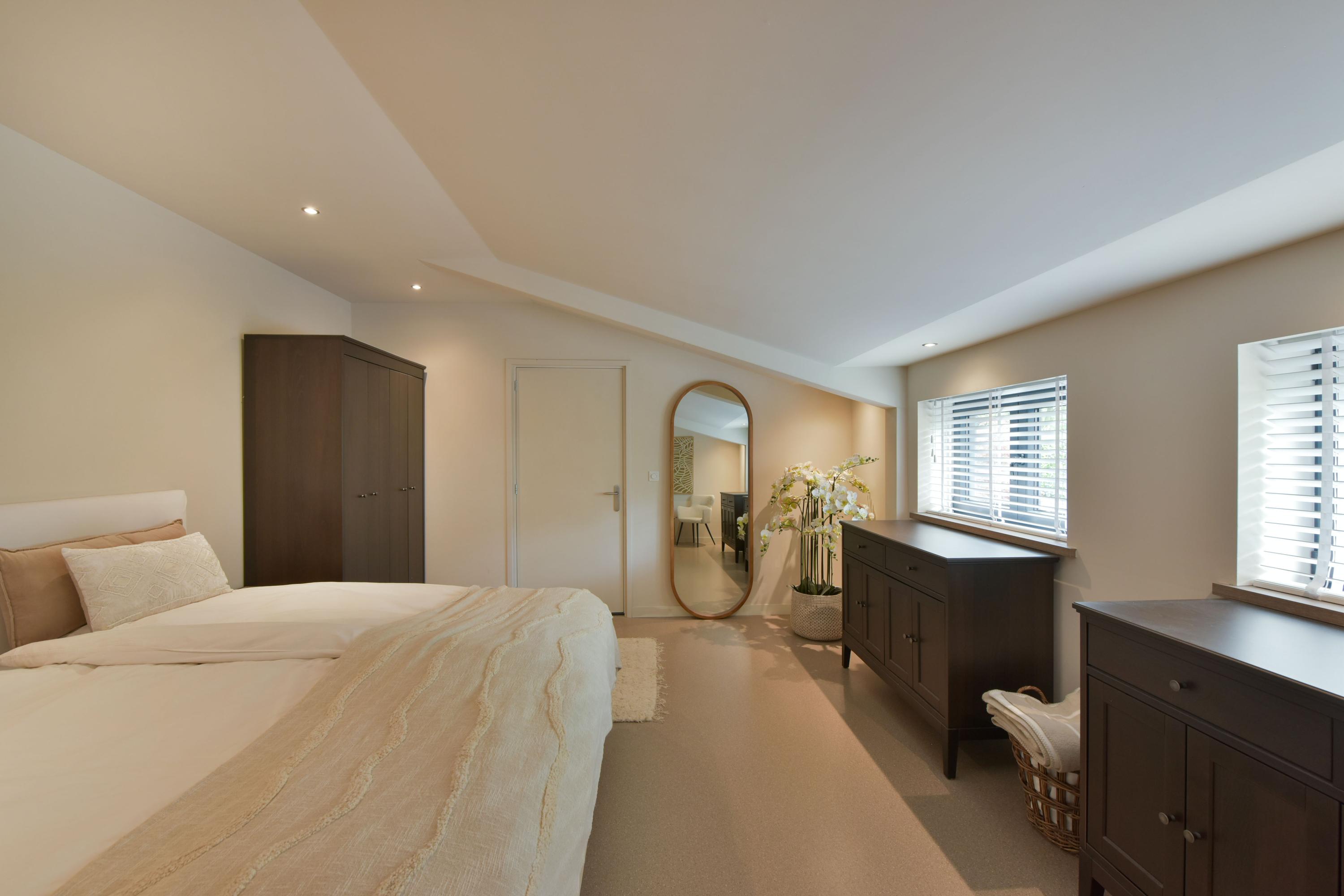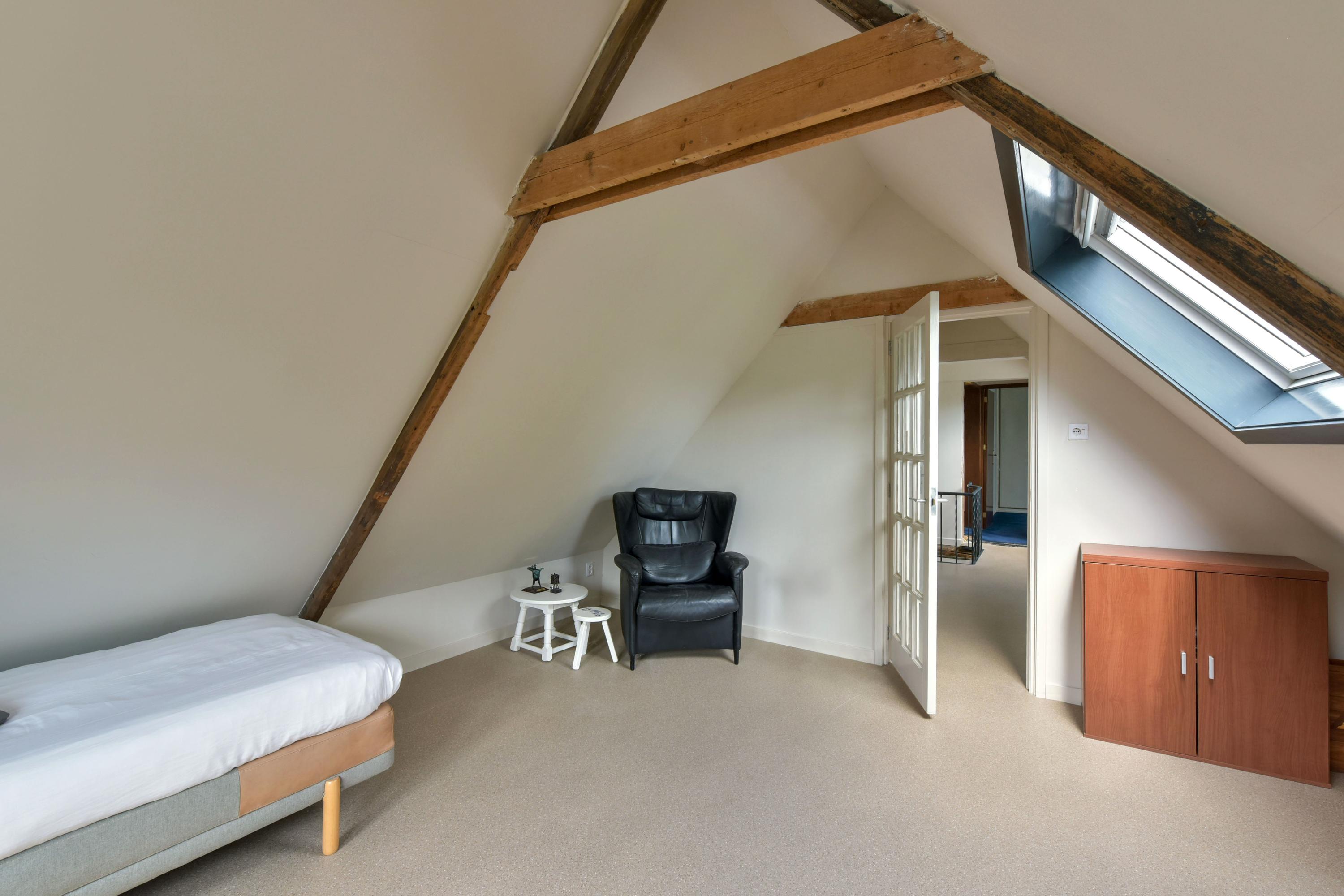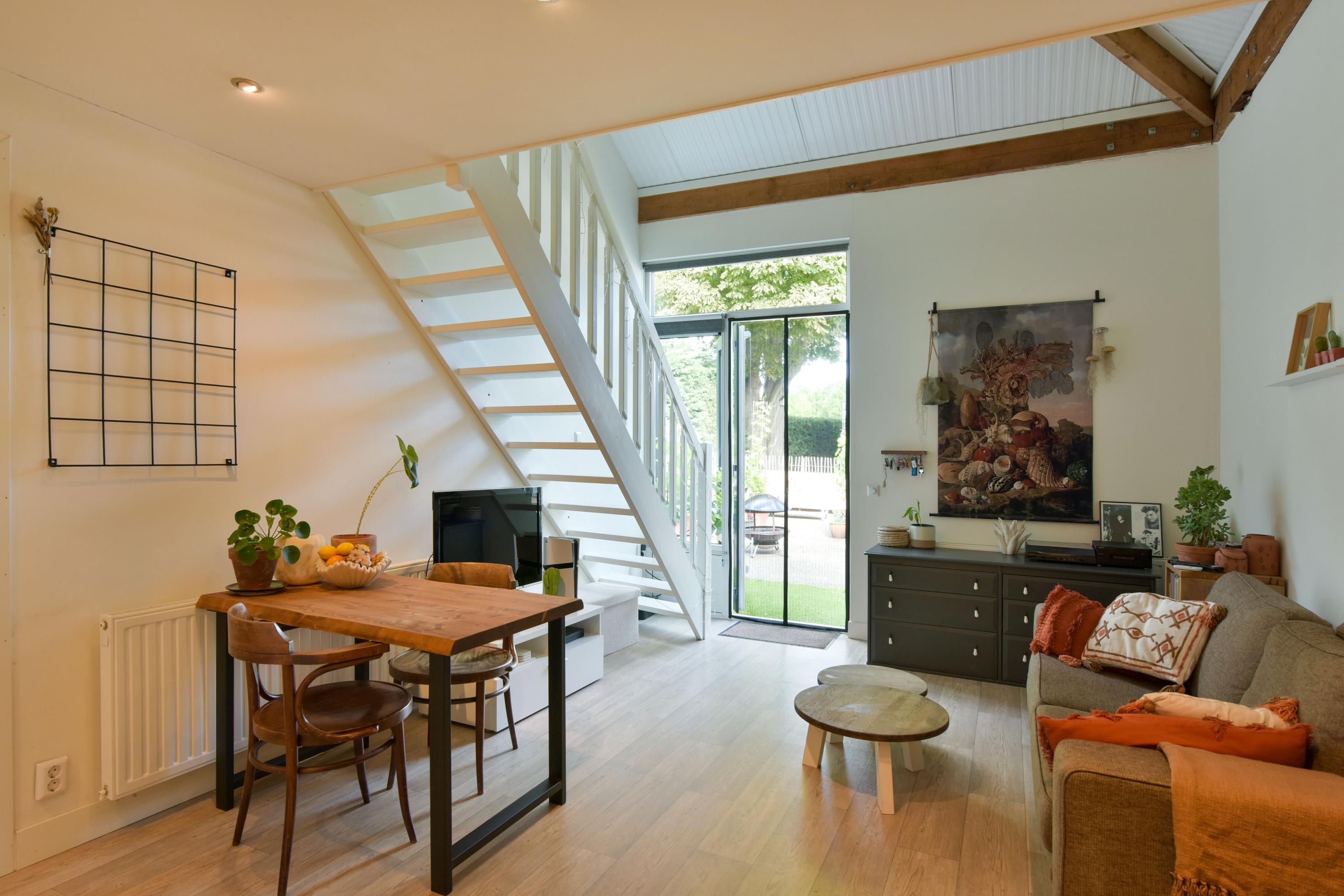 The ground floor has been recently modernised, with the bathroom renewed in 2024 and the kitchen updated in 2025. The spacious living room, featuring large windows and French doors opening onto the garden, forms the heart of the home. The modern kitchen with cooking island, high-quality appliances and bar area connects seamlessly to the living space. In addition, there is a bedroom with en-suite bathroom, a multifunctional room prepared for an additional bedroom or bathroom, and a utility room with access to the veranda and an additional storage area.