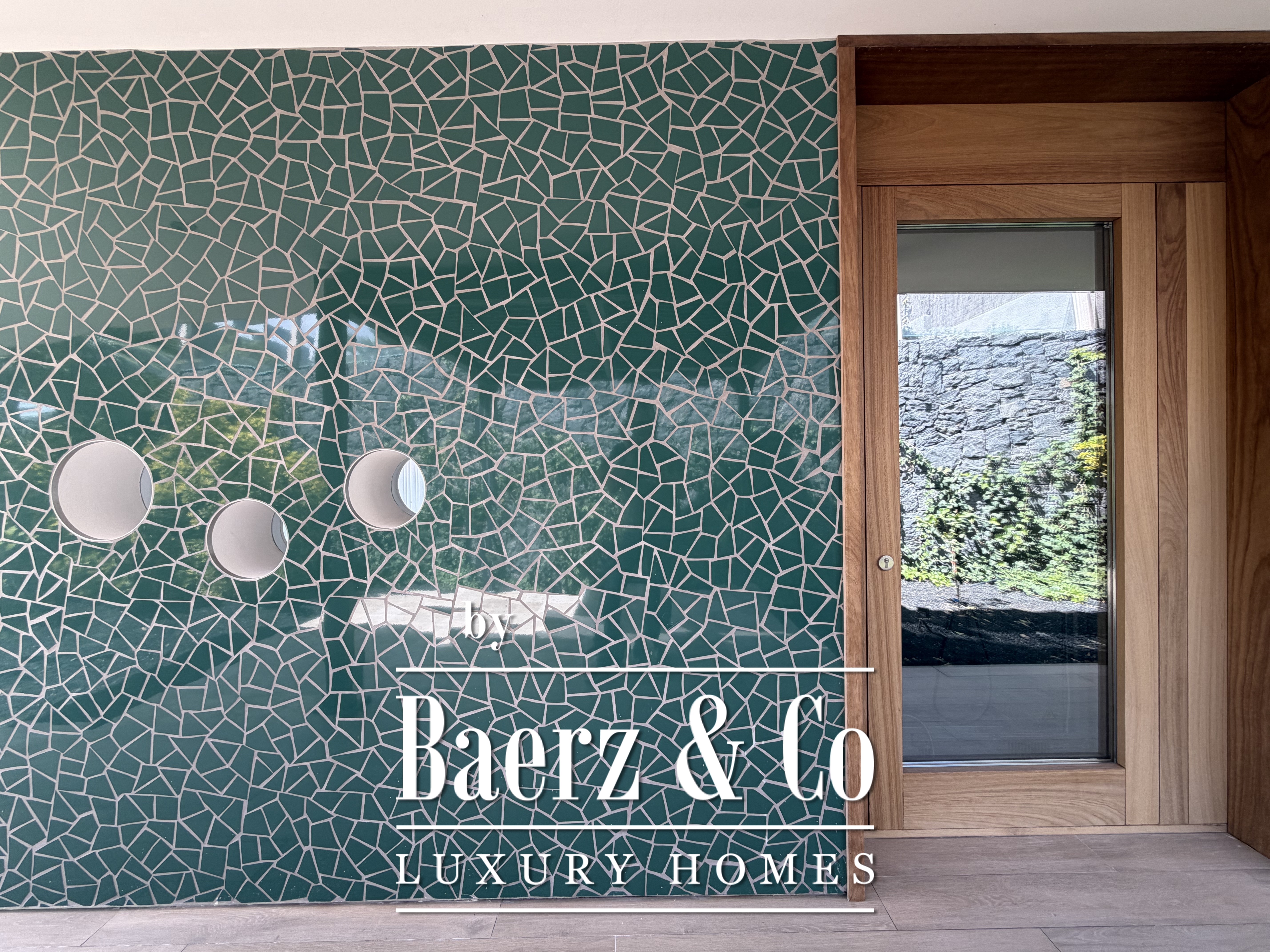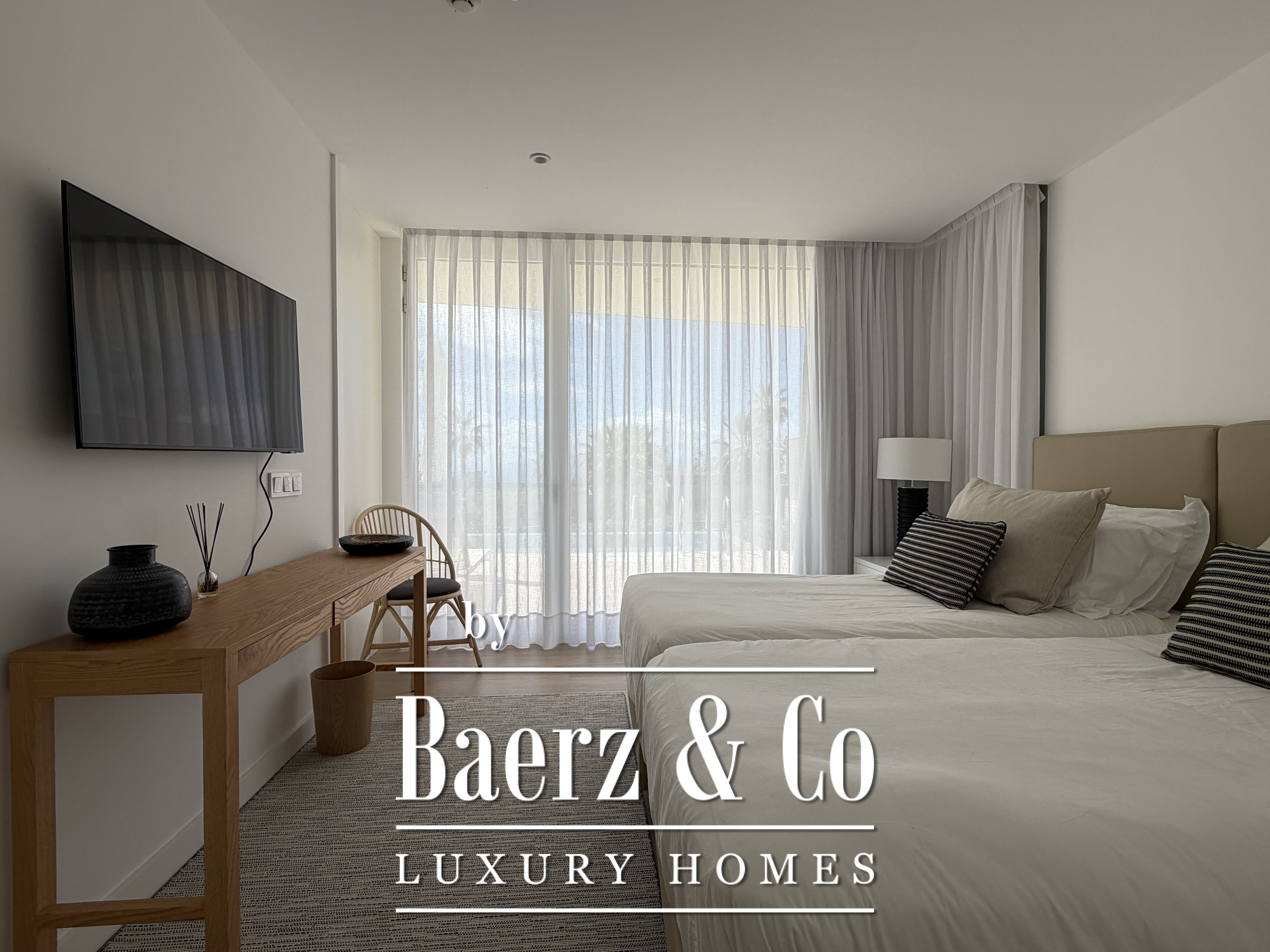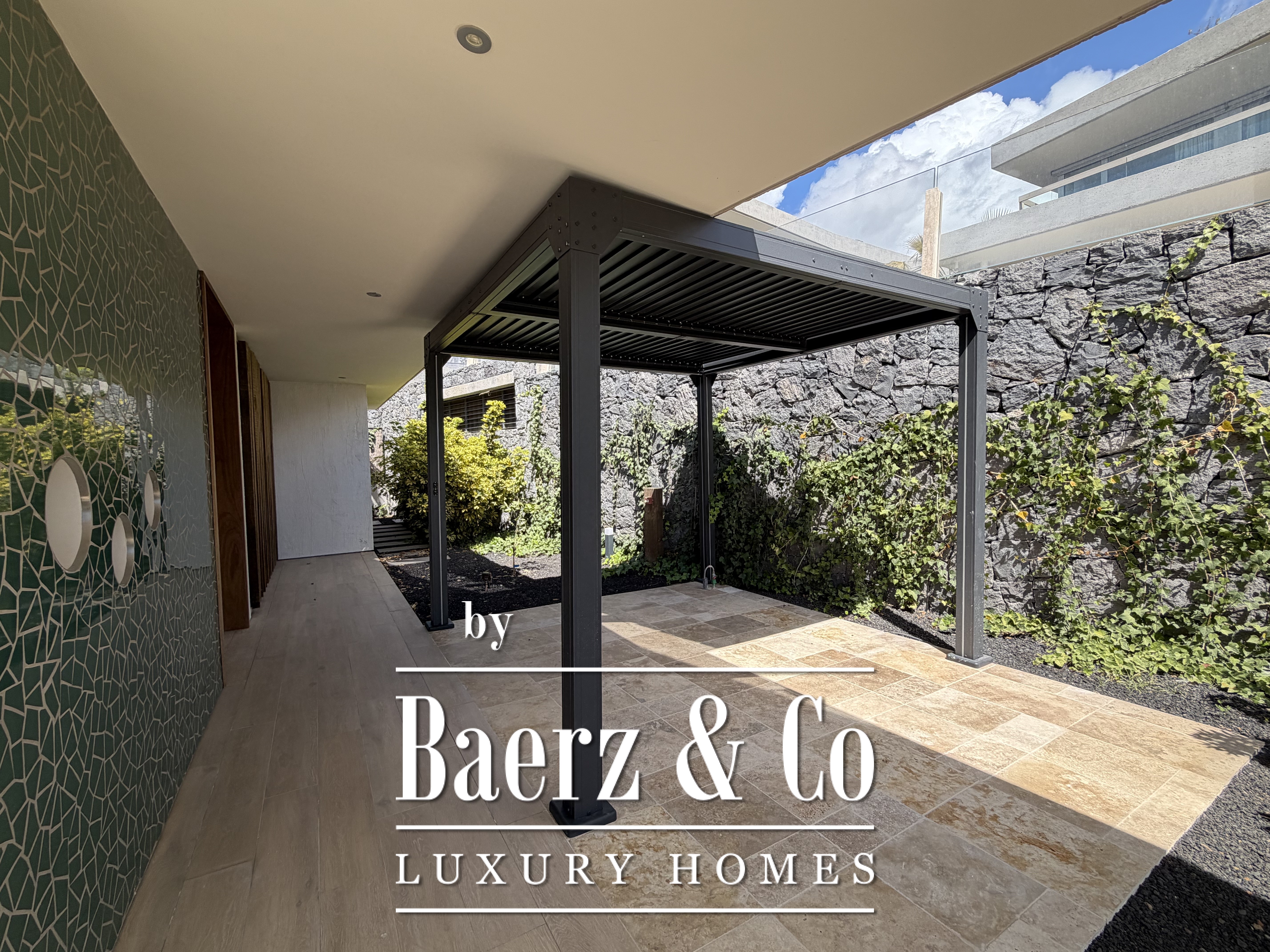 Natural light fills the interiors through expansive windows, framing the horizon and creating seamless access to the terrace and landscaped garden. Three bedrooms offer dressing rooms, while two bathrooms feature modern showers, underscoring the emphasis on refined functionality. The bright living room invites relaxation, whether enjoying a quiet moment or sharing the space with guests.