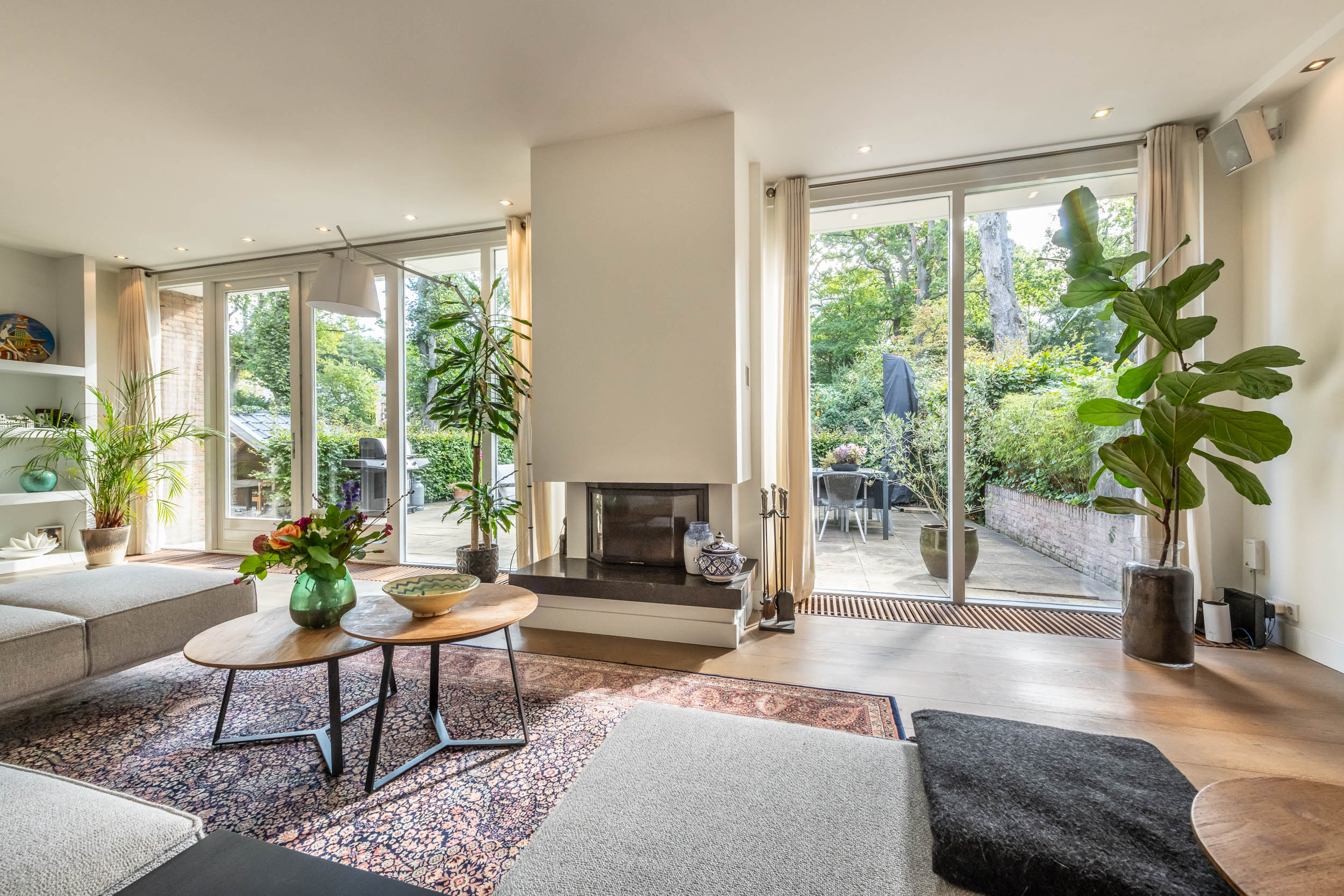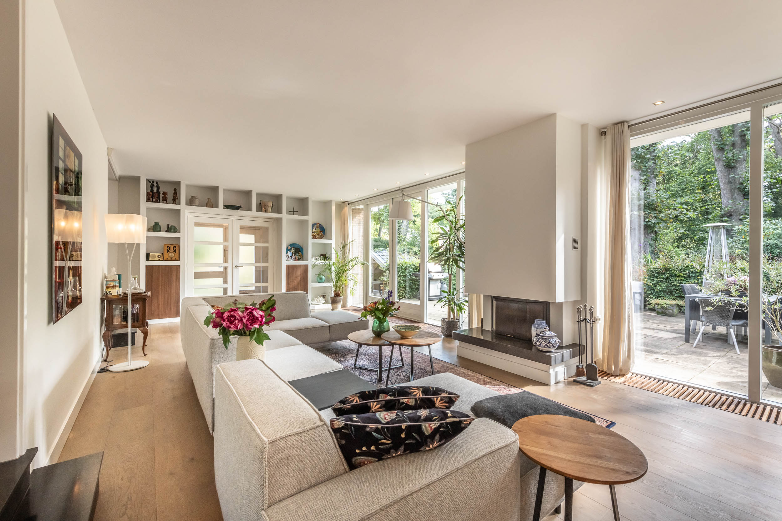 Entrance hall, spacious hallway with toilet and urinal, bright and spacious living room with fireplace, oak flooring and doors to the front terrace. A double door connects to the second living room/TV room with large windows and a view of the back garden. Luxurious, tailor-made kitchen-diner (’t Spant in Heemstede, 2022) featuring underfloor heating, a sink/kitchen island and various built-in appliances: wine climate cabinet, ovens, Quooker with sparkling water feature, coffee machine, Bora electric hob with flex zones and dishwasher. Door to the side garden.
