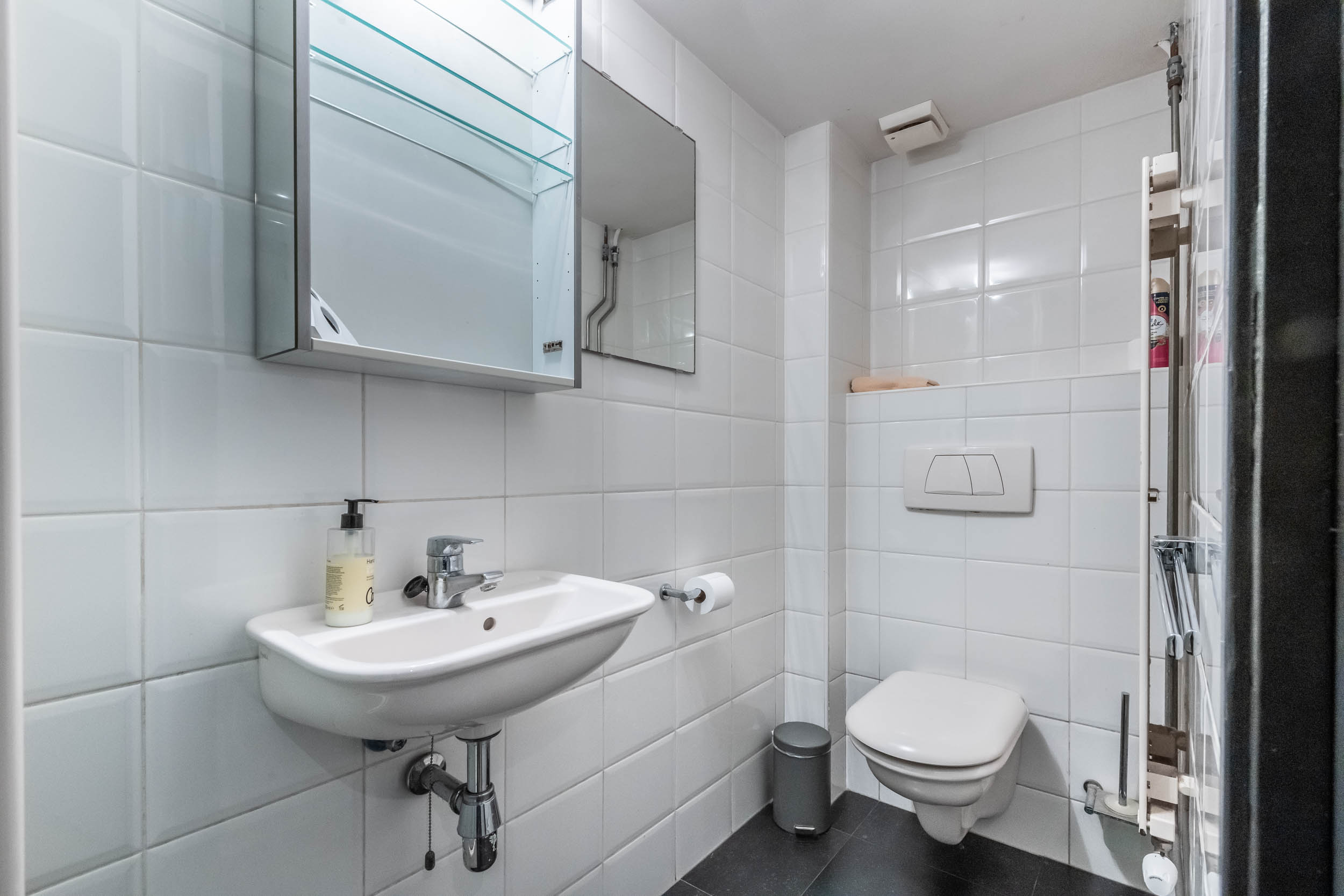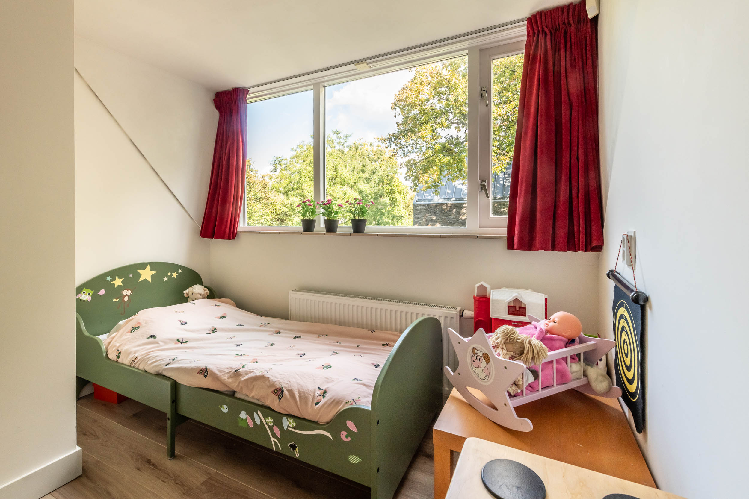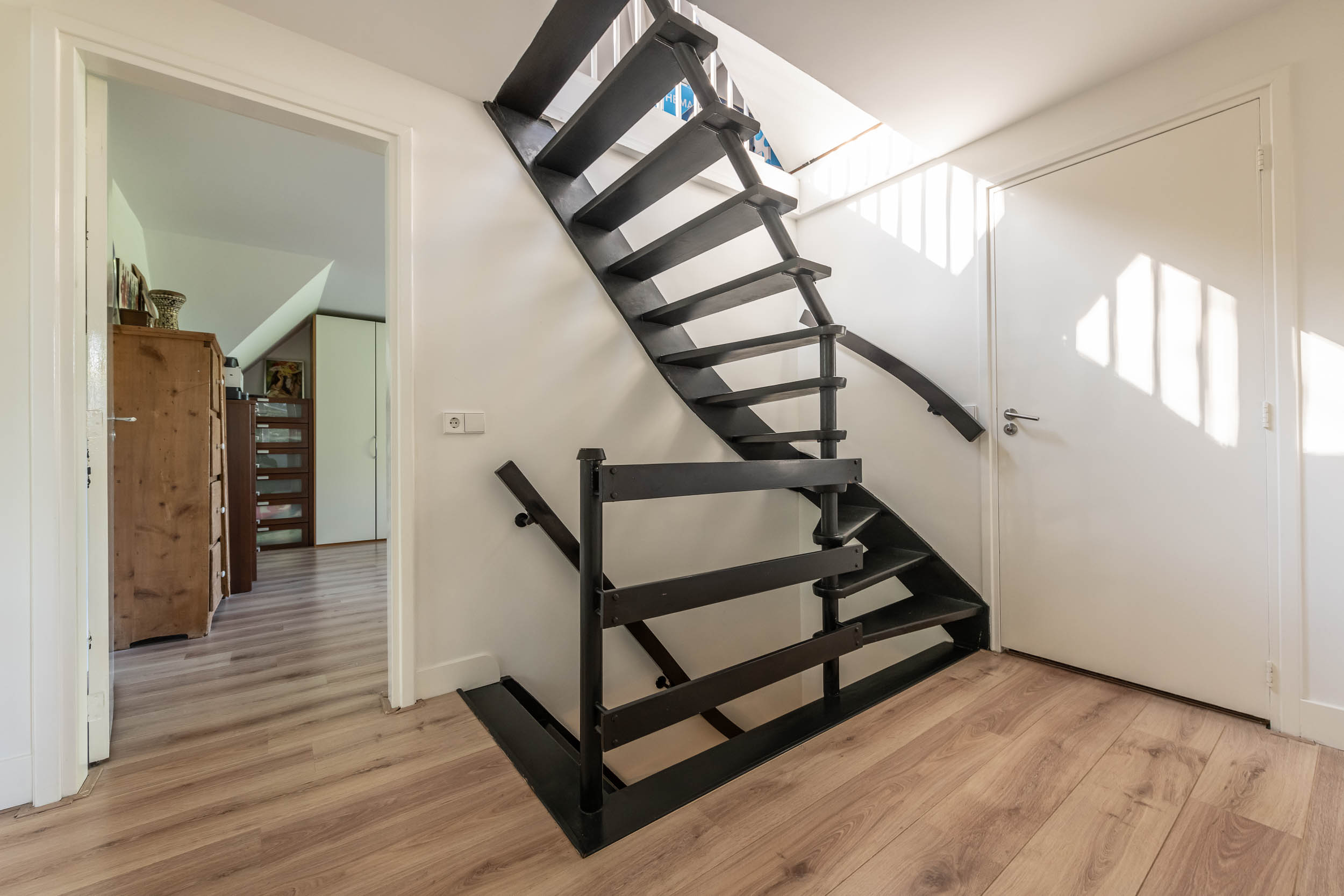 Landing, three bedrooms, including the spacious master bedroom (formerly two rooms) with walk-in wardrobes on both sides. Modern, tailor-made bathroom (’t Spant in Heemstede, 2022) with large dormer window, double washbasin unit, toilet, ample cupboard space, underfloor heating, freestanding bathtub, walk-in shower with Sunshower and hand shower.