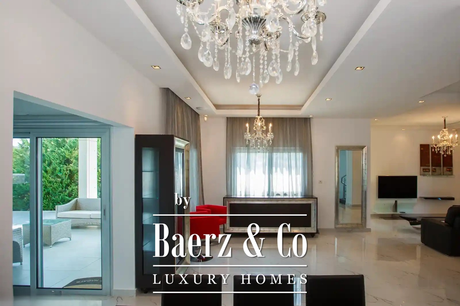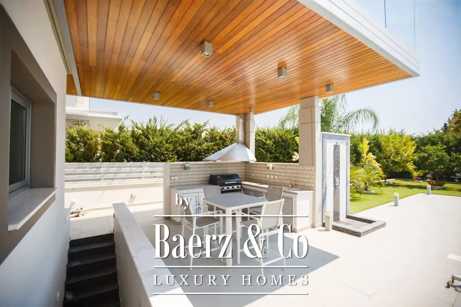 Villa Agios Tychonas includes an alarm system, CCTV, security door, laundry and storage areas, and covered parking. Fully furnished and equipped, the villa is only 1,000 meters from the sea and set in one of Limassol’s most desirable neighborhoods, balancing high-end amenities and discreet luxury.