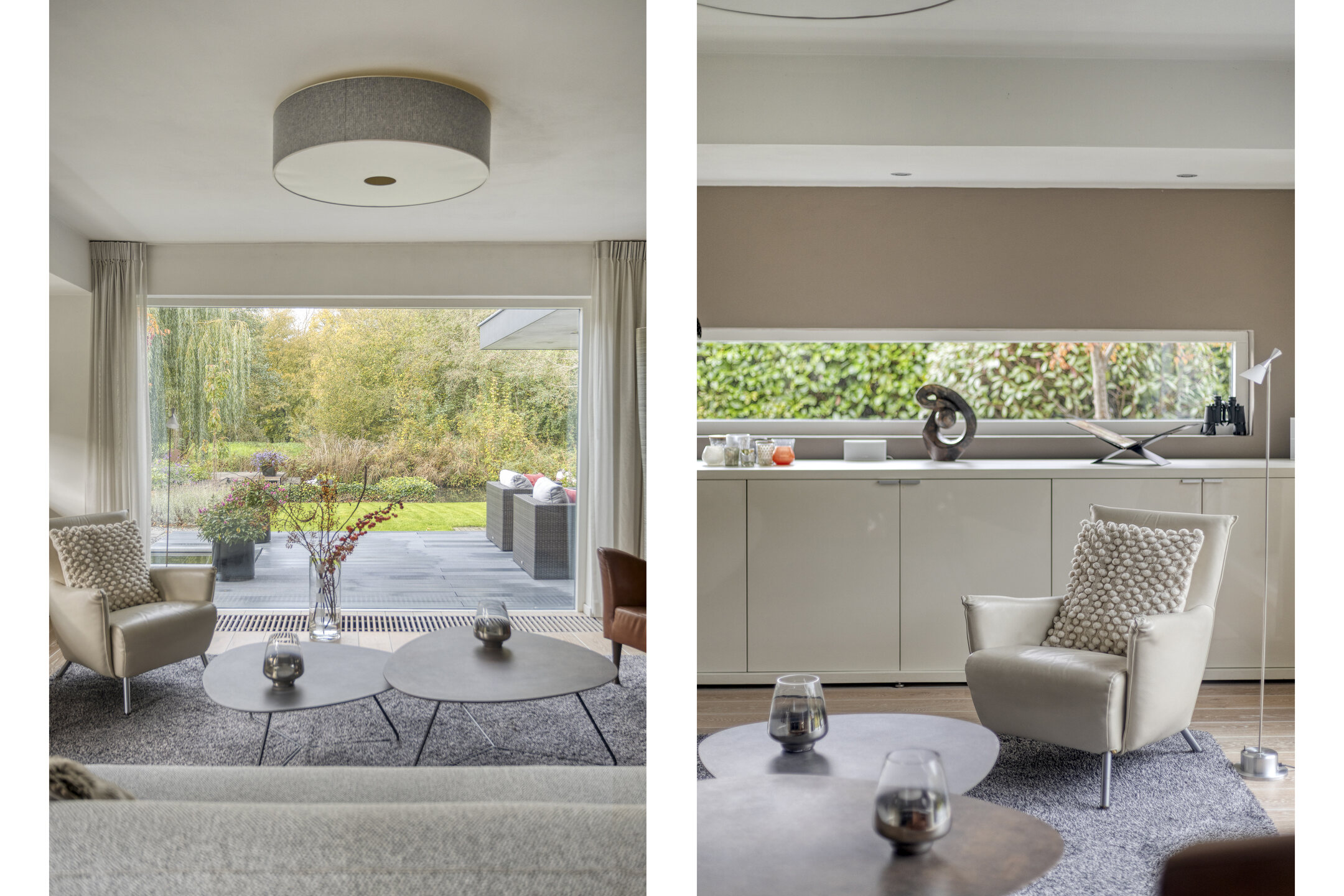 Upon arrival, a spacious hallway opens to oak floors and clean-lined glass doors. The living room and kitchen-diner are divided by a Bellfire double-sided fireplace, anchoring the space with quiet warmth. A luxury kitchen, outfitted with top-grade appliances and a Belgian bluestone worktop, offers both function and ceremony for daily living. The rear façade, defined by expansive glazing, frames the garden’s rhythm and the protected landscape of Egmonderhout beyond.