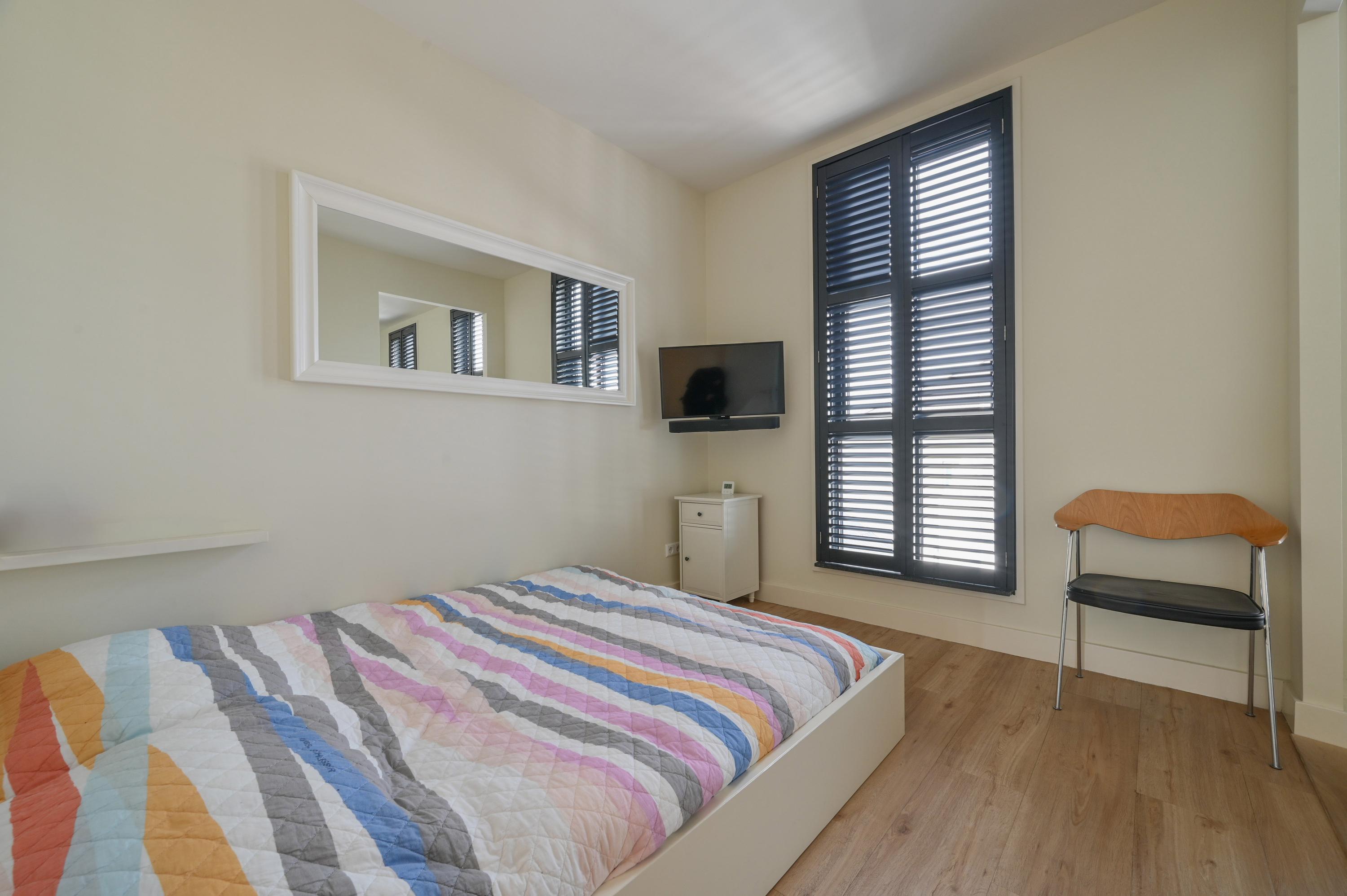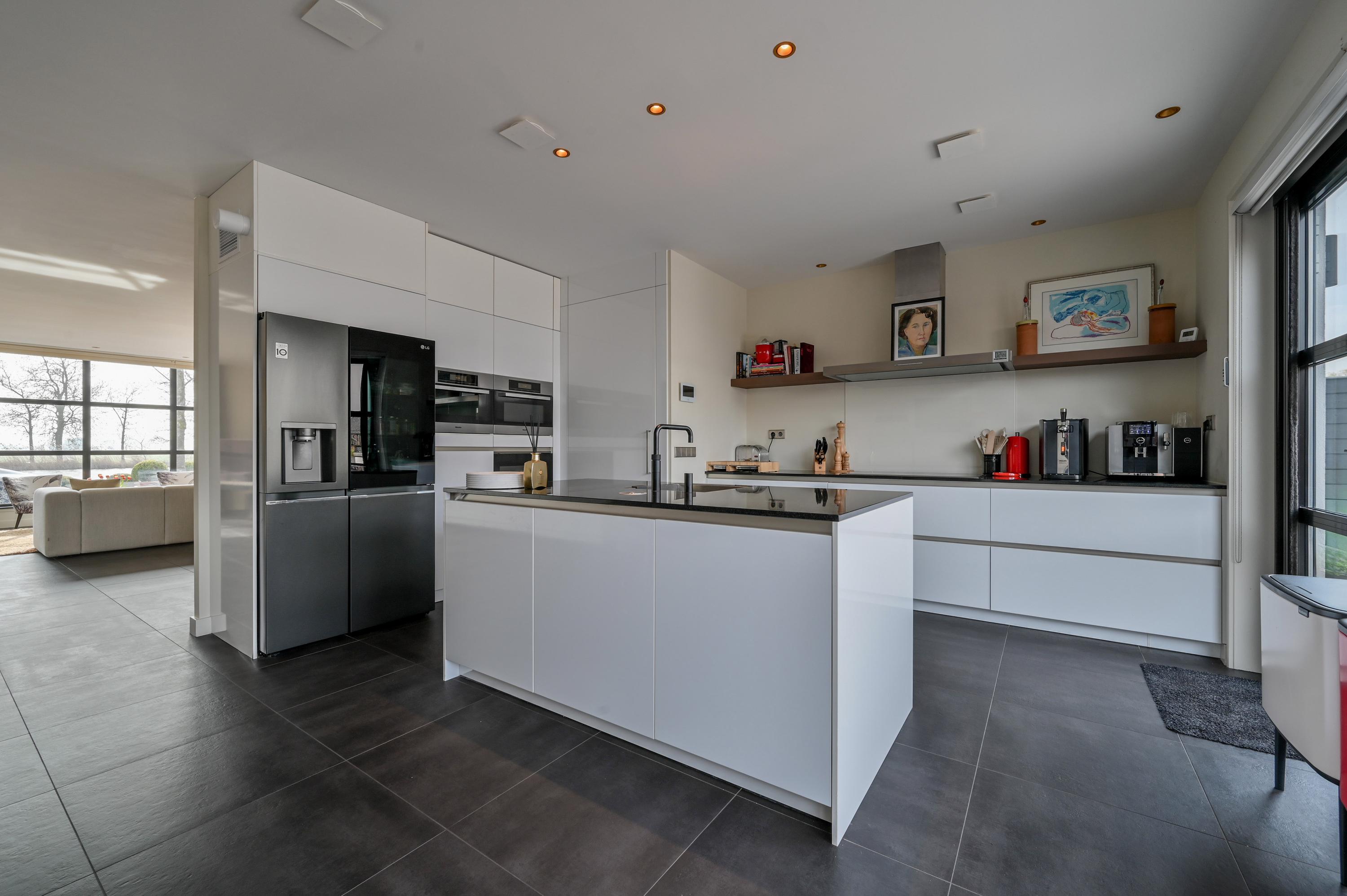 Via the driveway, you reach the front door and the spacious entrance hall, which features a wardrobe, toilet, and staircase to the upper floor. The living room is located at the front of the house and offers breathtaking views over the Amstel. Large windows allow an abundance of natural light to flood in, while the motorized curtains can be operated via an app. Luxaflex Silhouette blinds (motorized, with memory function) are also installed here. The stylish black tiled floor with underfloor heating, built-in dimmable Modular spotlights, and large custom-designed cabinets complete the space.