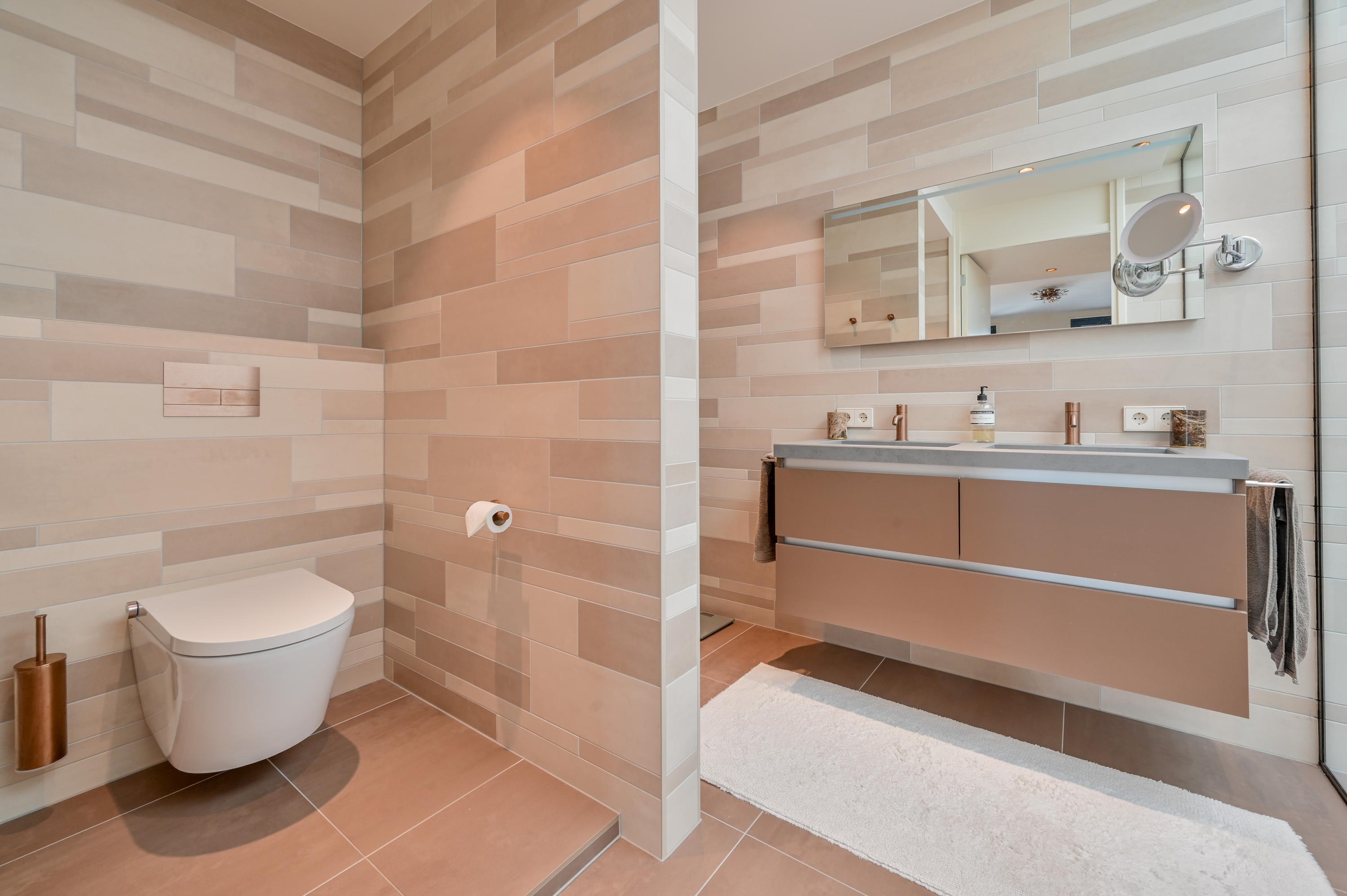 At the rear of the home, you will find the generous and luxurious open-plan kitchen, designed for both cooking and living. The kitchen features a central island with sink, a Quooker, dishwasher, combi ovens, induction hob with extractor, a large LG refrigerator with freezer and ice maker, a Liebherr wine climate cabinet, and extensive storage space. A built-in bench at the large dining table creates a cozy seating area, while double French doors provide access to the spacious terrace garden, where light, space, and tranquility come together.