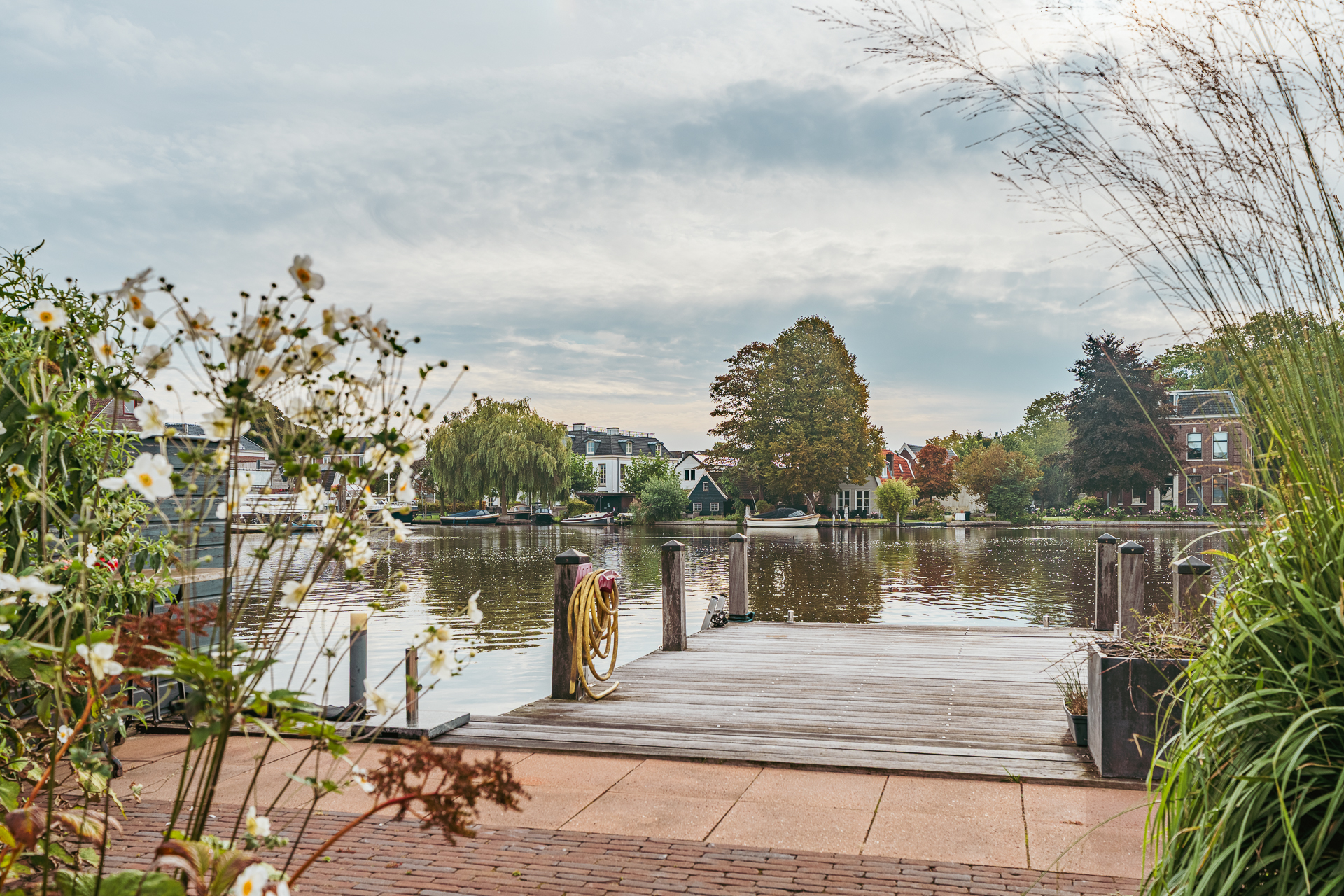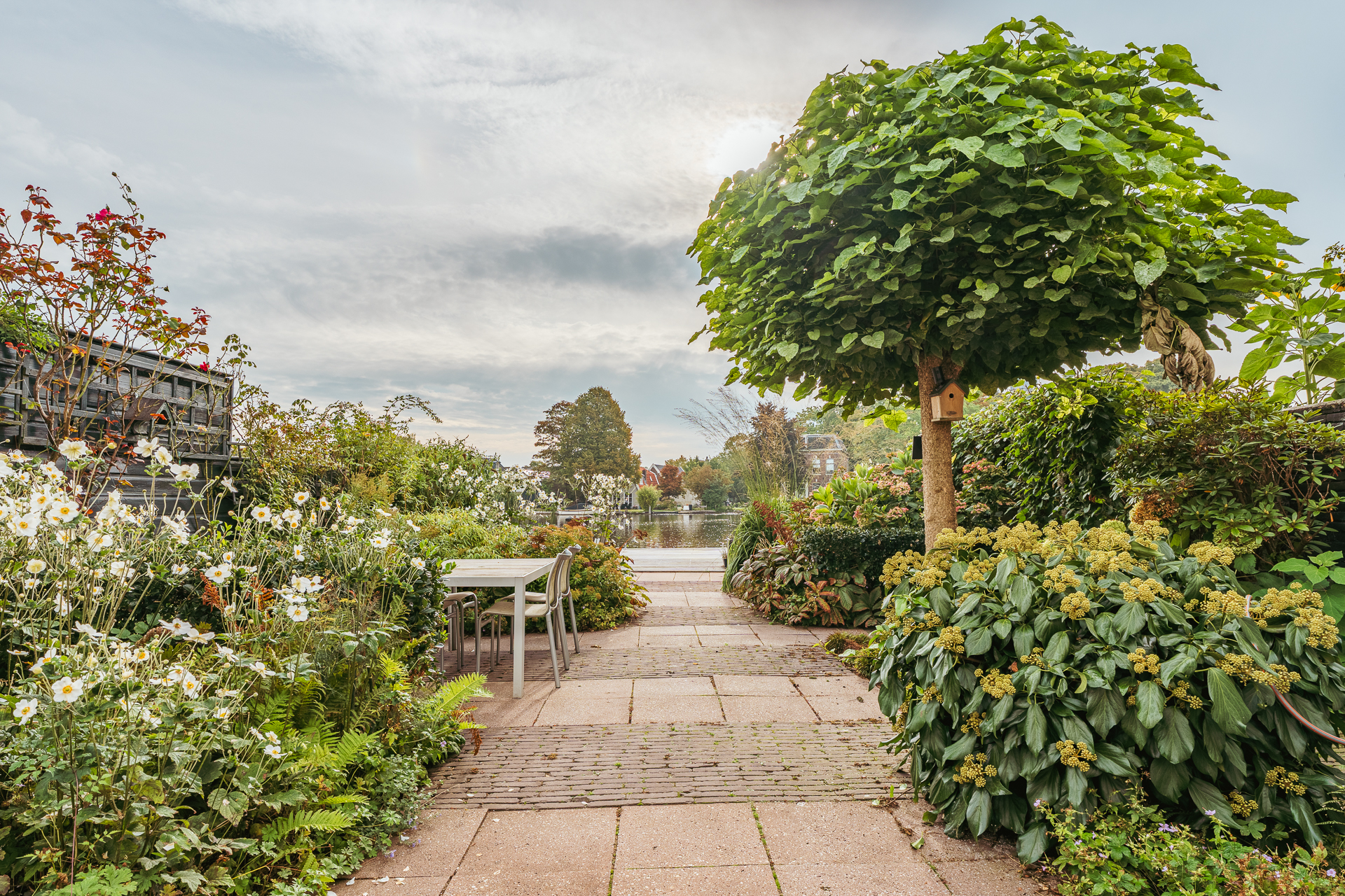 The rear garden is beautifully landscaped with lush greenery and features a private jetty on the Amstel. Here you can enjoy the peaceful setting and the unobstructed water views. The garden is also accessible via a private side entrance next to the house.