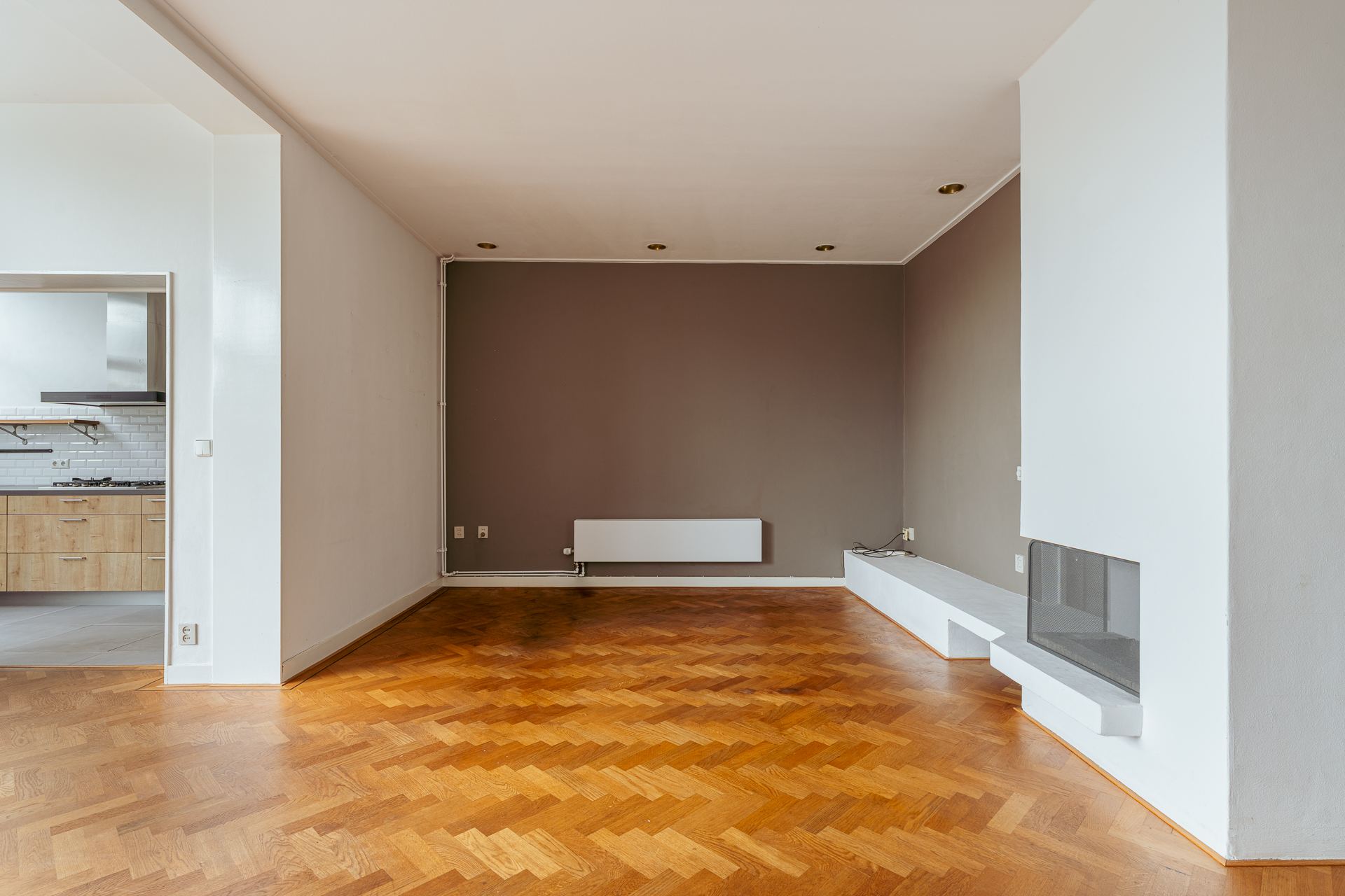 The generous living room spans the full width of the house and is distinguished by an elegant herringbone wooden floor and large windows with French doors to the garden. This provides the living room with abundant daylight and a stunning view over the rear garden and the Amstel.