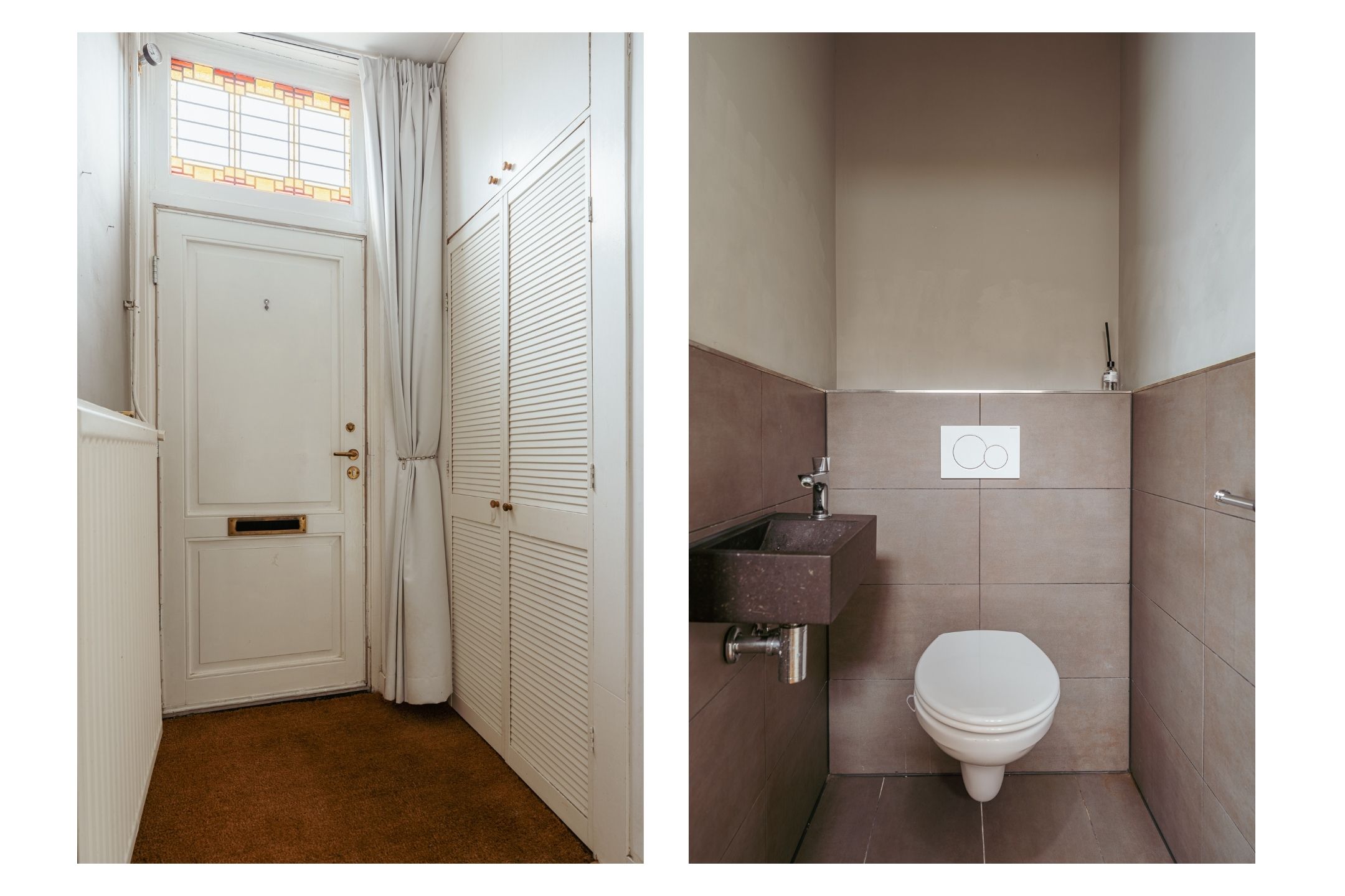Through the entrance on the low-traffic street side, you enter the hallway with wardrobe space and separate guest toilet with washbasin. From here, you access the room at the front of the house, which enjoys abundant natural light thanks to tall windows. This versatile space is ideal as an office or practice room and also benefits from its own (second) entrance.