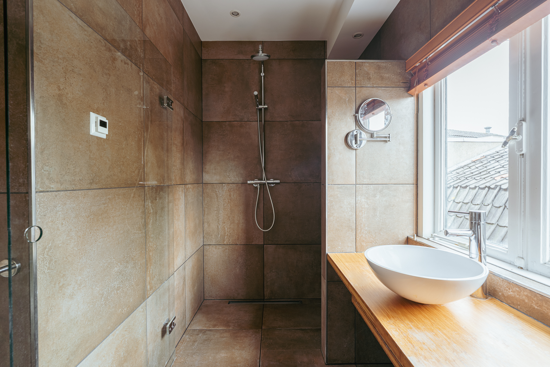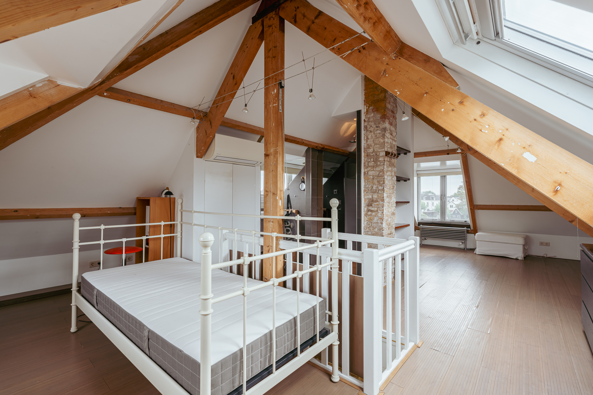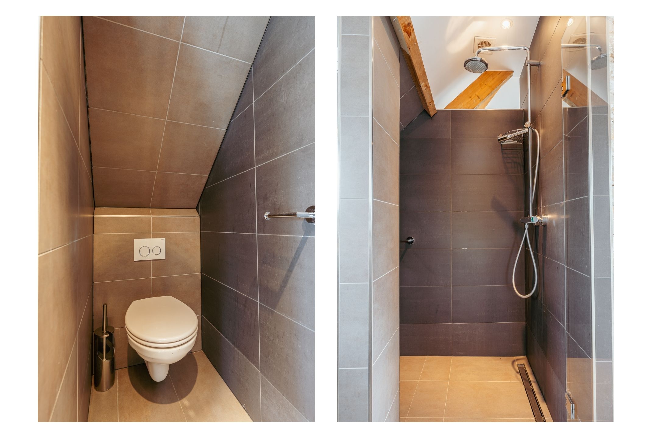 The top floor is an open space with a high ridge (over 3 meters) and large skylights and dormers, creating a bright and airy atmosphere. A second modern bathroom is located here, equipped with a walk-in shower, washbasin cabinet, underfloor heating, and a third toilet. This level also benefits from air conditioning, offering year-round comfort. The authentic exposed beams combined with modern finishes give the space a distinctive character. If desired, this floor can easily be divided into two separate bedrooms.