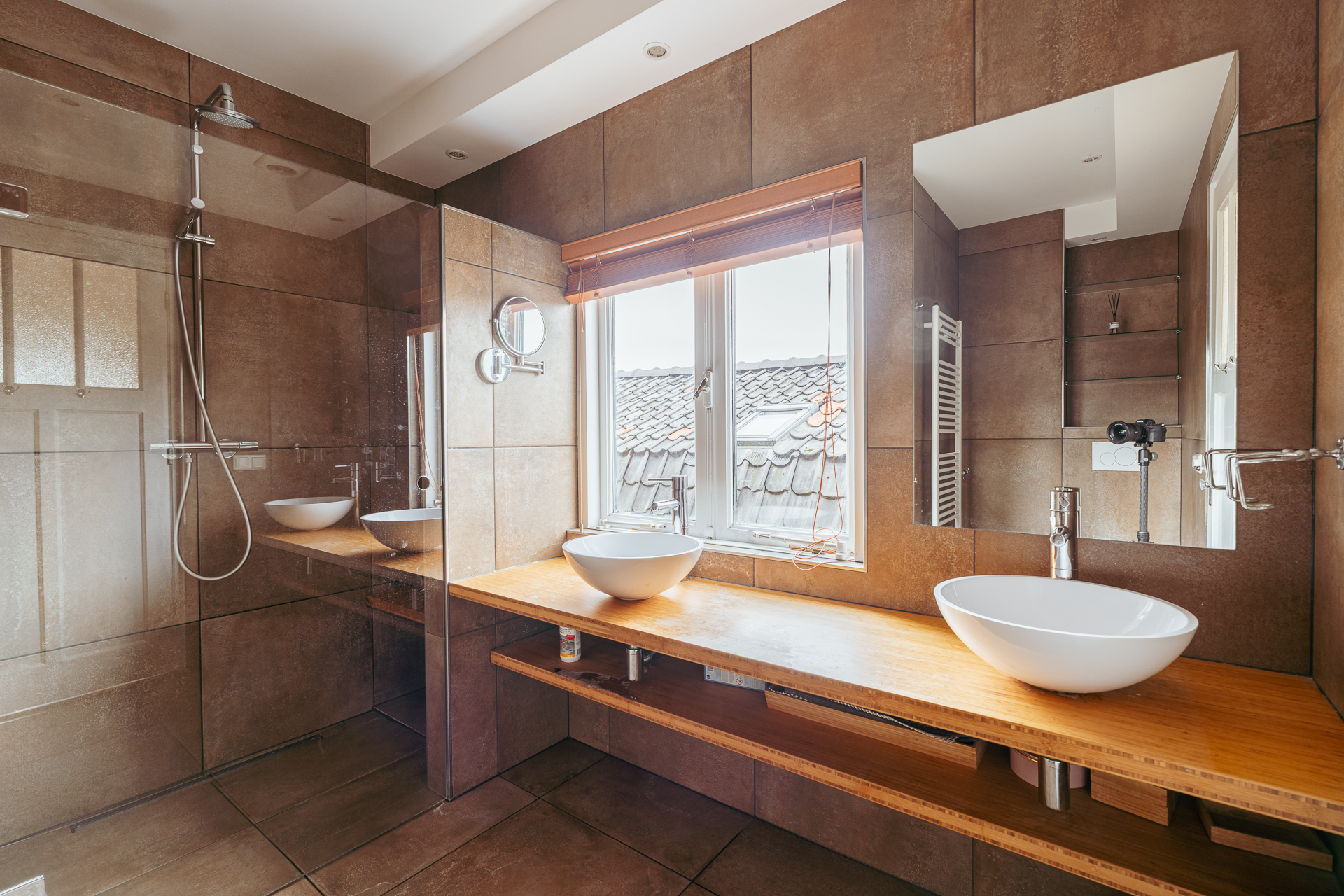 The bathroom is fitted with a walk-in shower, double washbasin with wooden cabinet, and a second toilet. A window provides natural daylight and ventilation. The bathroom also features underfloor heating.