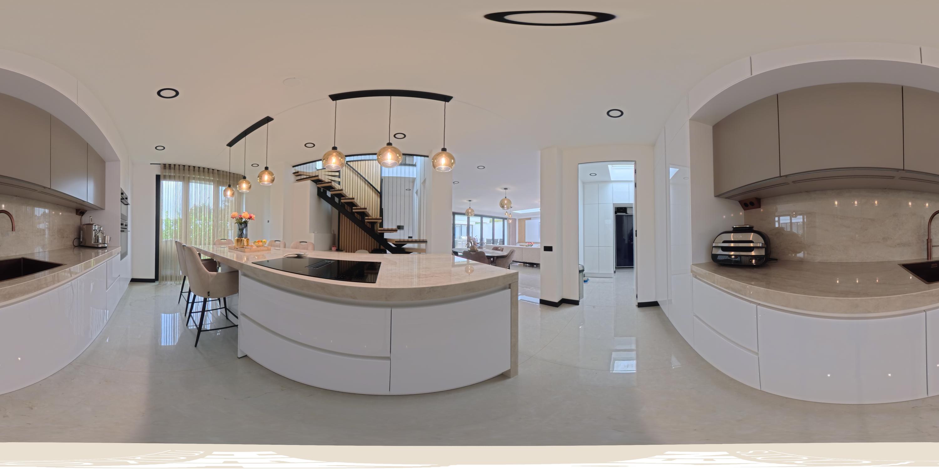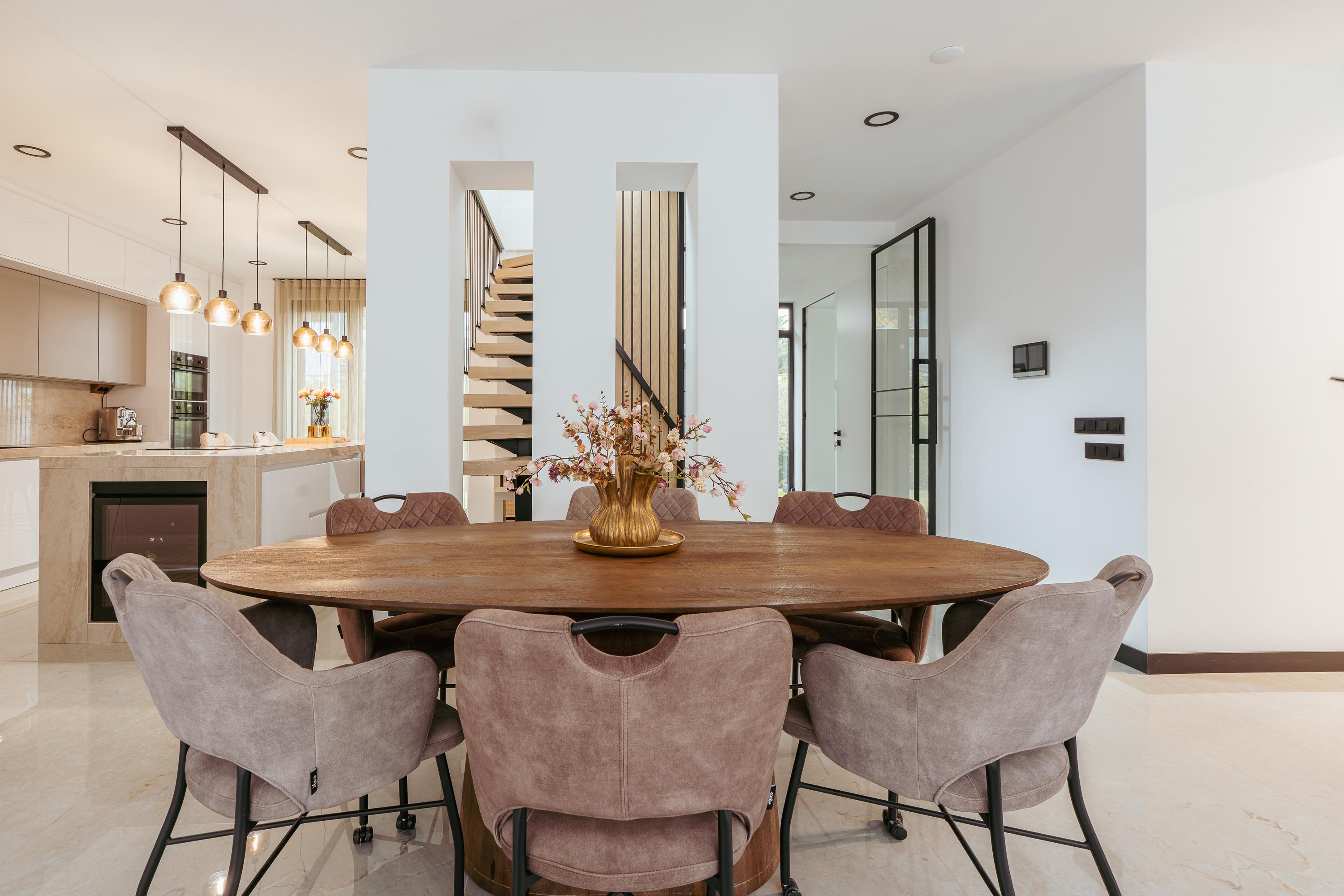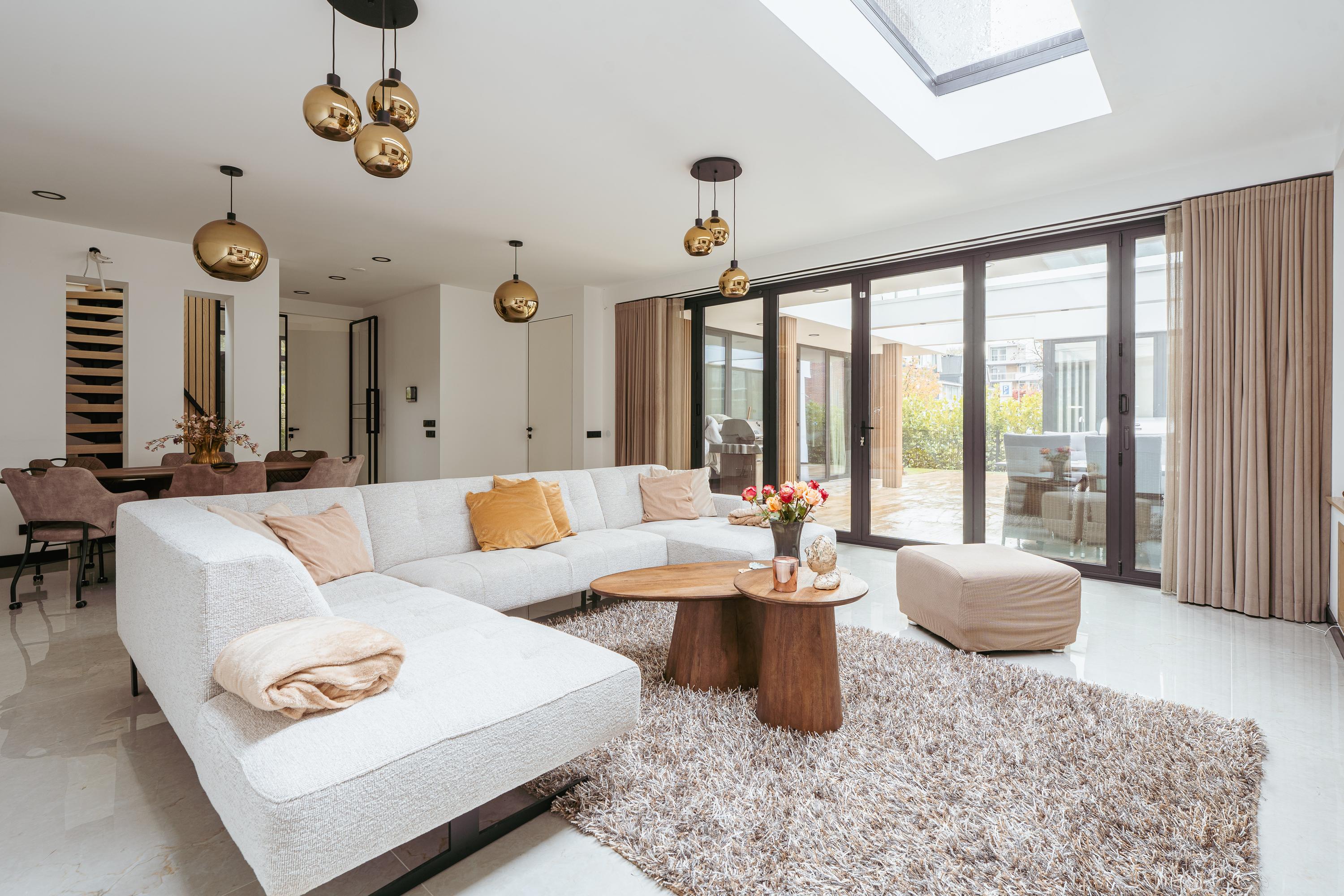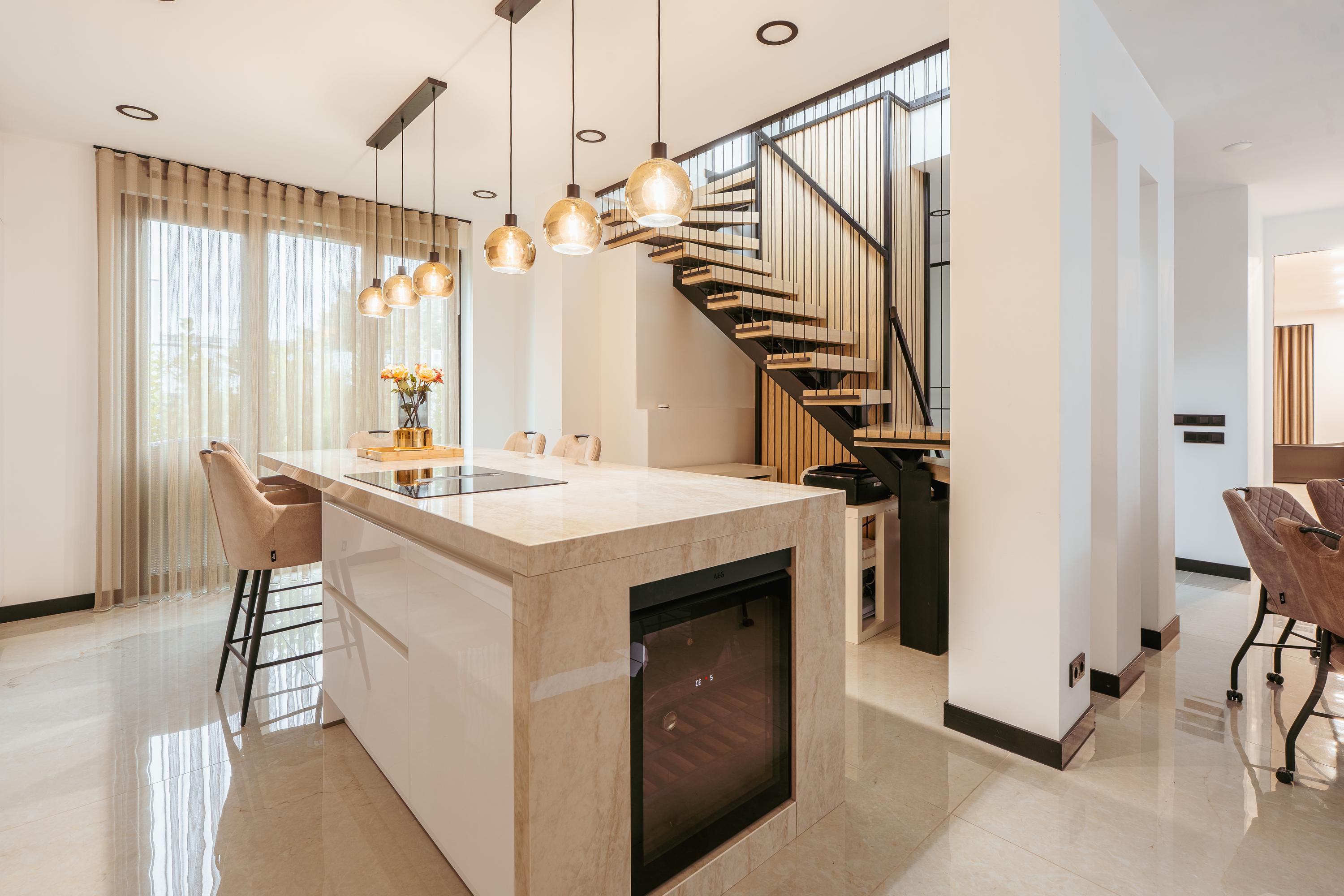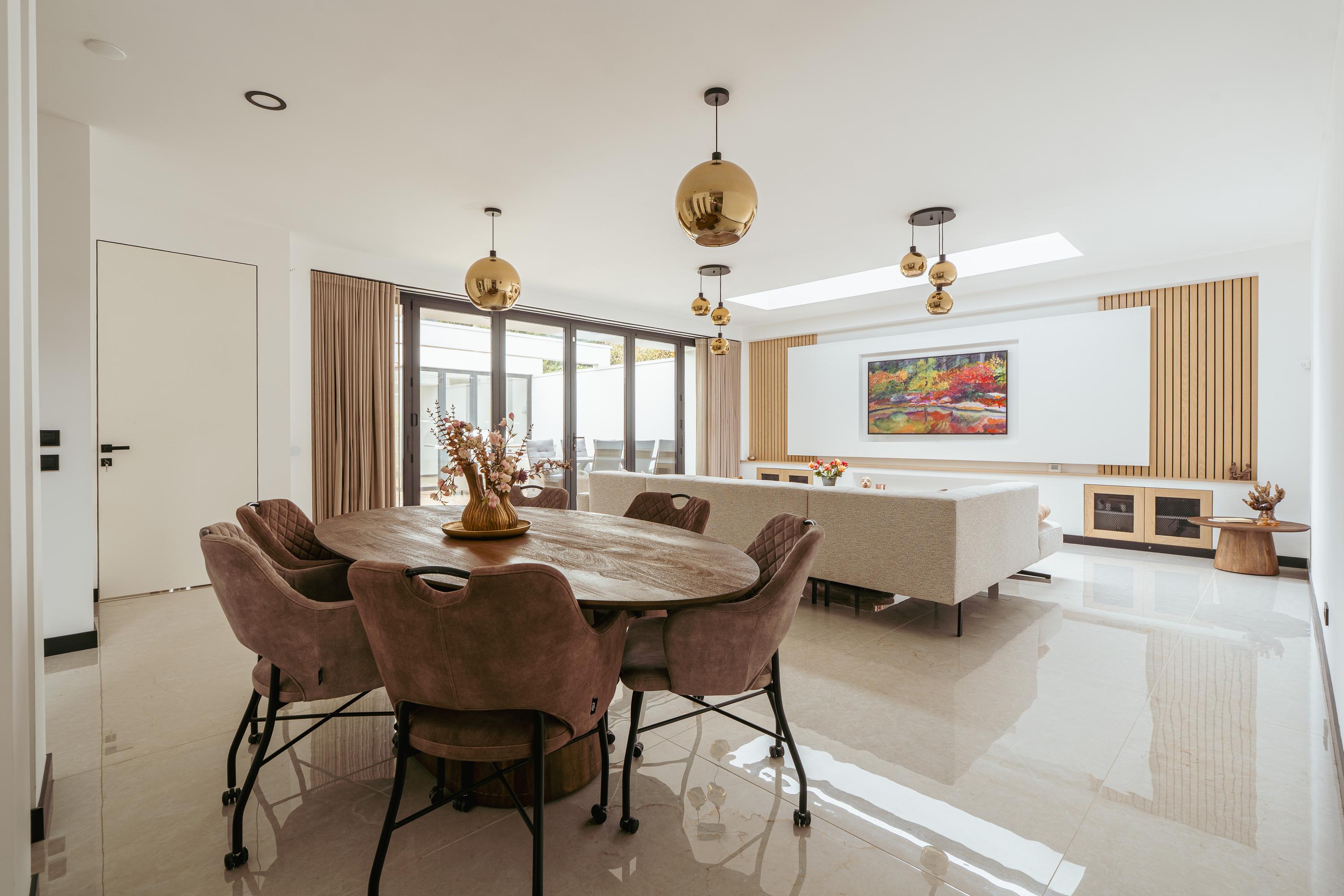 The entrance to the property is reached via the well-maintained front garden. The spacious hallway provides a welcoming first impression and leads into the generous living room, which is characterised by an abundance of natural light. Large windows and glass doors connect the living area directly to the garden terrace, creating a seamless flow between indoor and outdoor living. Adjacent to the living room is the luxurious open-plan kitchen, featuring a spacious cooking island that also serves as a cosy bar seating area. The kitchen is fully equipped and includes an oven and combi-oven, an induction hob with integrated extractor, a climate-controlled wine cabinet, Quooker, dishwasher, fridge and freezer. There is ample space for a large dining table. Behind the kitchen, you will find a spacious utility room and storage area, offering plenty of room for household appliances and pantry items.