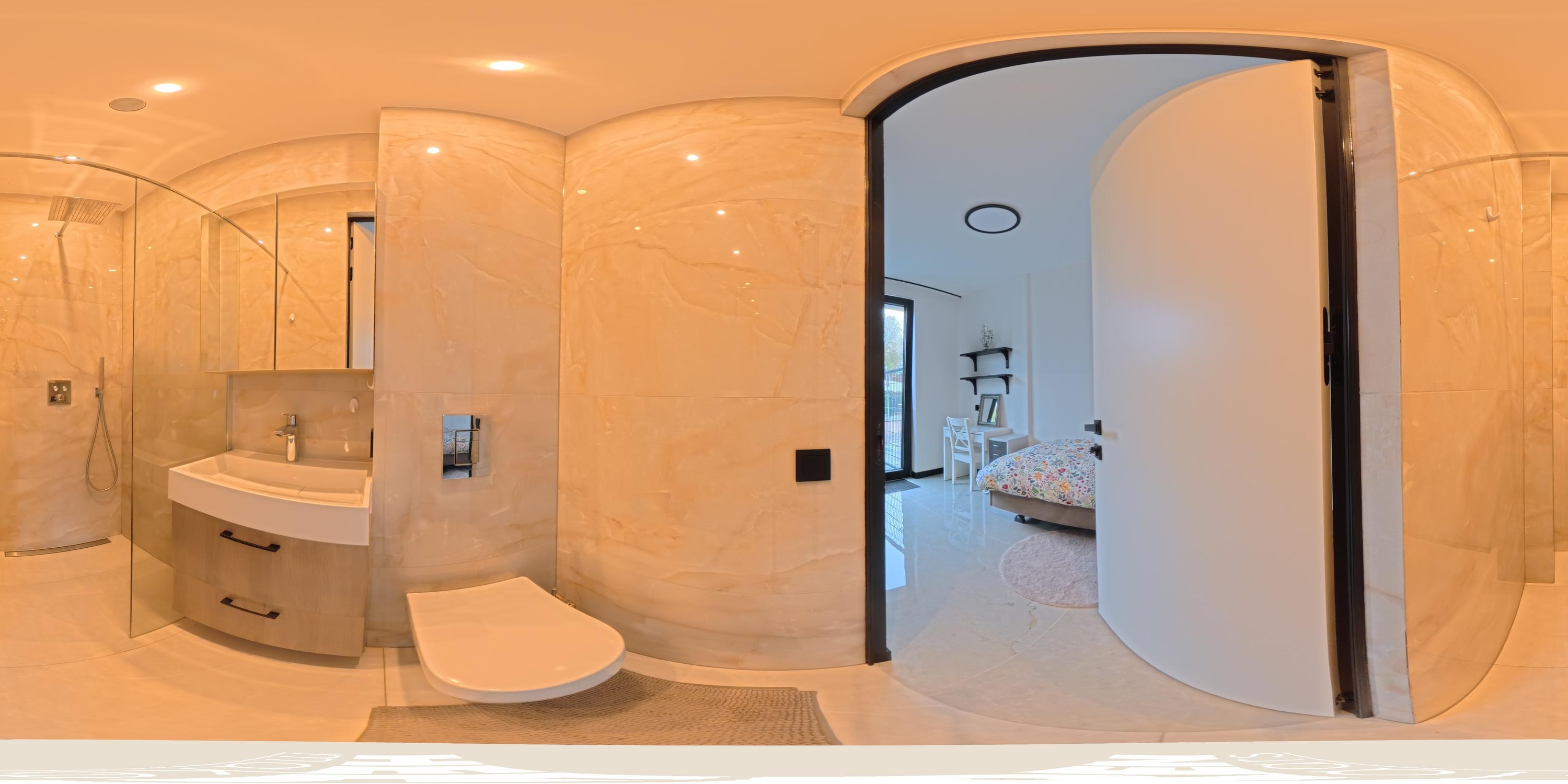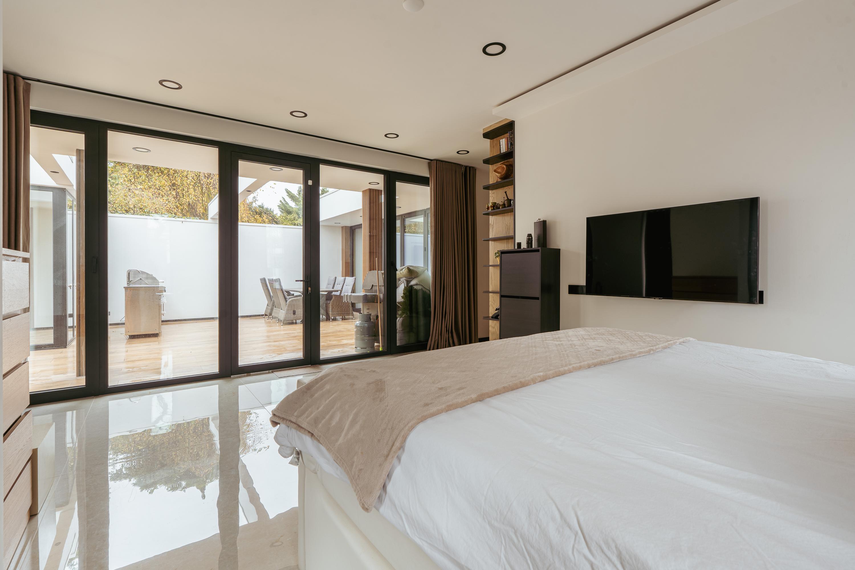 Also located on the ground floor is the impressive master bedroom with an en-suite bathroom. This high-end bathroom is fitted with a walk-in shower, double washbasin with vanity unit, and a toilet. The freestanding bathtub, positioned directly in the bedroom, adds to the luxurious, hotel-style feel. In addition, there is a comfortable guest suite, also with its own private bathroom featuring a washbasin with vanity unit, walk-in shower and toilet. A truly unique feature of this home is the fully self-contained additional living space on this floor, comprising a private living room with kitchen, bedroom and bathroom. This area is ideal for an au pair, live-in care, guests, or a home office. Furthermore, this floor offers a separate toilet, the meter cupboard, and several practical storage spaces. The beautifully landscaped garden is south-facing and includes a generous terrace with a fixed outdoor kitchen and barbecue, perfect for long summer evenings. At the rear of the garden, there is a detached garden house, which can easily be arranged as a home gym, hobby room or home office.