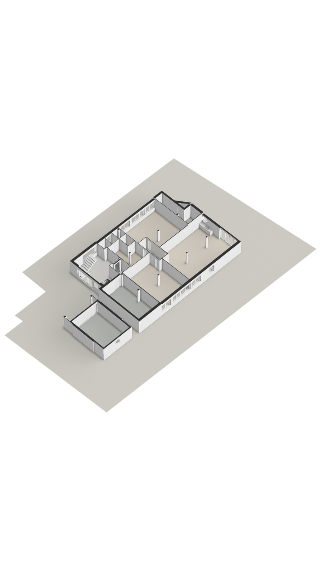 The ground floor includes three generous living spaces, each with large windows offering direct views of the beautifully landscaped garden surrounding the home. These rooms can be arranged entirely to your own wishes for example as living areas, a playroom, studio, lounge or bedroom. Centrally located is a large pantry with all necessary connections, providing the option to install a fully equipped kitchen if desired.
