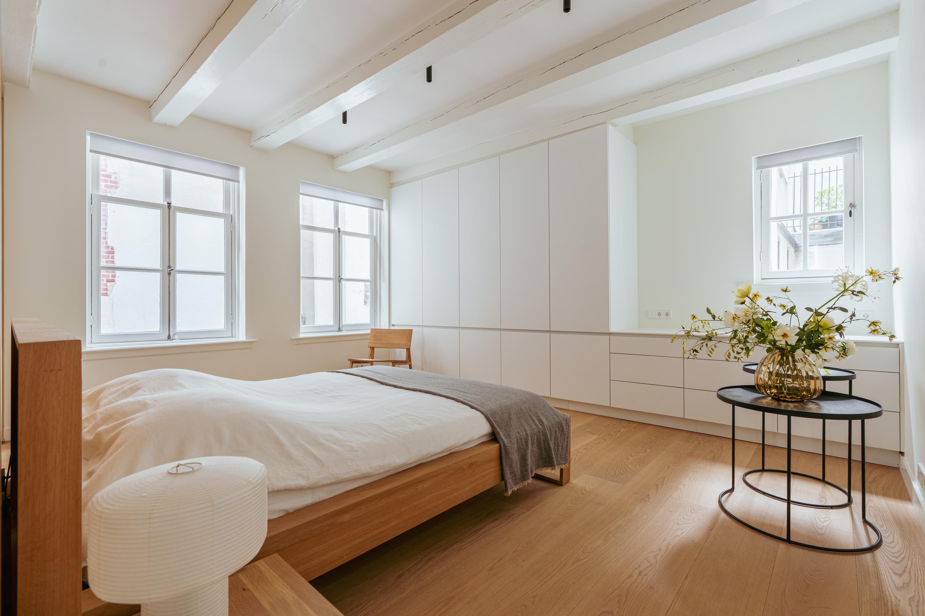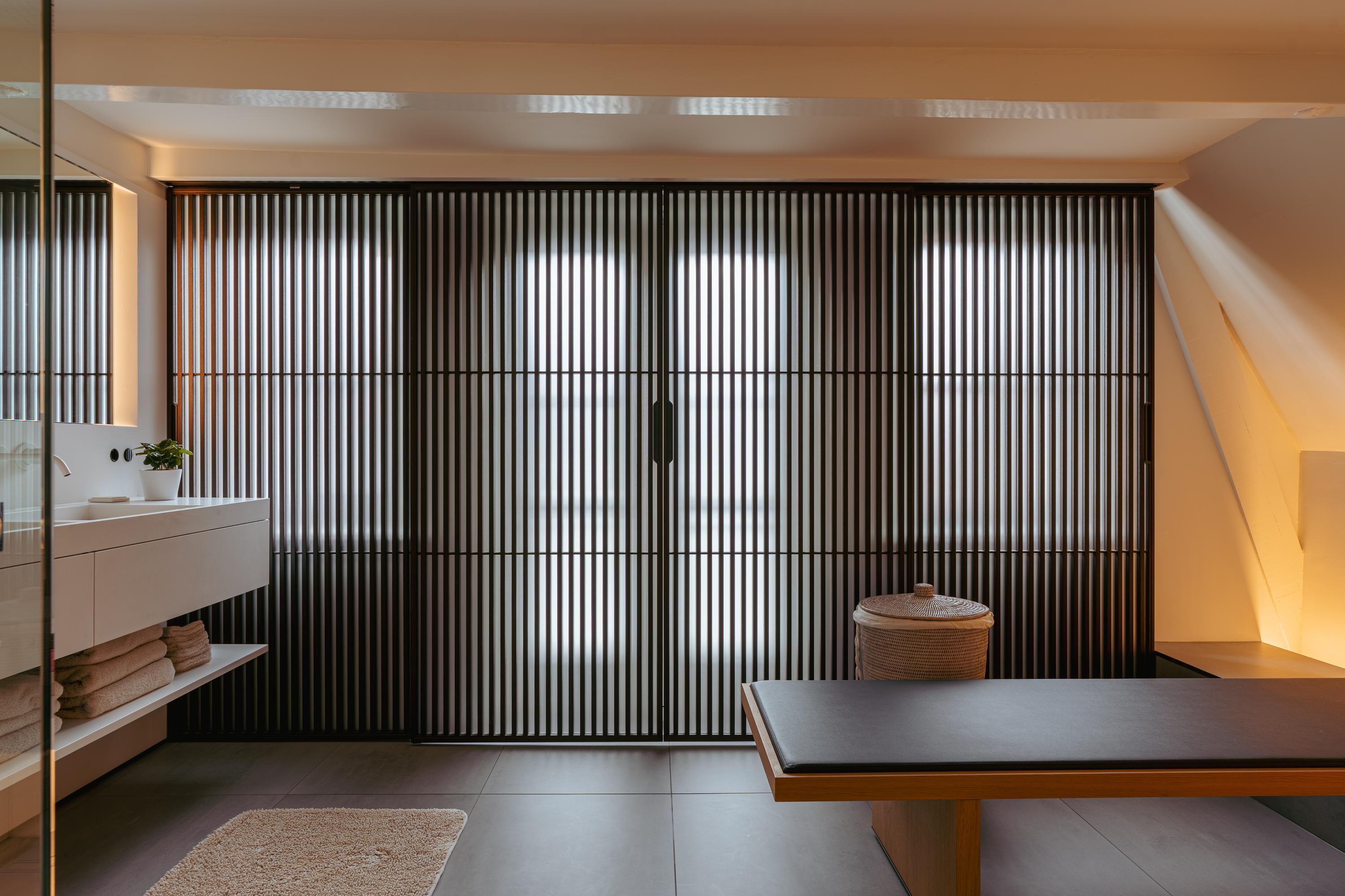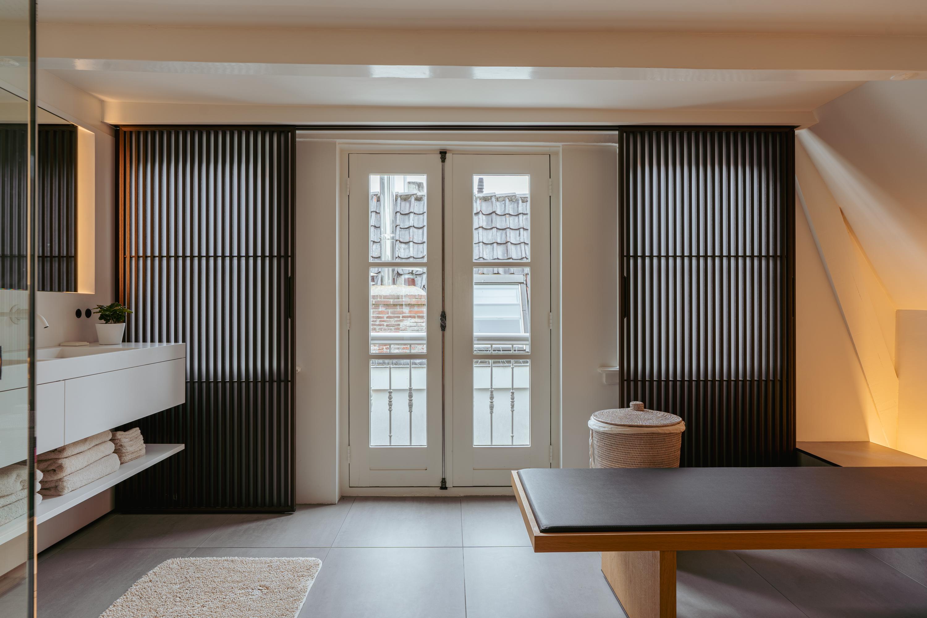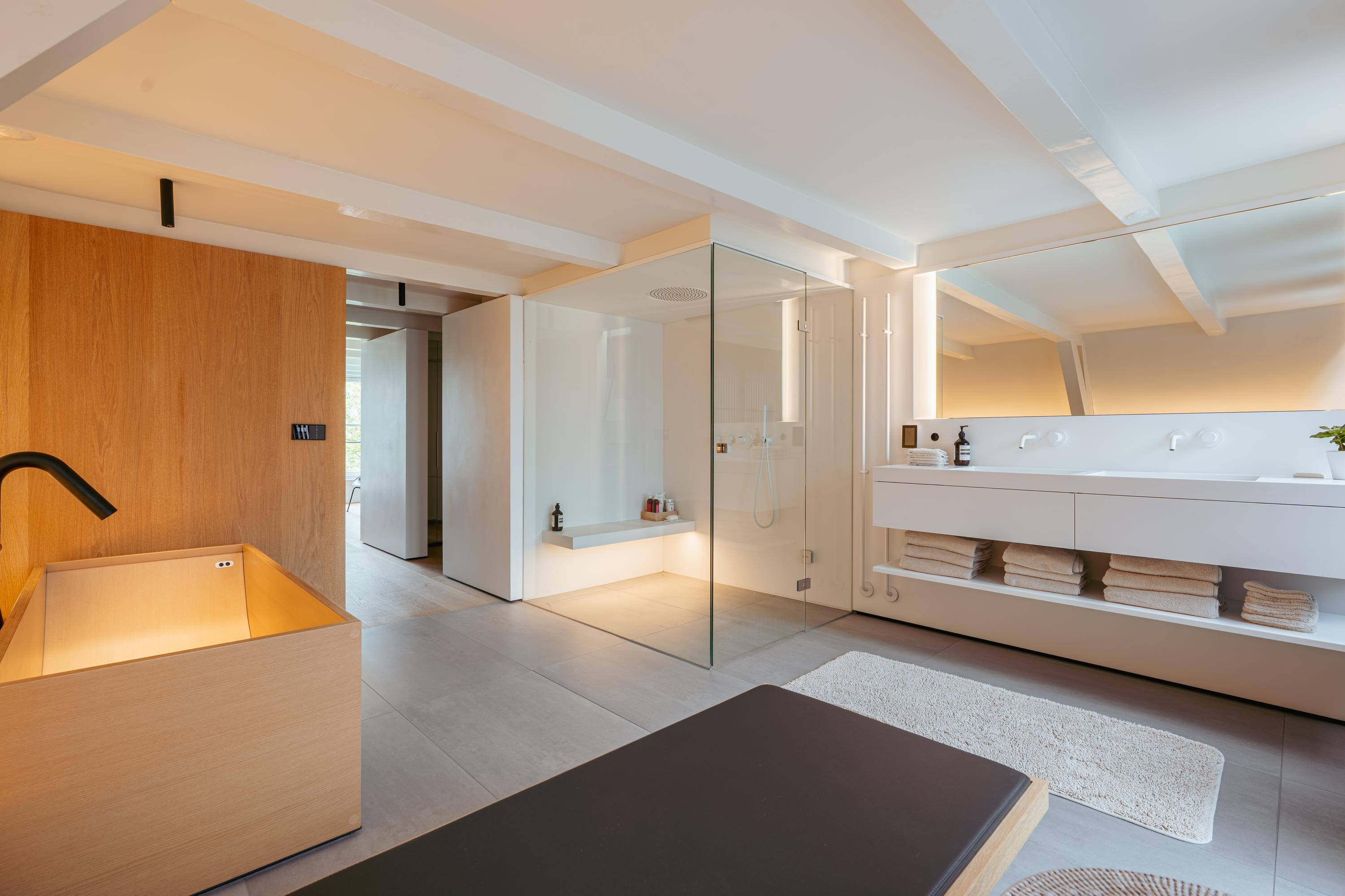 This upper floor is dedicated to a luxurious master suite — a private sanctuary of peace, space, and comfort. A central walk-in closet features custom cabinetry that is both functional and stylish. At the front is the cozy bedroom, where original ceiling beams and impressive ceiling height immediately draw the eye. Tall windows extending into the gable enhance the sense of openness and bring in wonderful natural light. Built-in wardrobes contribute to the clean, elegant look. At the rear lies the spectacular bathroom — a true wellness retreat at home. Here you’ll find a striking freestanding Agape Spoon Woodline bathtub, a double vanity with stylish cabinetry, a spacious walk-in shower, a steam cabin, and a built-in recliner for ultimate relaxation. The space is finished with warm materials and thoughtful design elements, including integrated lighting for a hotel-like atmosphere. Beautiful wooden sliding panels provide both shading and aesthetic appeal, offering privacy without blocking light. The toilet is separate from the bathroom.