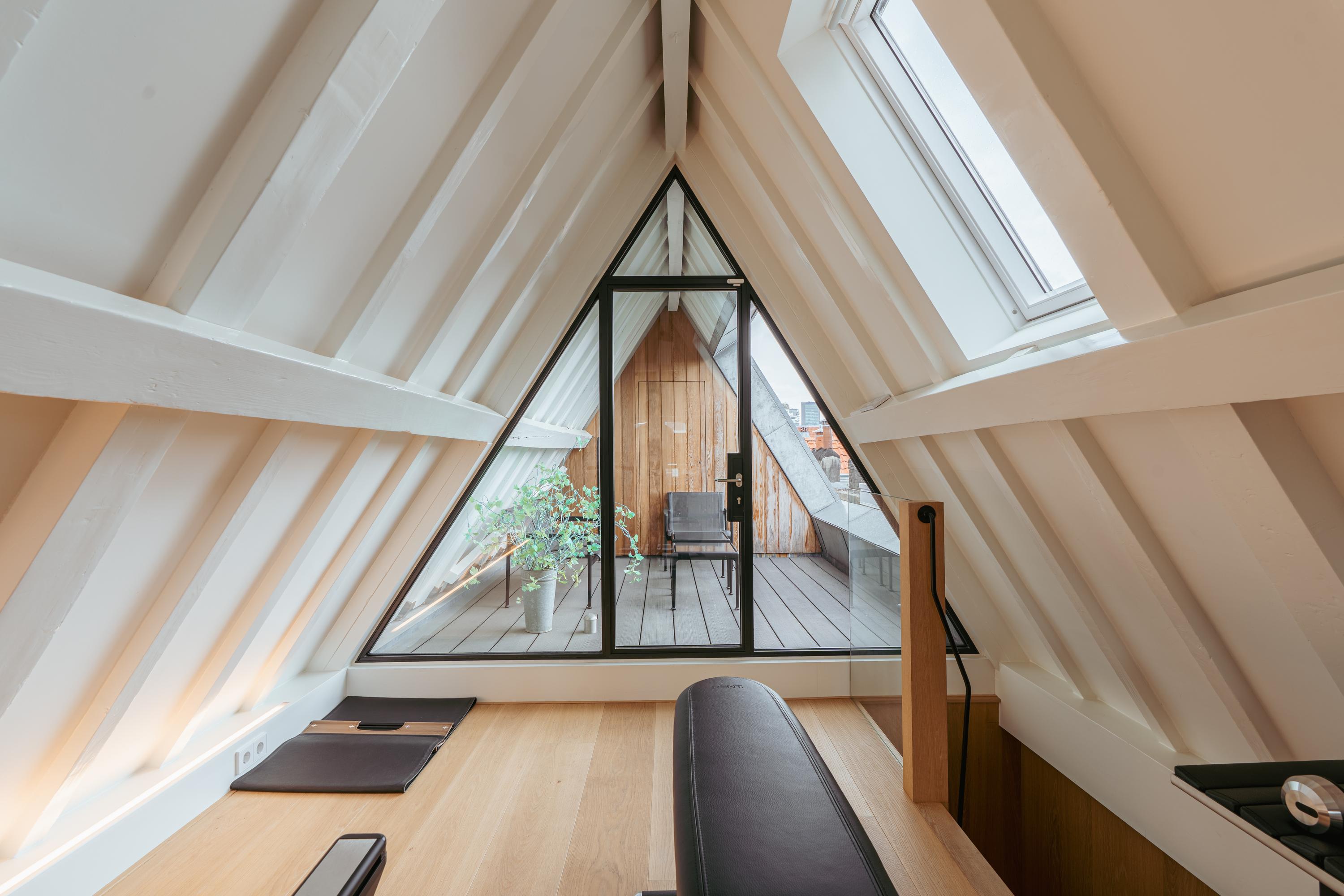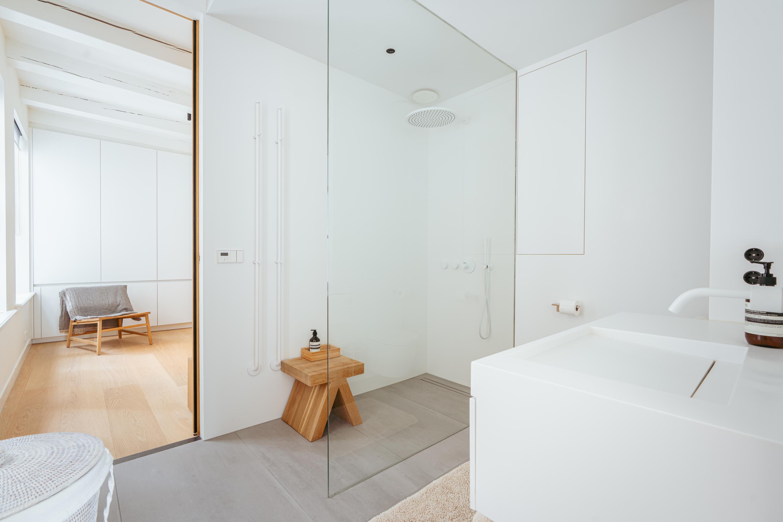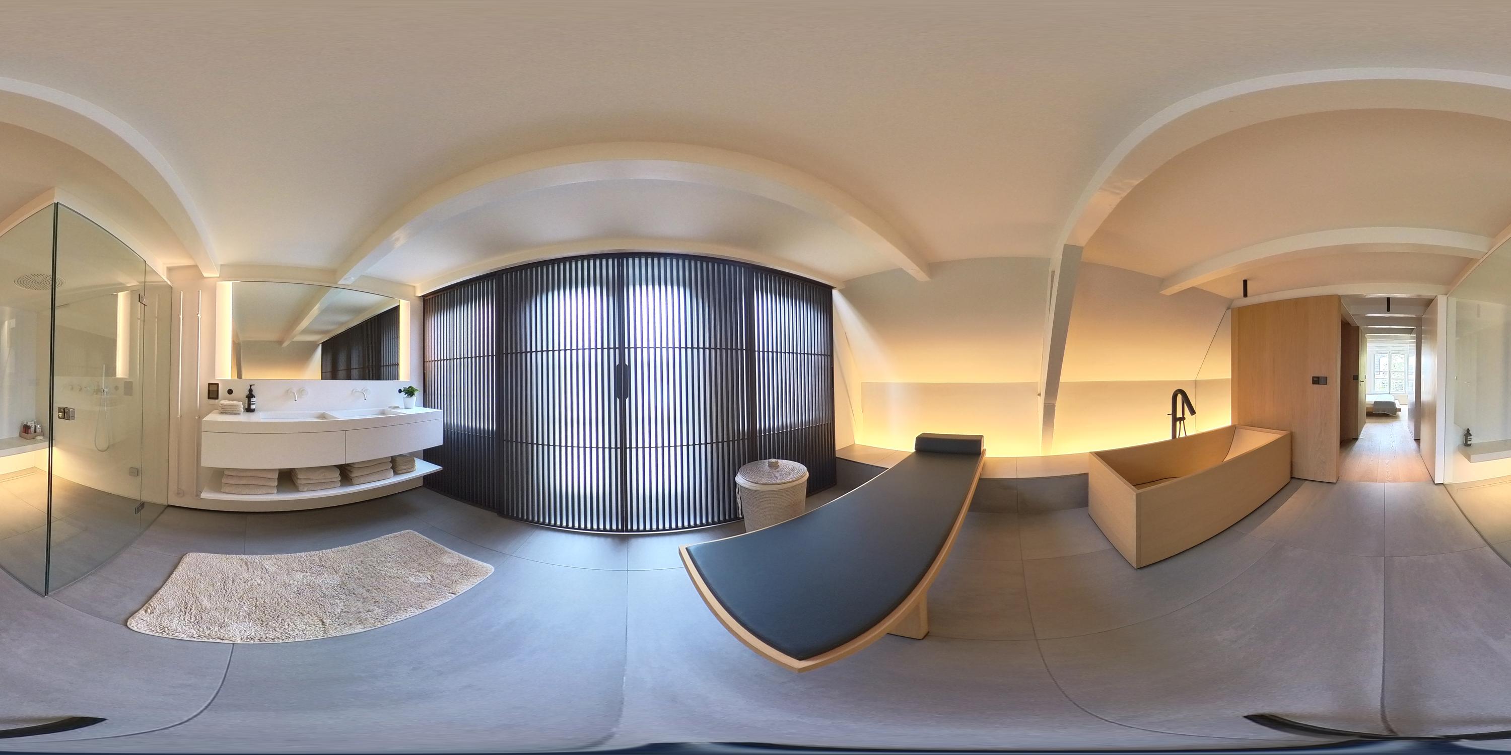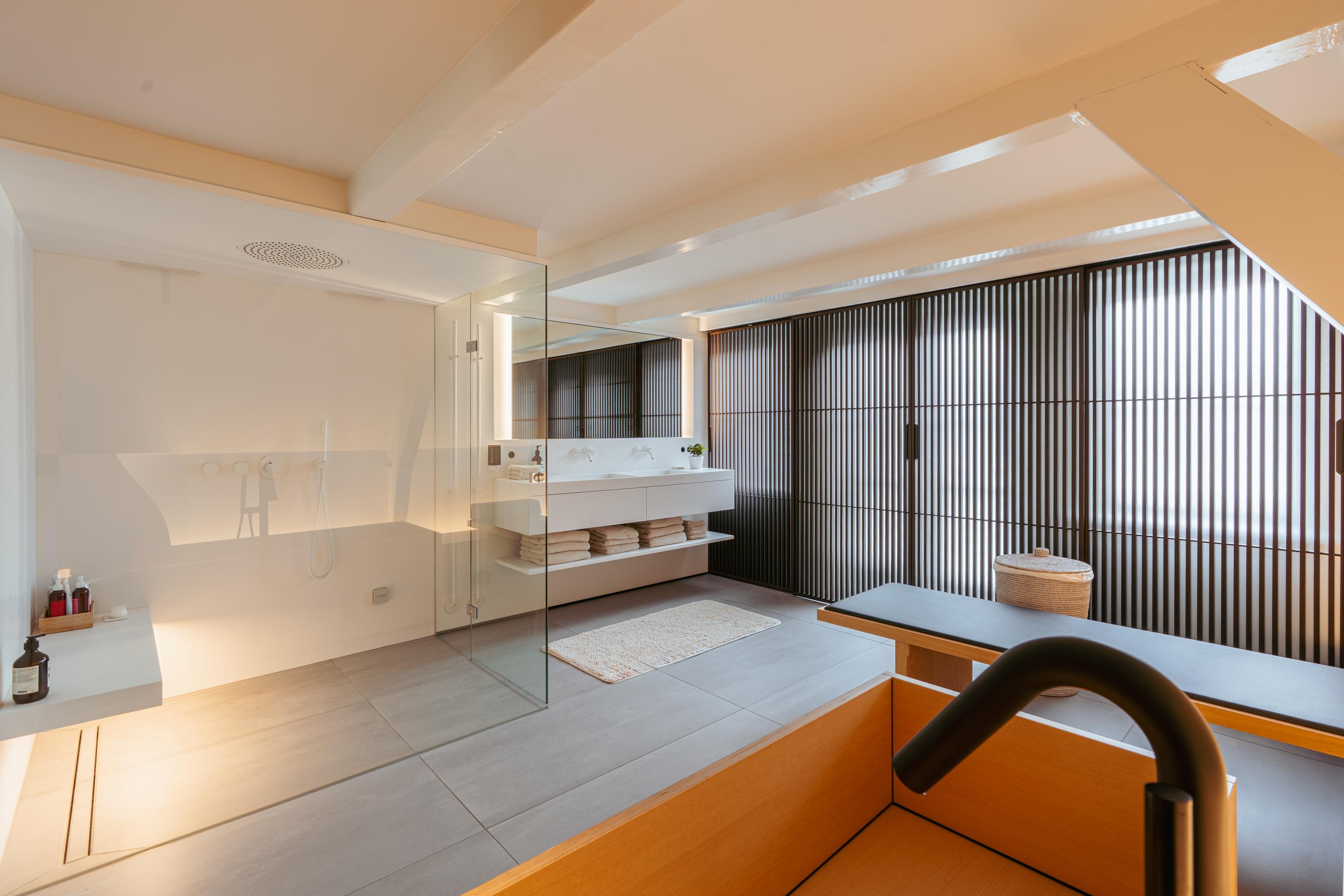 This upper floor is dedicated to a luxurious master suite — a private sanctuary of peace, space, and comfort. A central walk-in closet features custom cabinetry that is both functional and stylish. At the front is the cozy bedroom, where original ceiling beams and impressive ceiling height immediately draw the eye. Tall windows extending into the gable enhance the sense of openness and bring in wonderful natural light. Built-in wardrobes contribute to the clean, elegant look. At the rear lies the spectacular bathroom — a true wellness retreat at home. Here you’ll find a striking freestanding Agape Spoon Woodline bathtub, a double vanity with stylish cabinetry, a spacious walk-in shower, a steam cabin, and a built-in recliner for ultimate relaxation. The space is finished with warm materials and thoughtful design elements, including integrated lighting for a hotel-like atmosphere. Beautiful wooden sliding panels provide both shading and aesthetic appeal, offering privacy without blocking light. The toilet is separate from the bathroom.