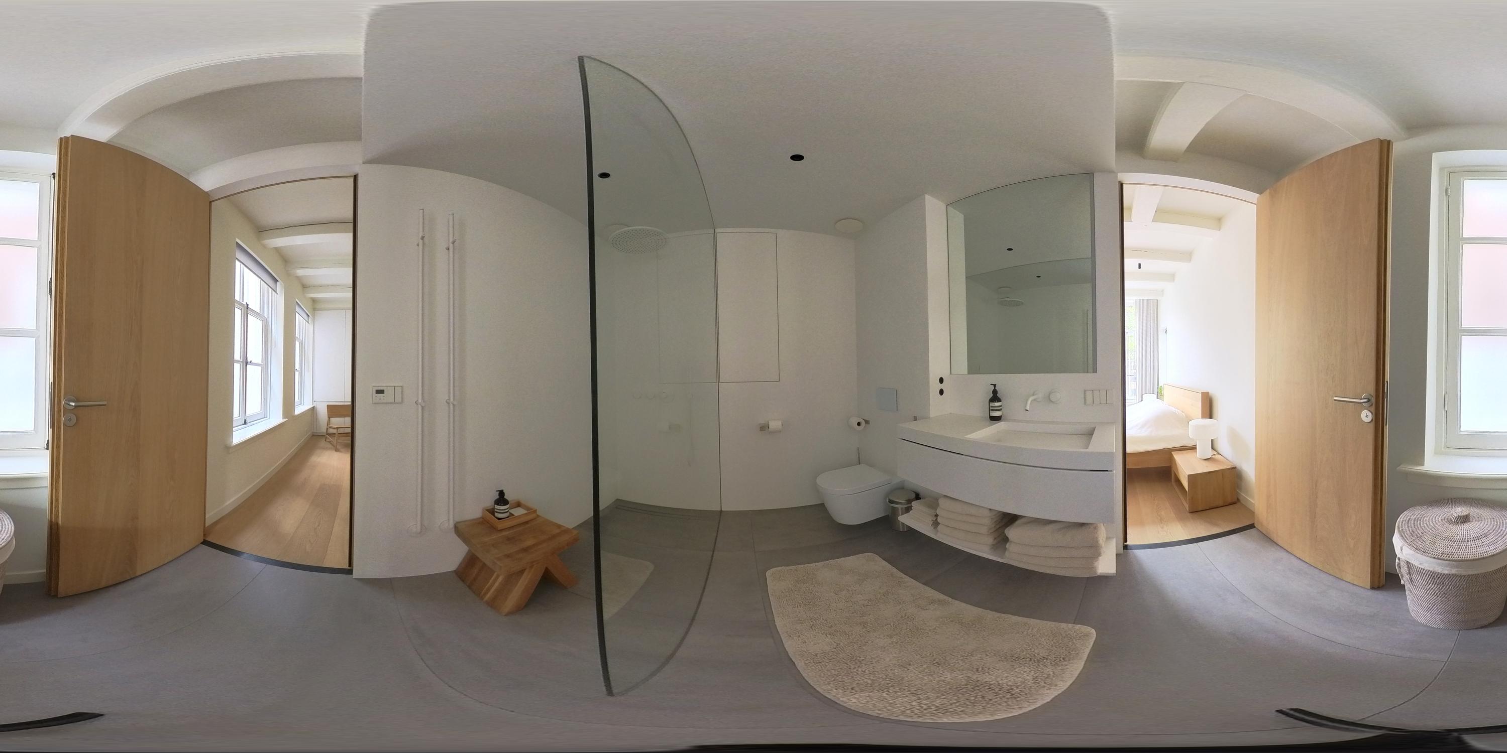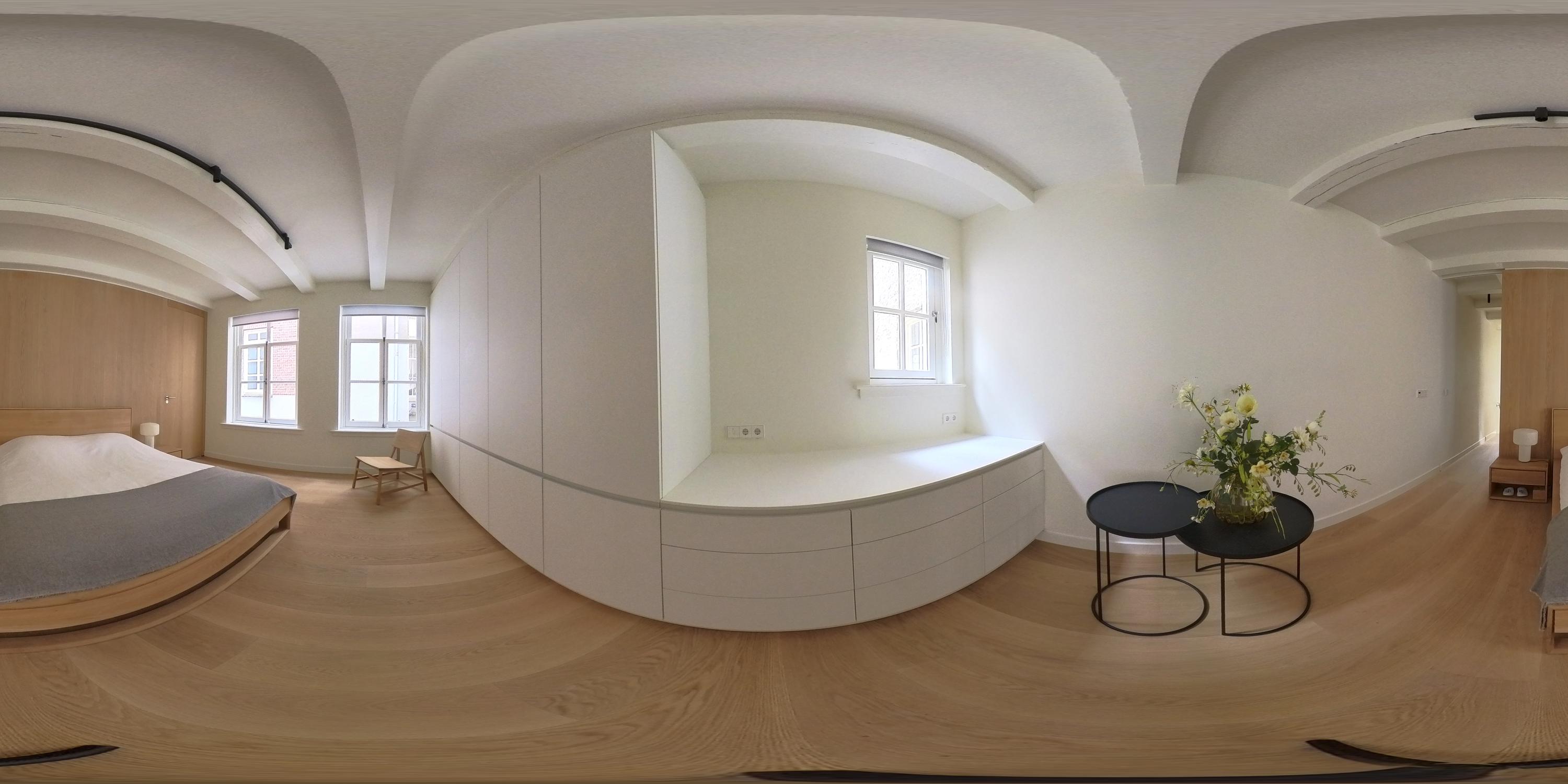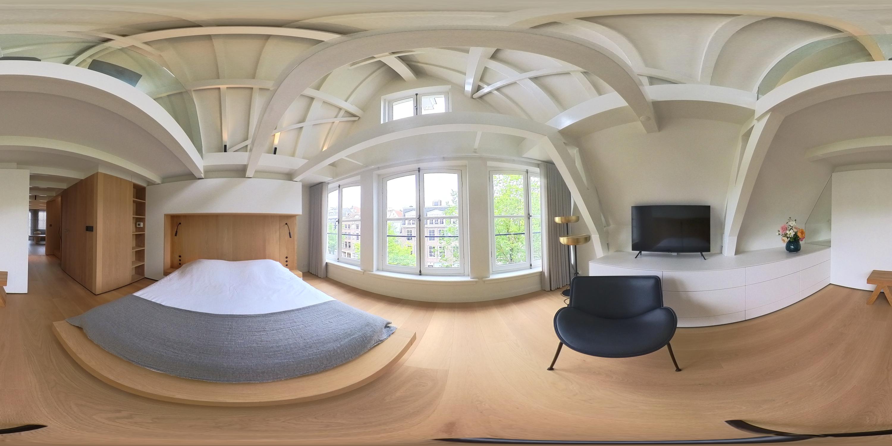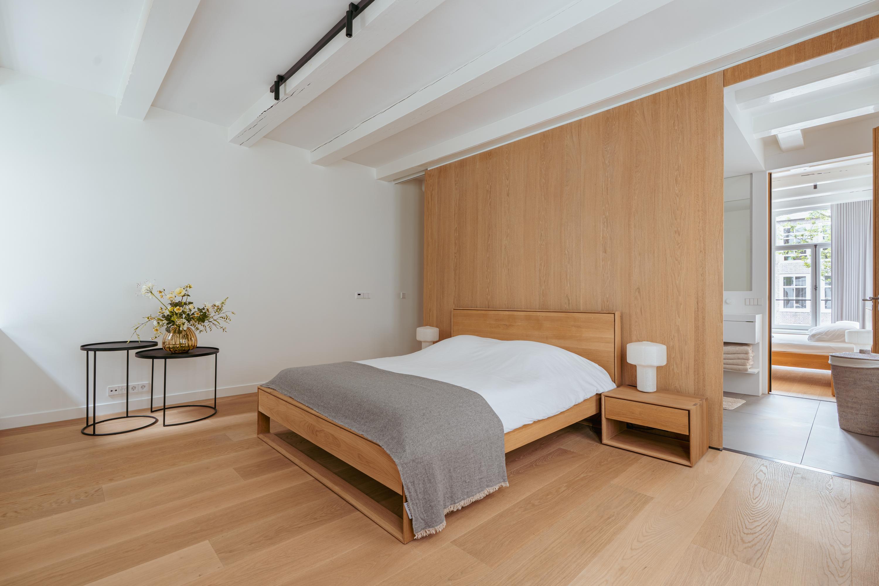 This upper floor is dedicated to a luxurious master suite — a private sanctuary of peace, space, and comfort. A central walk-in closet features custom cabinetry that is both functional and stylish. At the front is the cozy bedroom, where original ceiling beams and impressive ceiling height immediately draw the eye. Tall windows extending into the gable enhance the sense of openness and bring in wonderful natural light. Built-in wardrobes contribute to the clean, elegant look. At the rear lies the spectacular bathroom — a true wellness retreat at home. Here you’ll find a striking freestanding Agape Spoon Woodline bathtub, a double vanity with stylish cabinetry, a spacious walk-in shower, a steam cabin, and a built-in recliner for ultimate relaxation. The space is finished with warm materials and thoughtful design elements, including integrated lighting for a hotel-like atmosphere. Beautiful wooden sliding panels provide both shading and aesthetic appeal, offering privacy without blocking light. The toilet is separate from the bathroom.