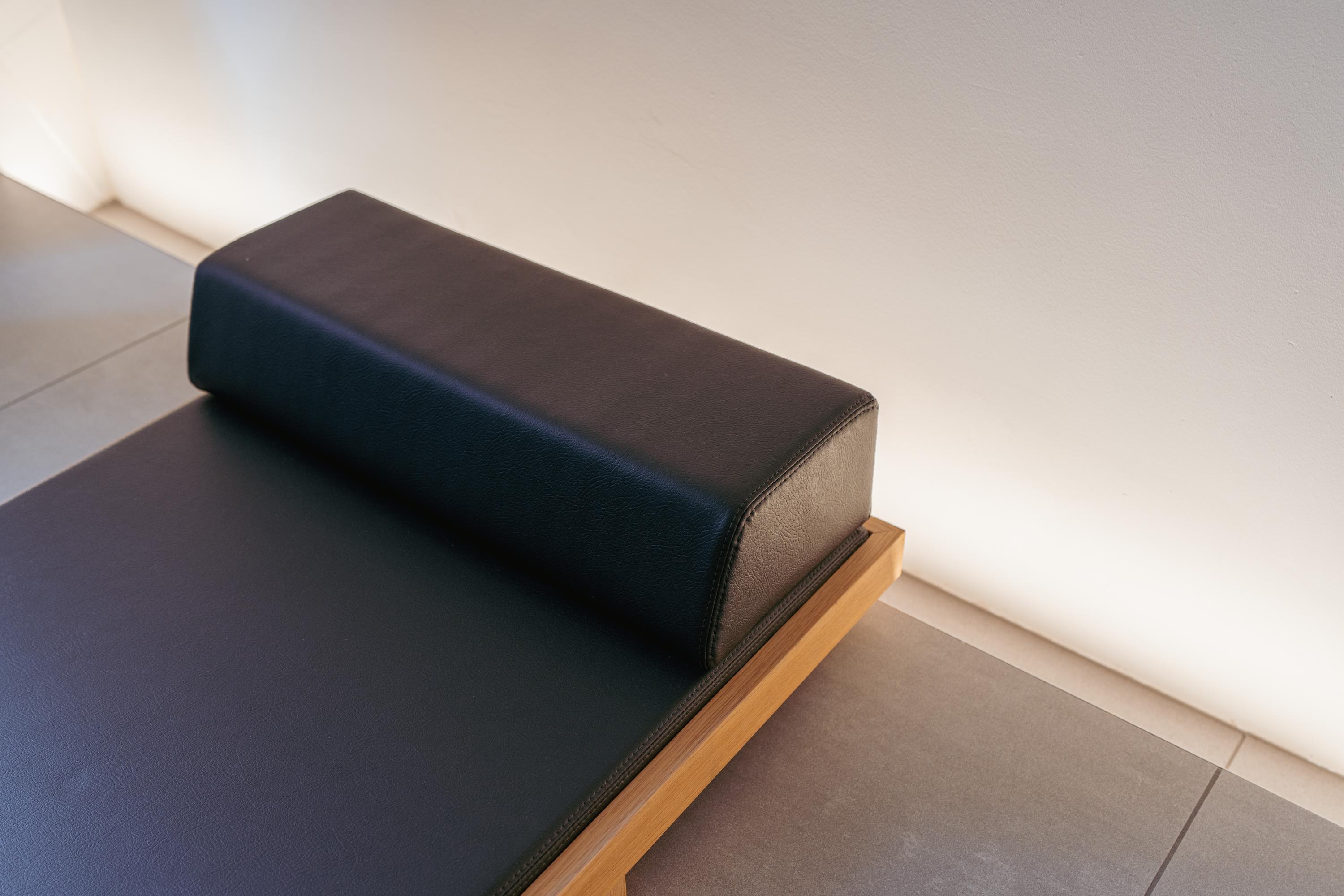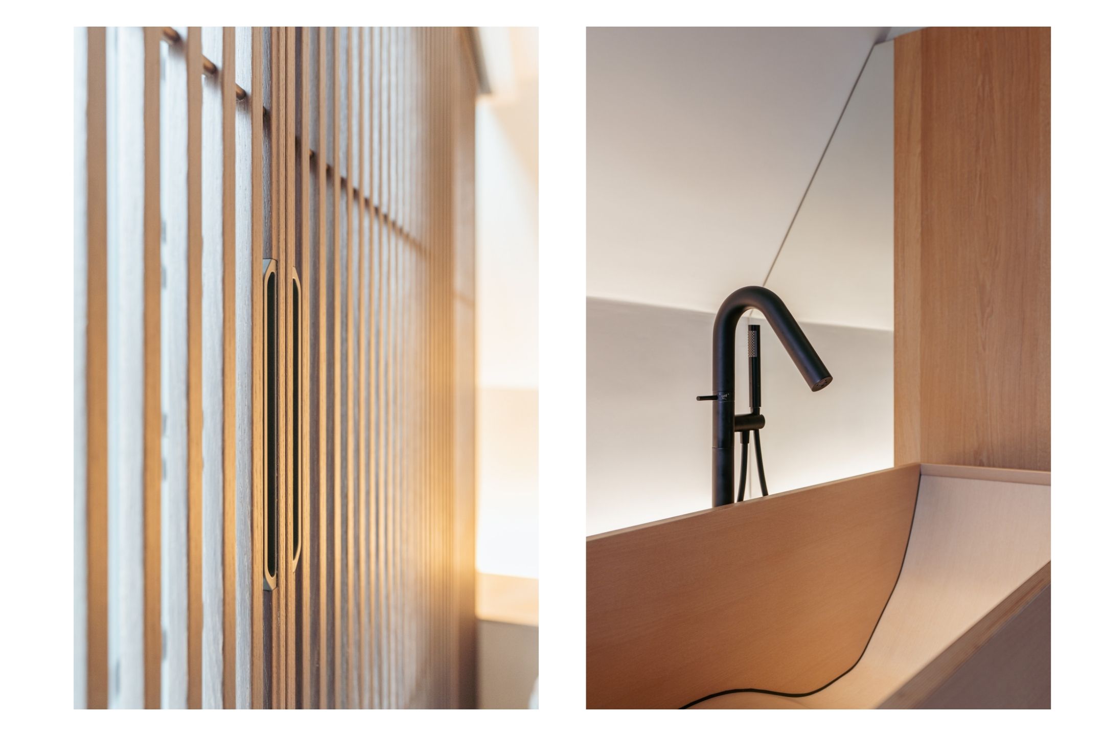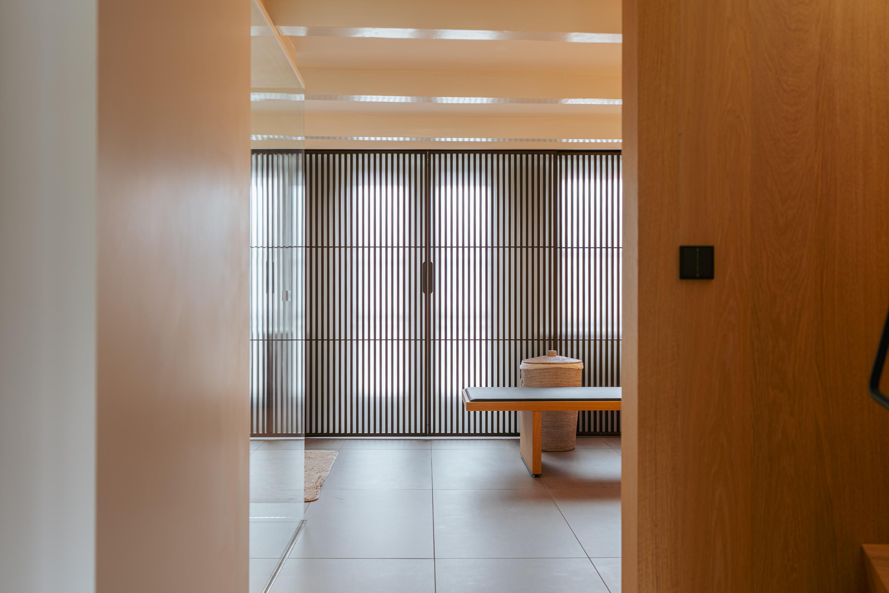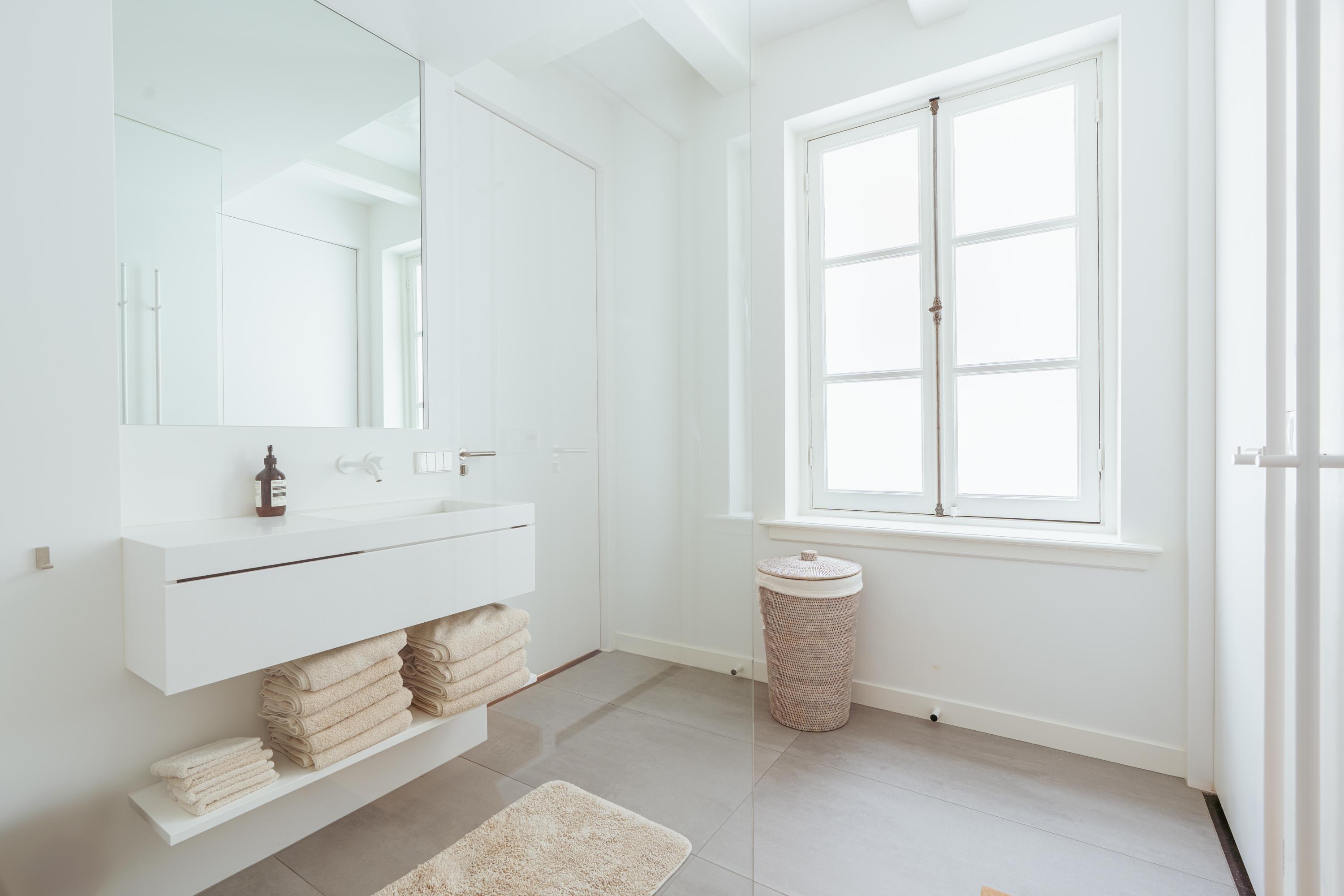This upper floor is dedicated to a luxurious master suite — a private sanctuary of peace, space, and comfort. A central walk-in closet features custom cabinetry that is both functional and stylish. At the front is the cozy bedroom, where original ceiling beams and impressive ceiling height immediately draw the eye. Tall windows extending into the gable enhance the sense of openness and bring in wonderful natural light. Built-in wardrobes contribute to the clean, elegant look. At the rear lies the spectacular bathroom — a true wellness retreat at home. Here you’ll find a striking freestanding Agape Spoon Woodline bathtub, a double vanity with stylish cabinetry, a spacious walk-in shower, a steam cabin, and a built-in recliner for ultimate relaxation. The space is finished with warm materials and thoughtful design elements, including integrated lighting for a hotel-like atmosphere. Beautiful wooden sliding panels provide both shading and aesthetic appeal, offering privacy without blocking light. The toilet is separate from the bathroom.