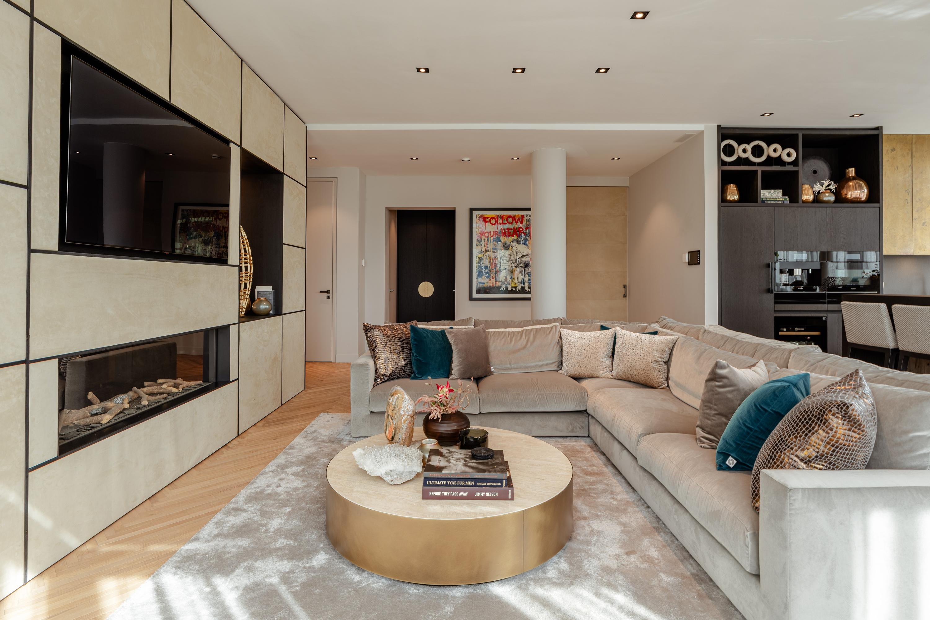 Via the communal entrance and elevator, you reach the seventh floor. The spacious hallway with separate guest toilet leads into the bright living room, featuring a fireplace and striking steel-framed doors with smoked glass.