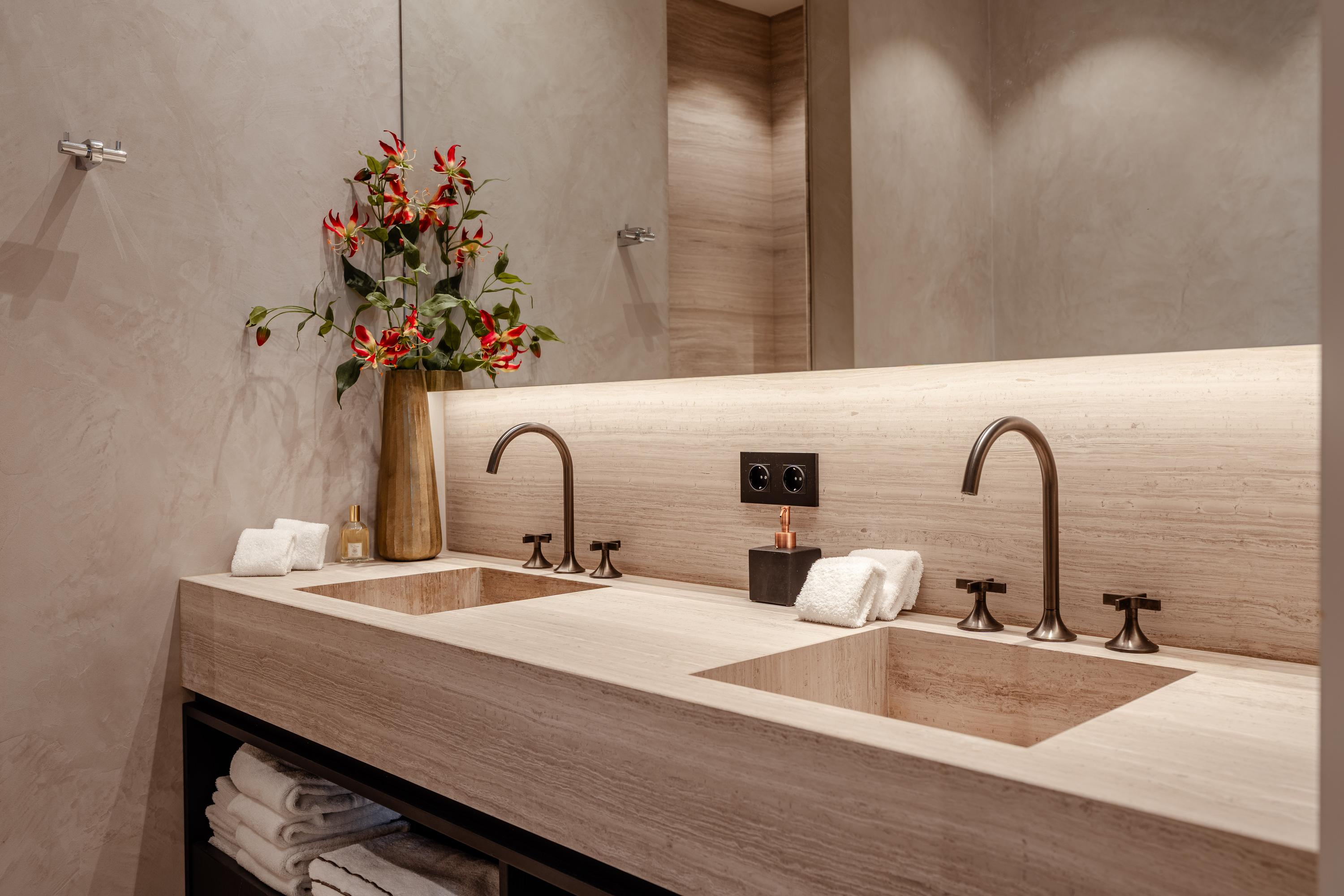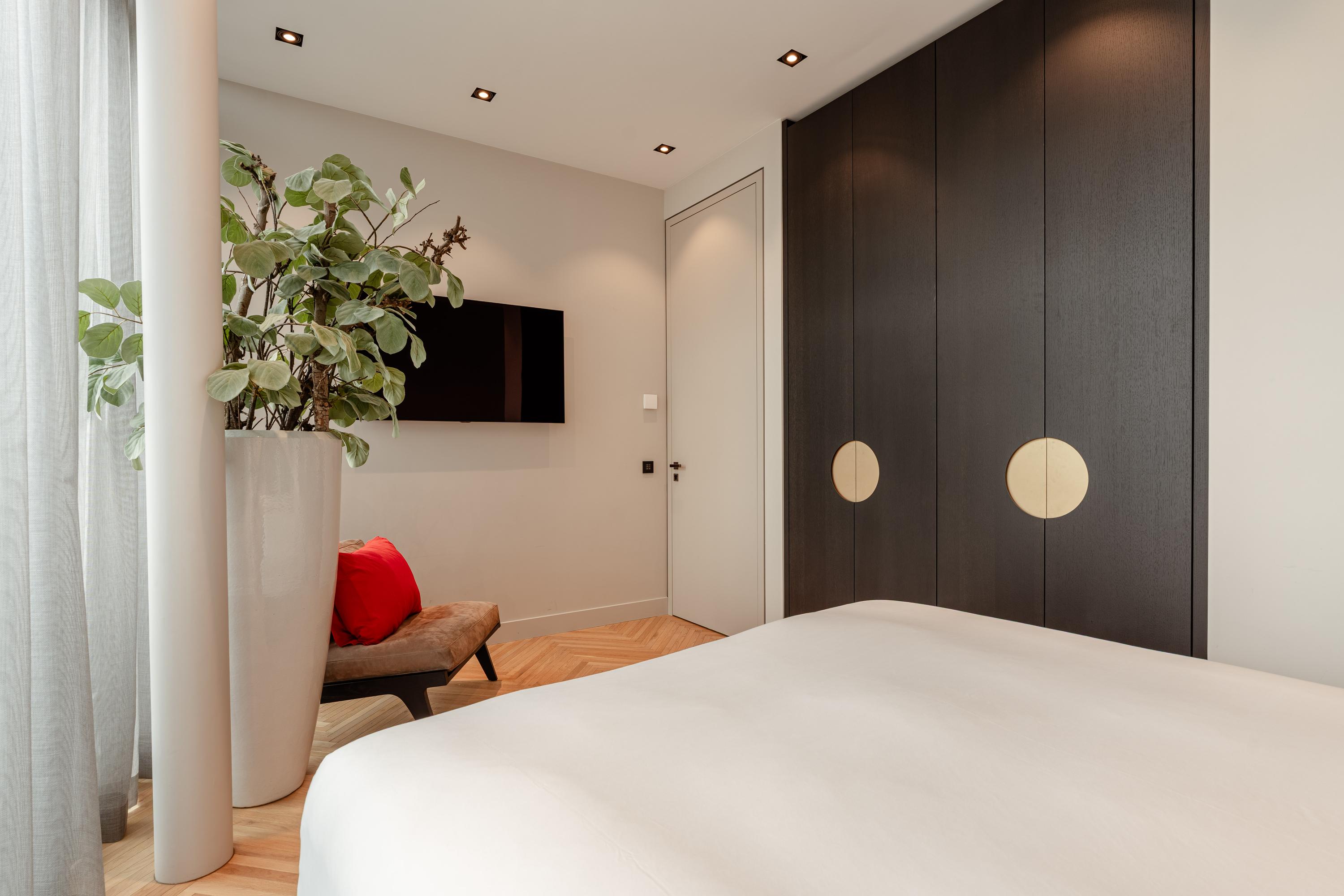 The apartment offers three bedrooms, each furnished with luxury Hästens beds. The master suite includes a private walk-in closet and a luxurious bathroom finished in marble and mosaic, featuring a bathtub, double washbasin, walk-in shower, and separate toilet. The second bathroom, designed in warm earthy tones, is also fully equipped and smartly laid out. Throughout the apartment lies a beautiful wooden floor, combined with underfloor and ceiling heating and cooling, recessed lighting, and electric sun blinds. A private storage room, as well as a technical and laundry room, are also included.