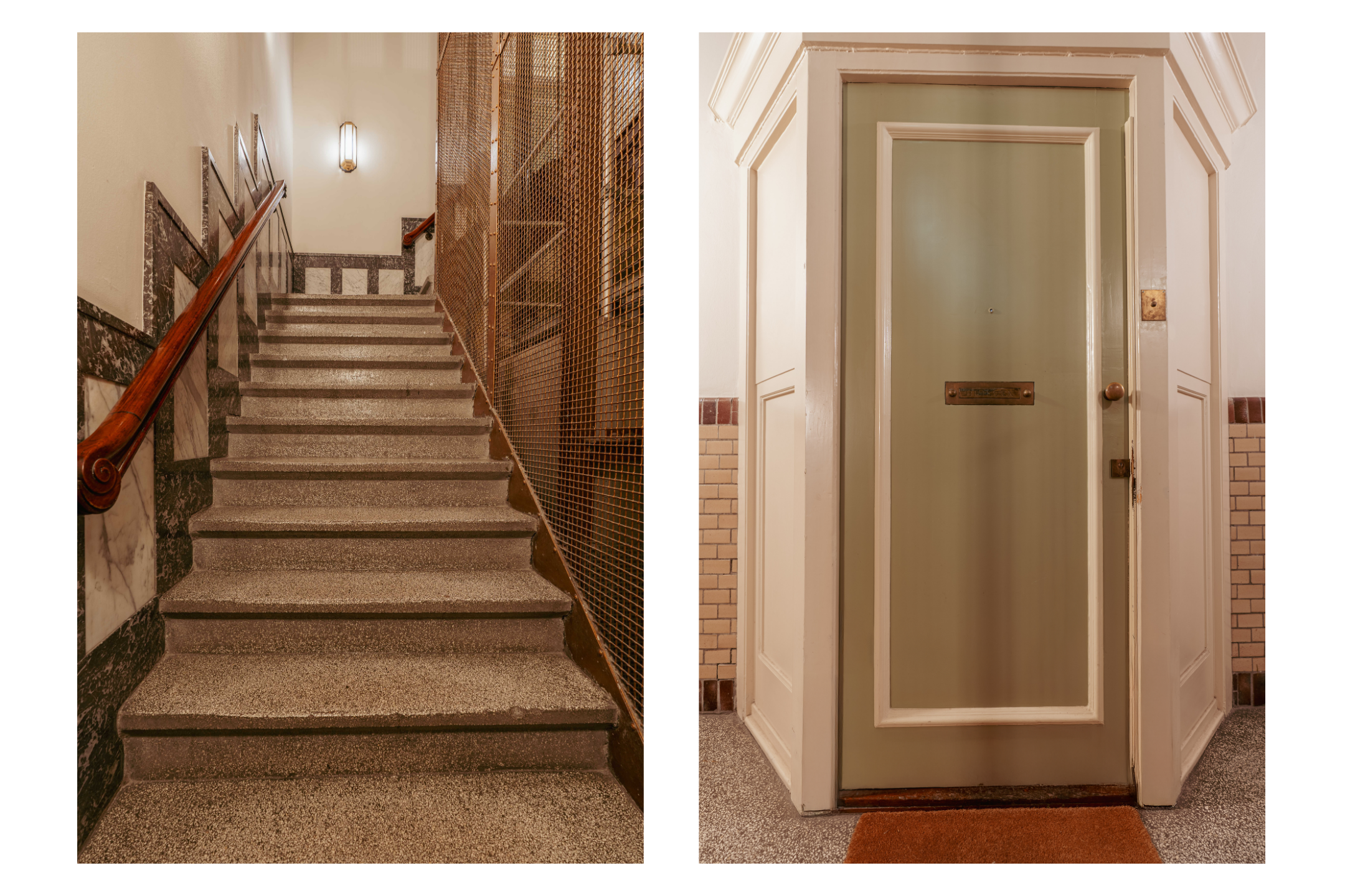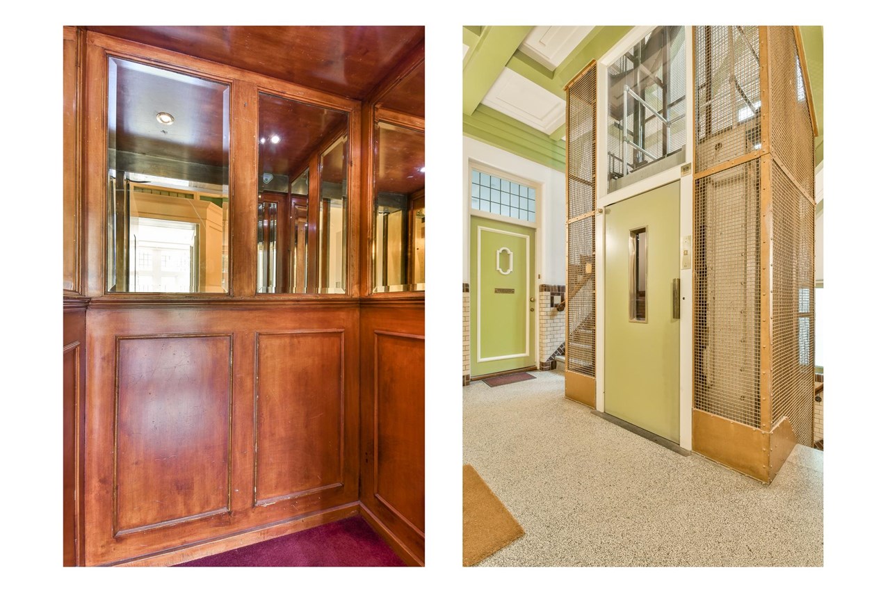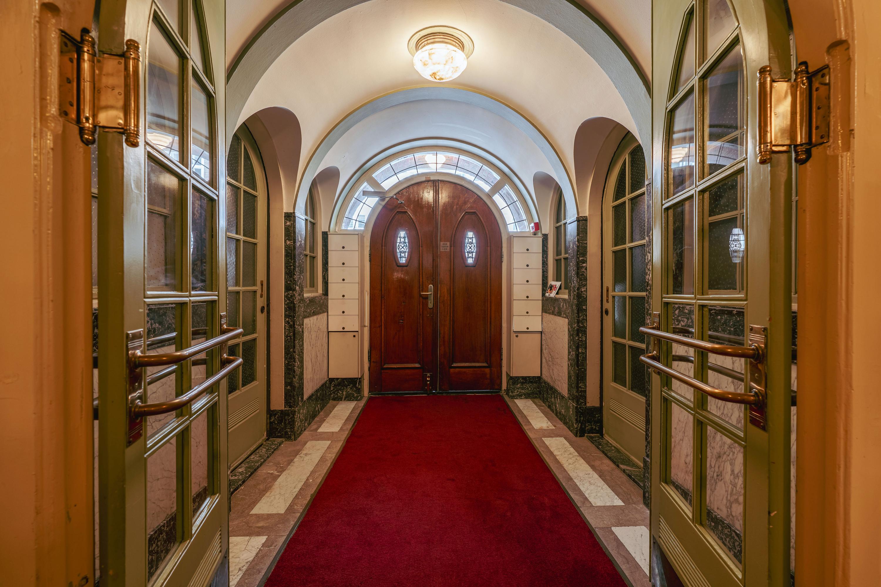 Upon entering the stately building, you are immediately greeted by the wide, characteristic staircase with a lift featuring elegant details such as marble elements and tasteful lighting.