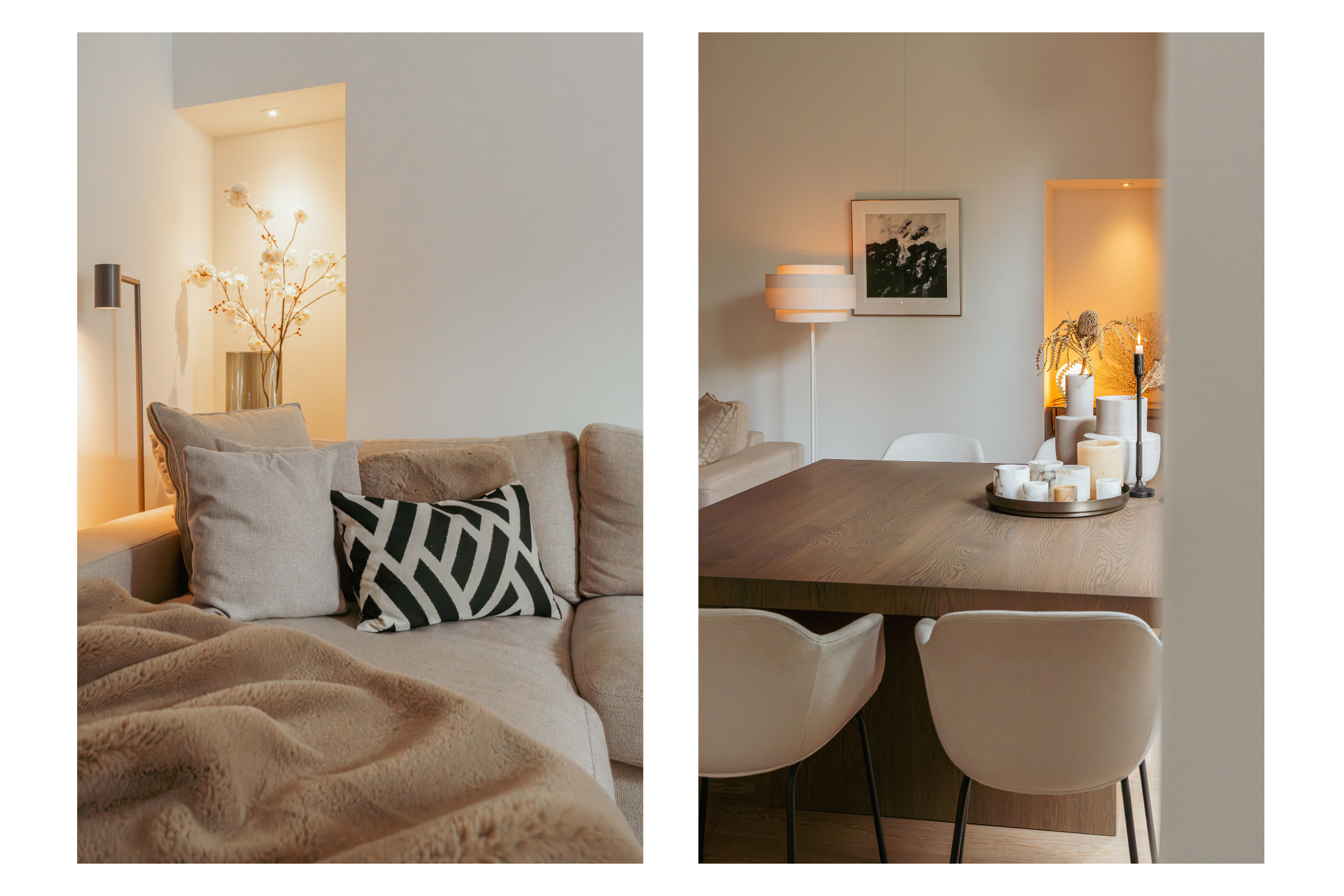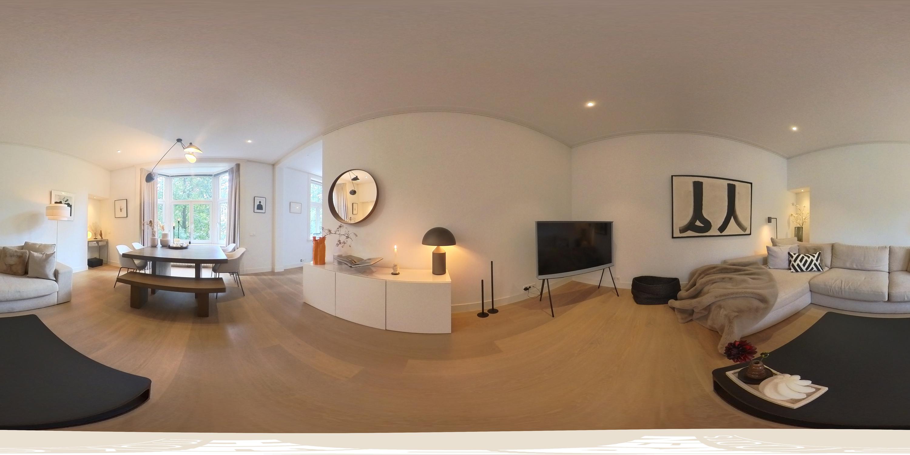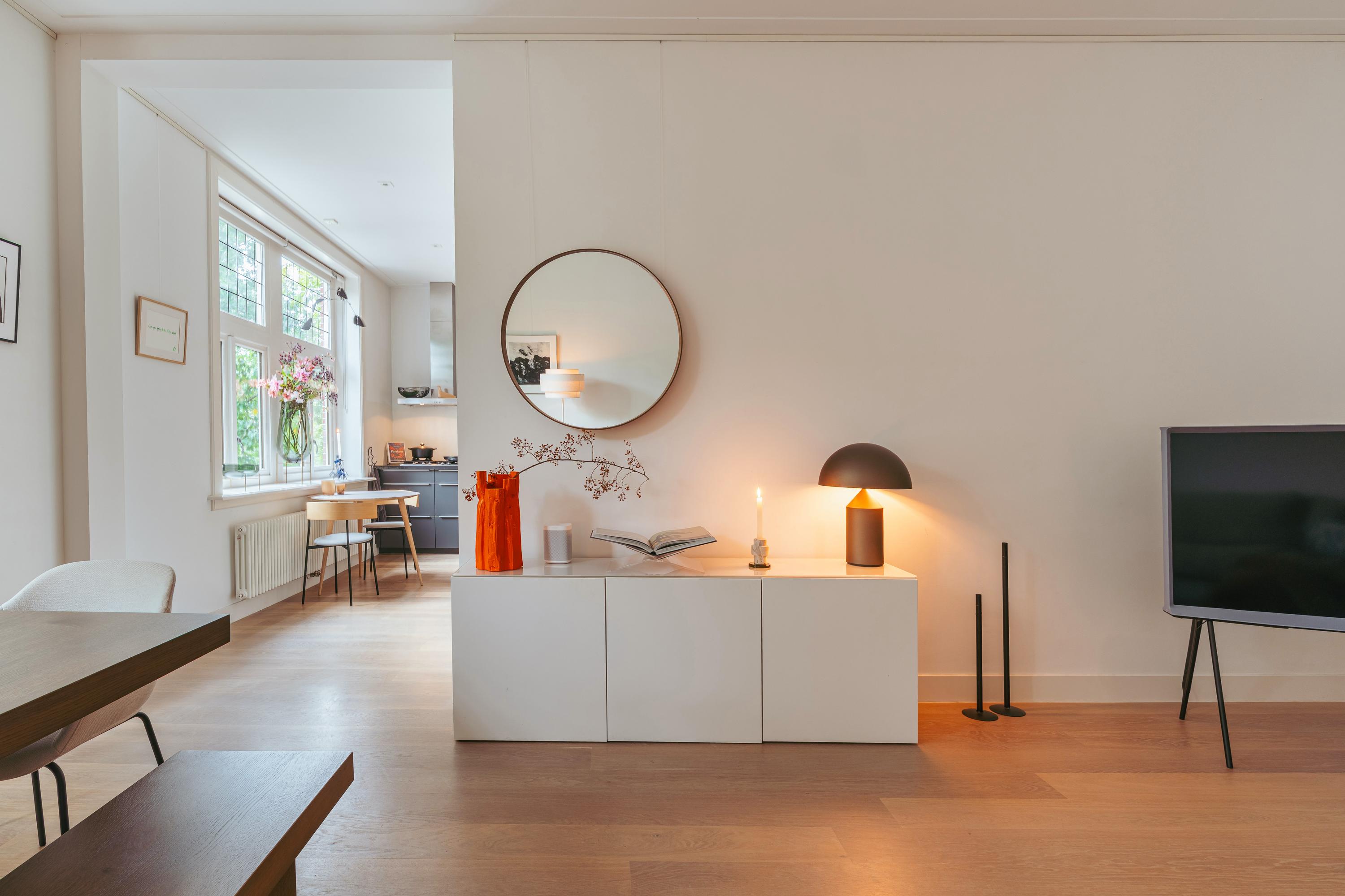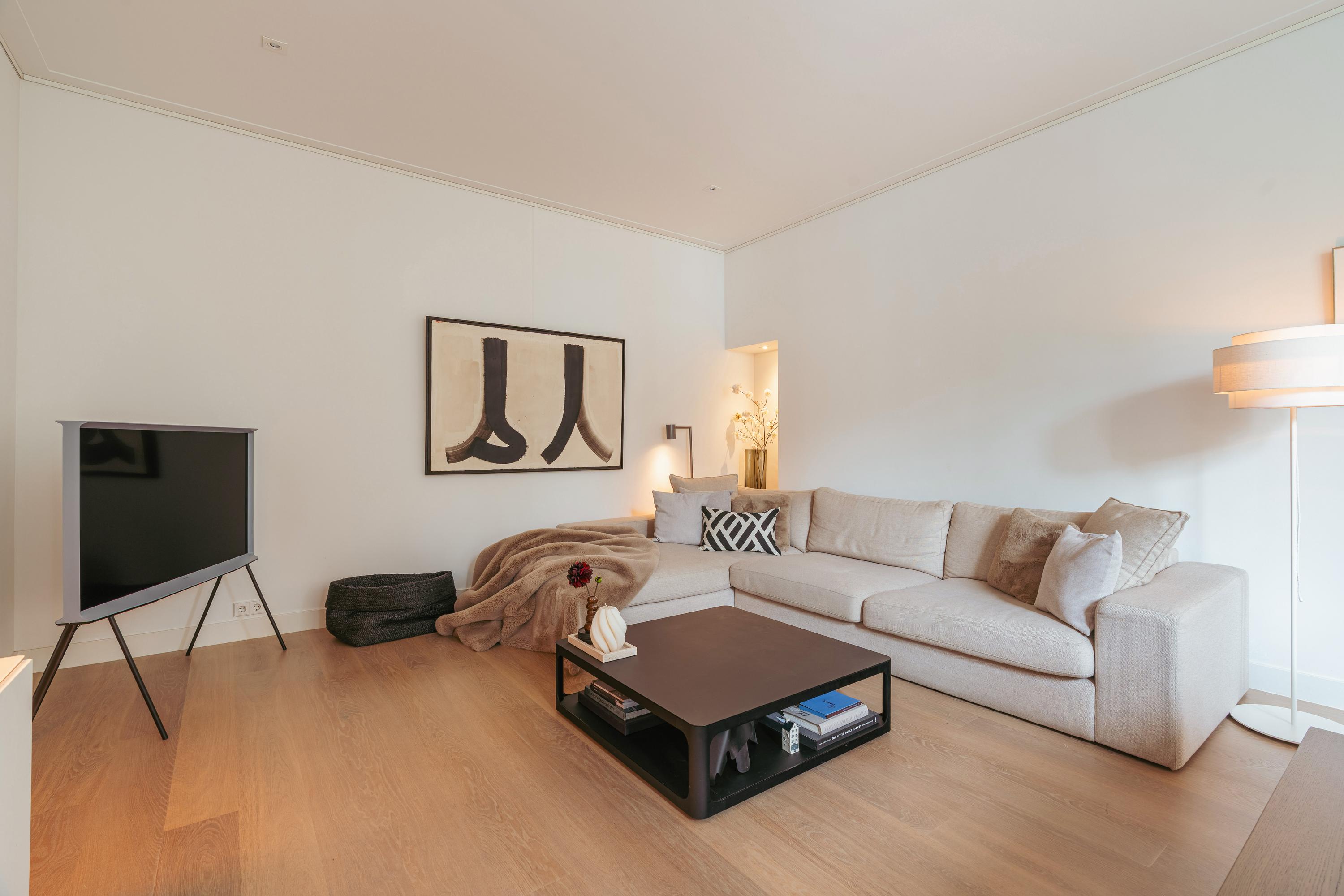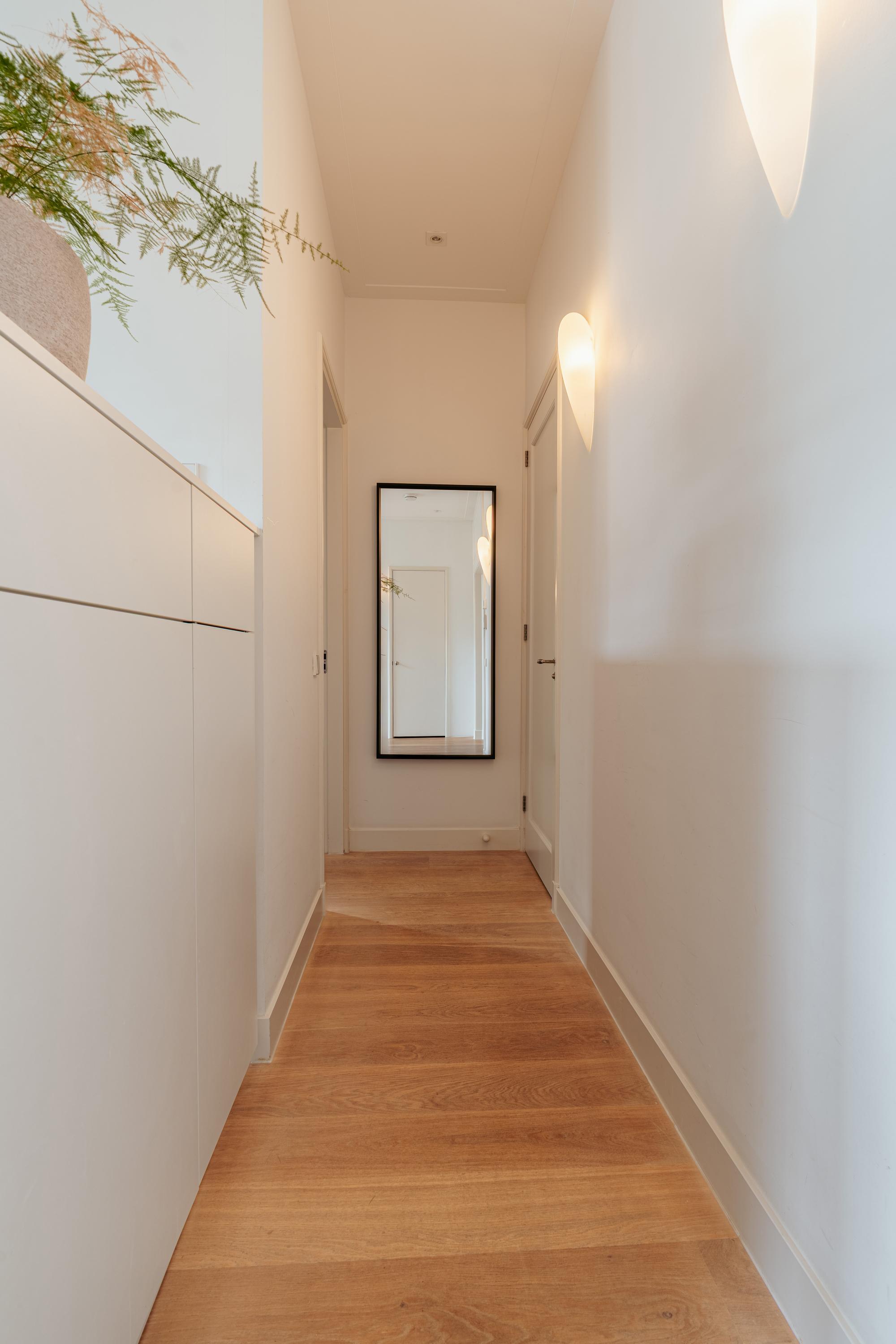 The apartment is located on the second floor, where the high ceilings and authentic features of the Amsterdam School style immediately catch the eye. You enter into the modern, sleekly finished kitchen, equipped with high-quality built-in appliances: a five-burner gas stove with extractor, combi-oven, fridge-freezer, dishwasher, and Quooker. Large, decorative windows allow plenty of natural light to flow in, creating an elegant and inviting atmosphere. The adjoining living area offers ample space for a generous sitting area and a large dining table. The charming niches with built-in spotlights and the characteristic bay window with tilt-and-turn windows add extra character to the room and provide a lovely green view over De Lairessestraat.