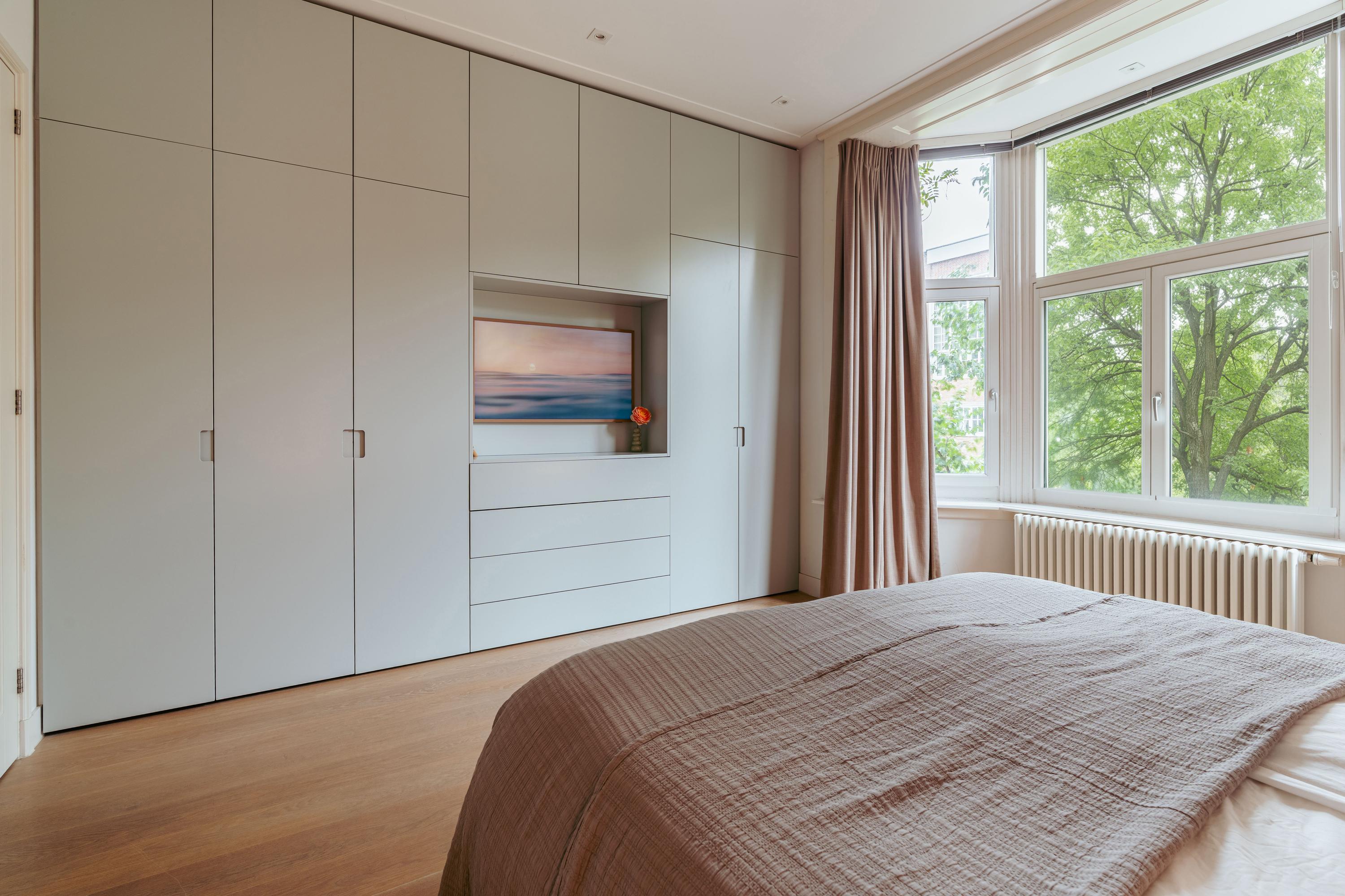 In summary: a characterful apartment featuring high ceilings, original details, modern finishes, a spacious living room with bay window, a luxurious kitchen, a large bedroom with bespoke wardrobes, and a stylish bathroom all set within a magnificent building by F.A. Warners on the beloved De Lairessestraat.