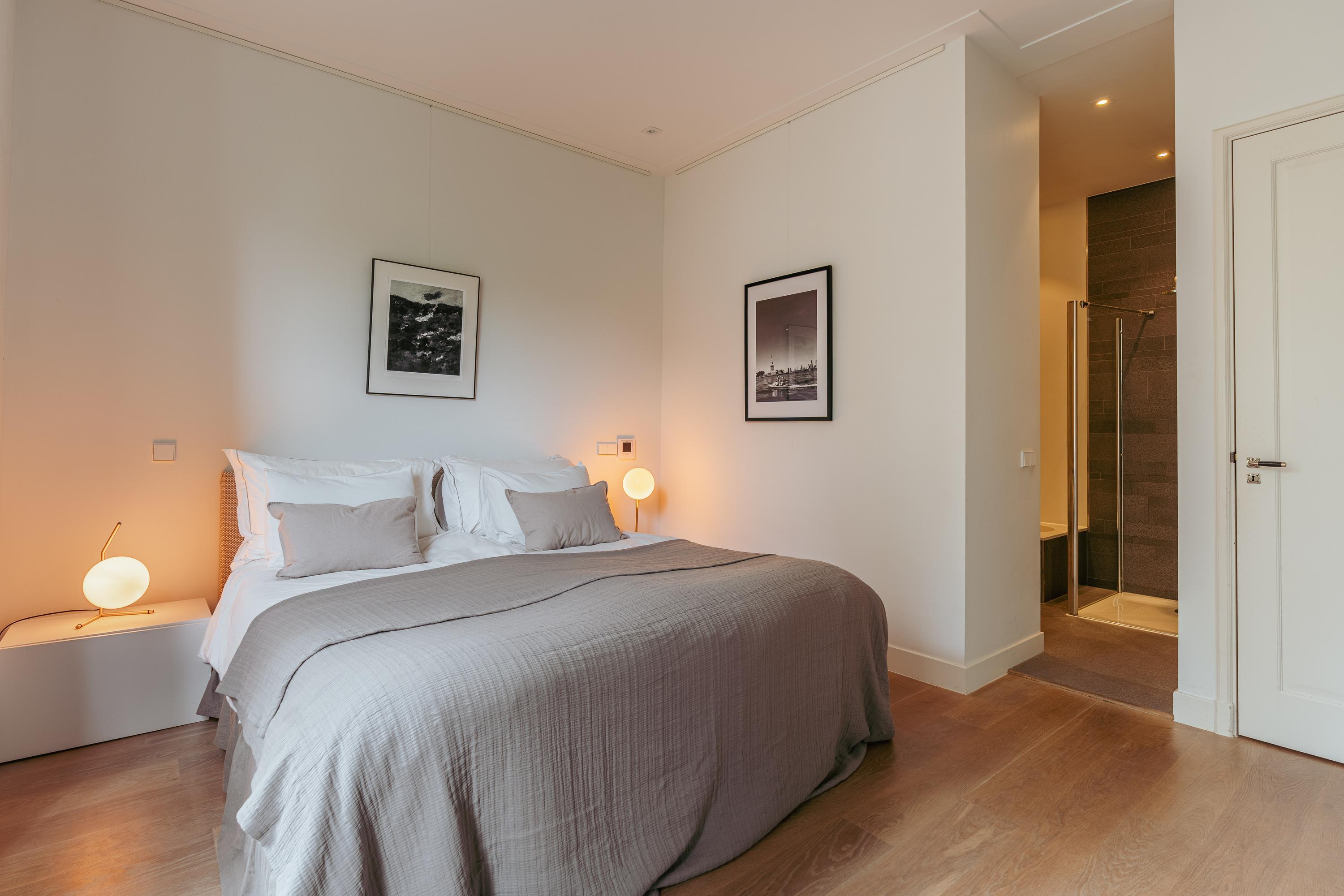 On the right-hand side of the apartment lies the well-proportioned bedroom, fitted with custom-made, ceiling-high wardrobes that also provide space for a built-in television. Here too, a bay window brings in abundant daylight and enhances the sense of space. The en-suite bathroom is equipped with a bathtub, walk-in shower, washbasin cabinet, and connections for a washing machine and dryer. Next to the bathroom is a separate toilet with a small washbasin.