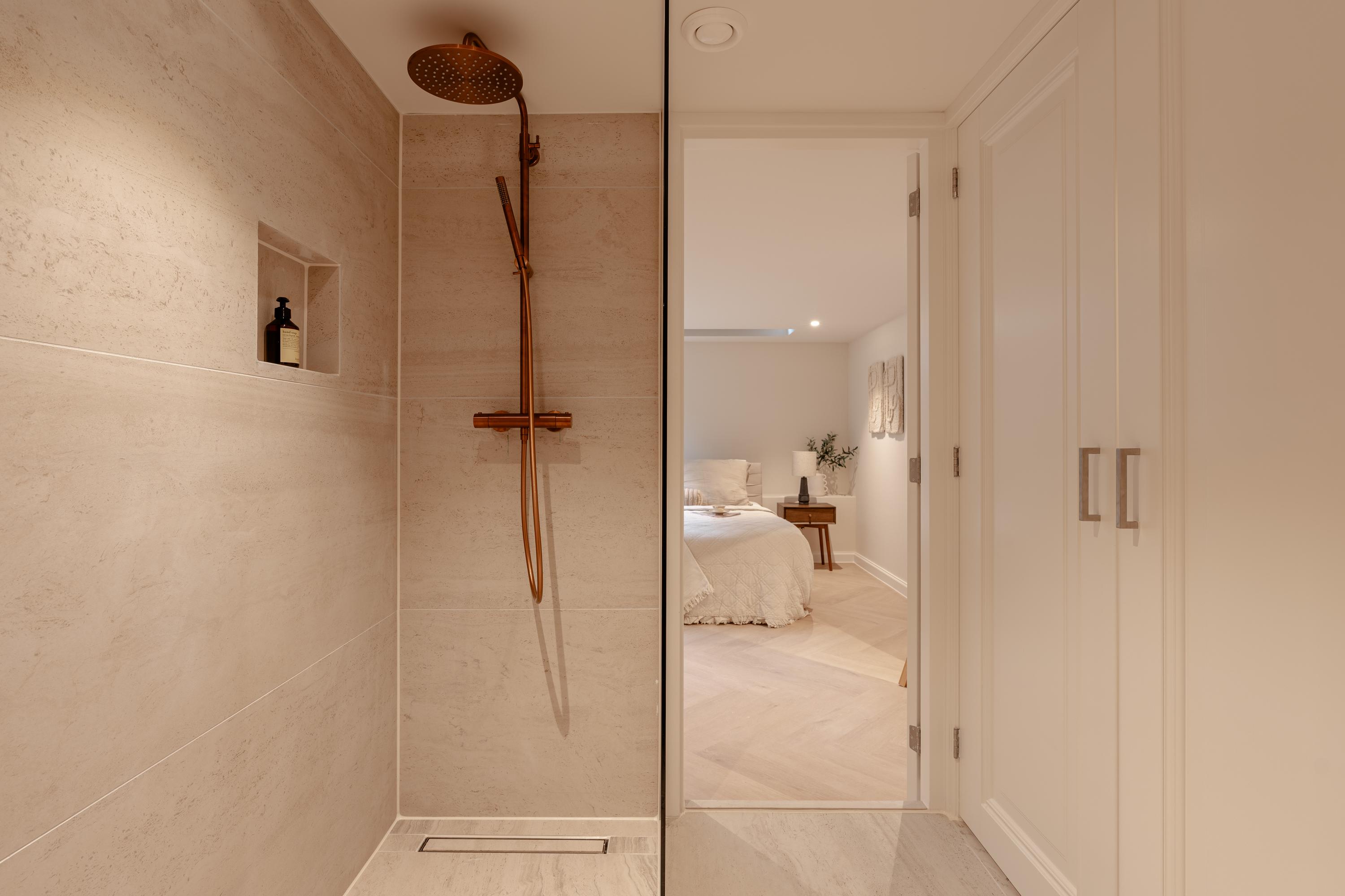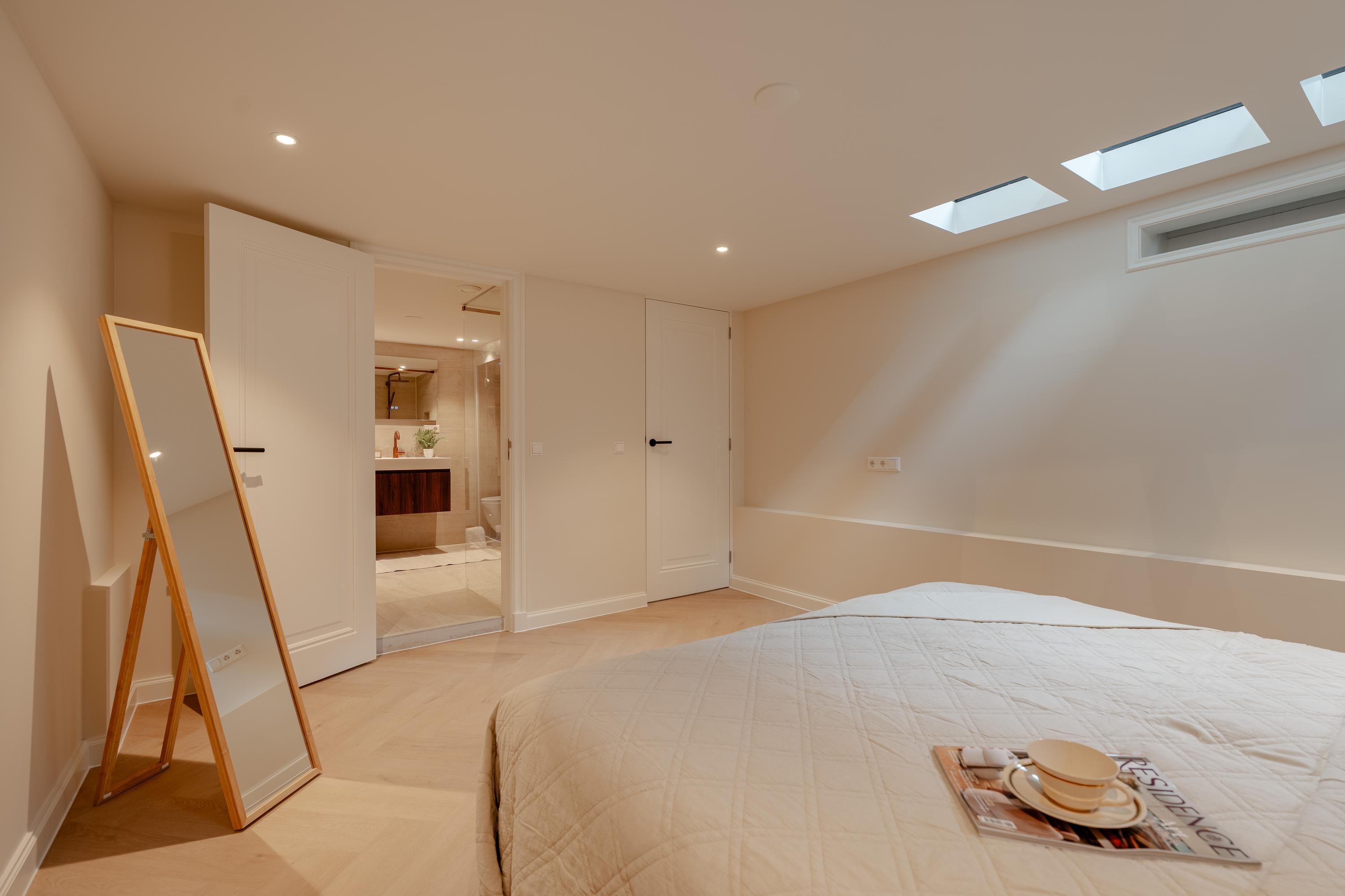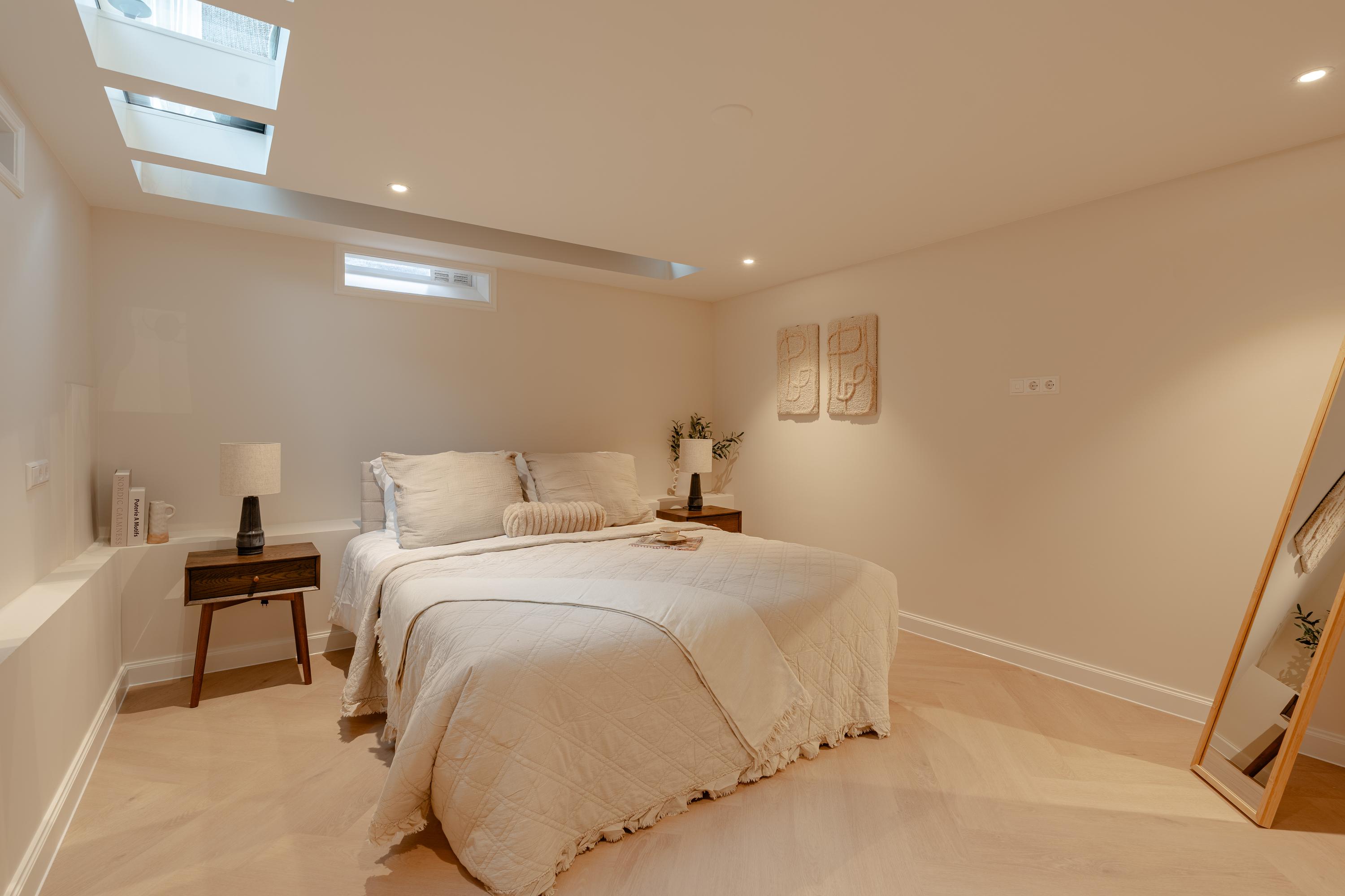 The staircase in the living room leads to the basement. Thanks to the skylights, this floor is remarkably light. Here you will find a spacious bedroom with a luxurious ensuite bathroom, equipped with a walk-in shower, sink, toilet, and sauna. The quiet and intimate atmosphere makes this an ideal space for guests or as a private retreat.