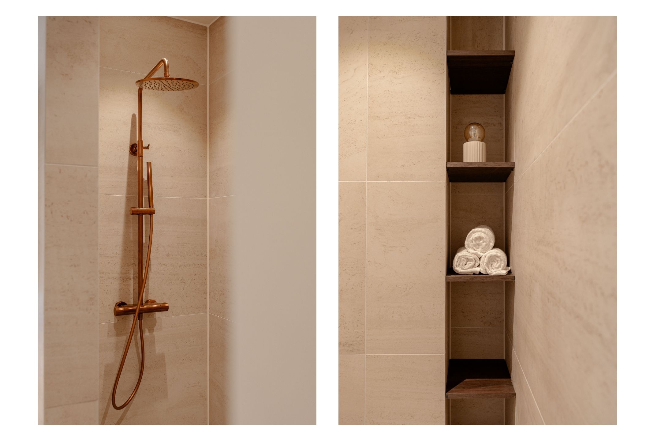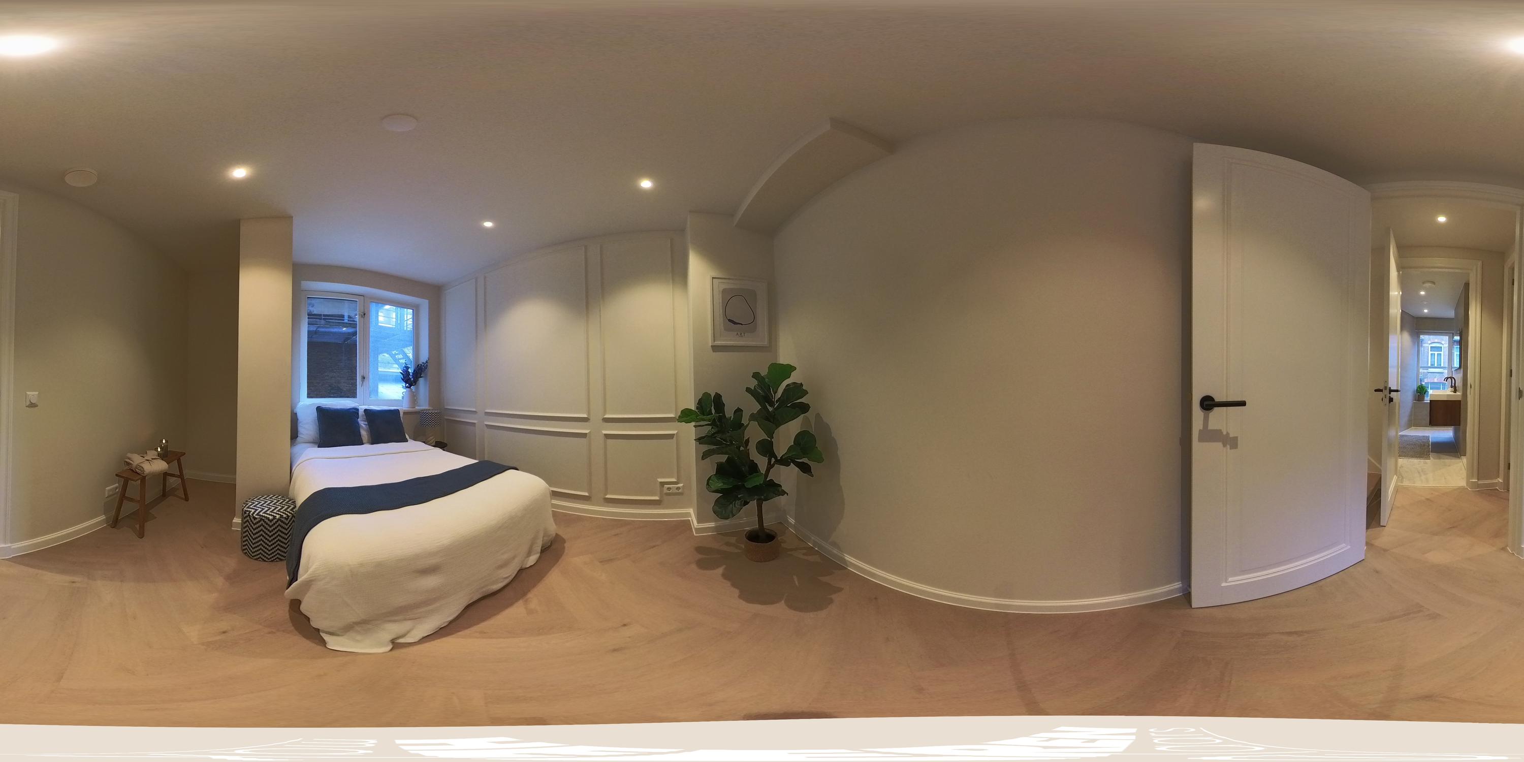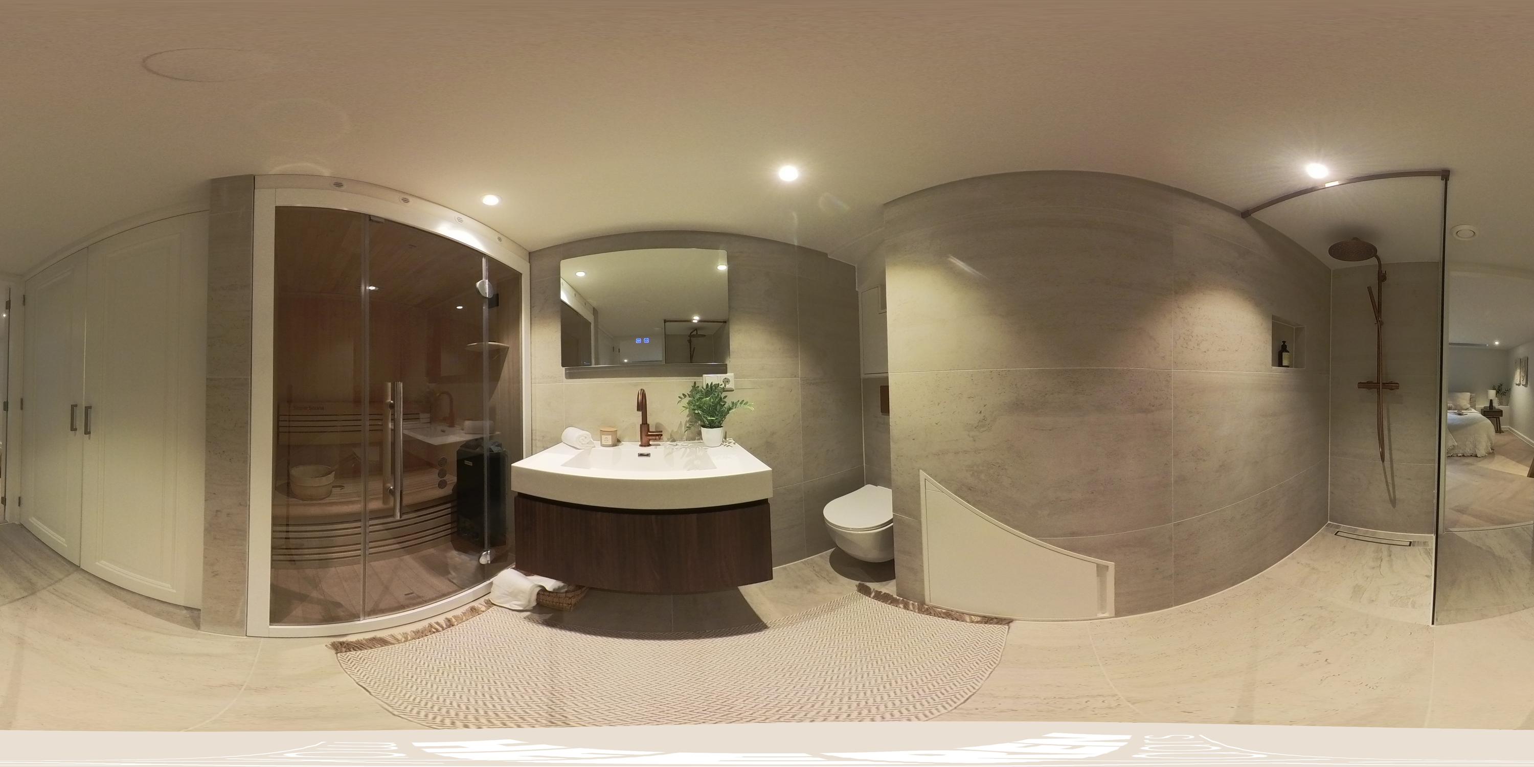 The staircase in the living room leads to the basement. Thanks to the skylights, this floor is remarkably light. Here you will find a spacious bedroom with a luxurious ensuite bathroom, equipped with a walk-in shower, sink, toilet, and sauna. The quiet and intimate atmosphere makes this an ideal space for guests or as a private retreat.