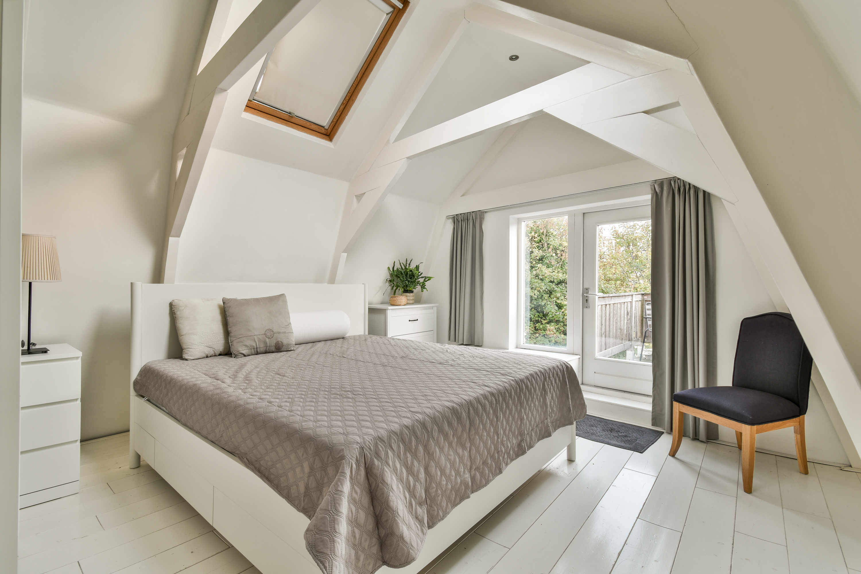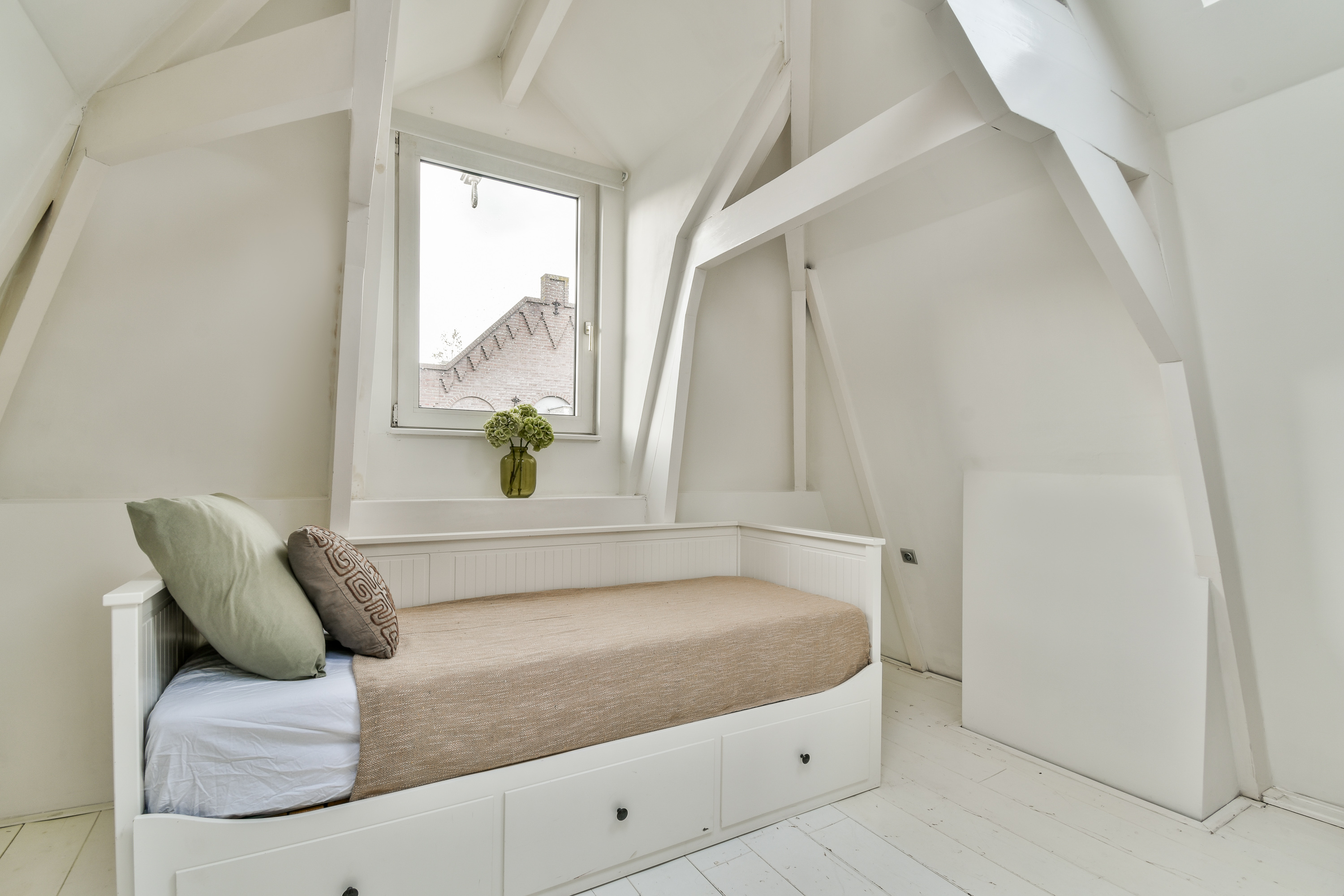 The top floor comprises two generous bedrooms and a second bathroom with a bathtub/shower combination, washbasin, and toilet. The main bedroom at the rear provides access to a balcony of approximately 4.5 m², while the second bedroom is located at the front. With its charming roof structure, dormer windows, and skylights, this floor offers a warm and characterful atmosphere with abundant natural light.