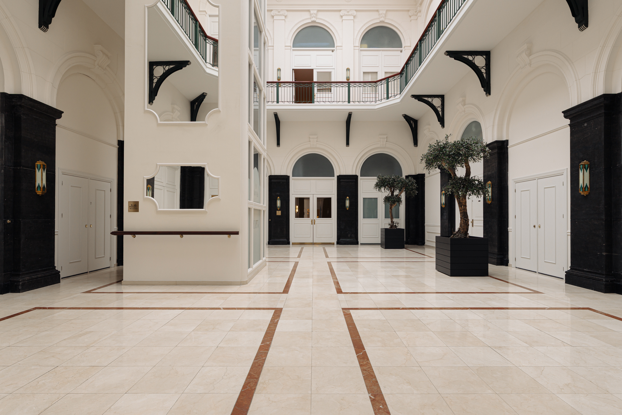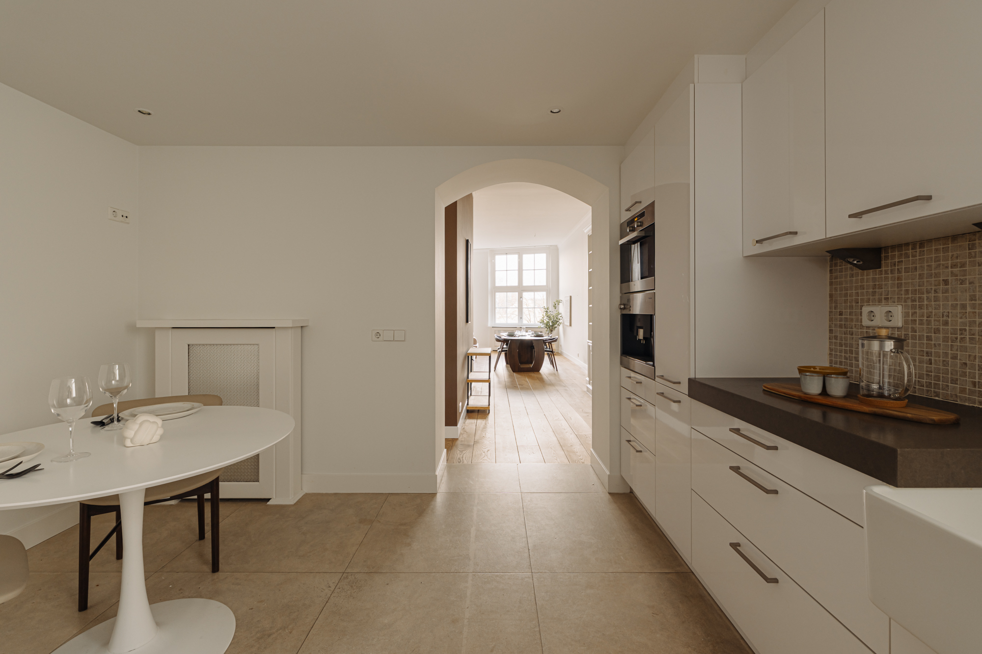 Via the impressive entrance, you reach the apartment on the third floor. Access is provided via the well-maintained staircase or one of the two lifts. Upon entering, you step into the central hallway, from which double French doors lead into the spacious living room. This impressive space is situated at the front and features large windows, allowing an abundance of natural light and offering stunning views of the canals.