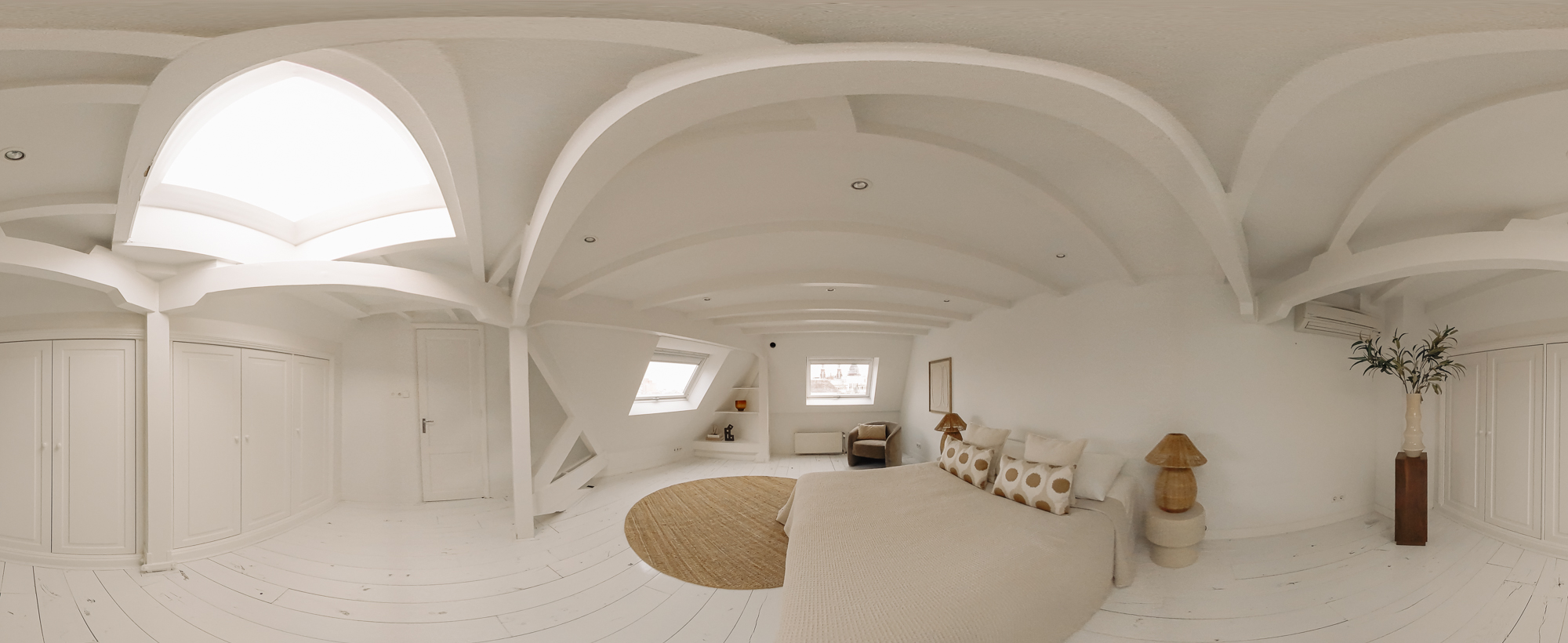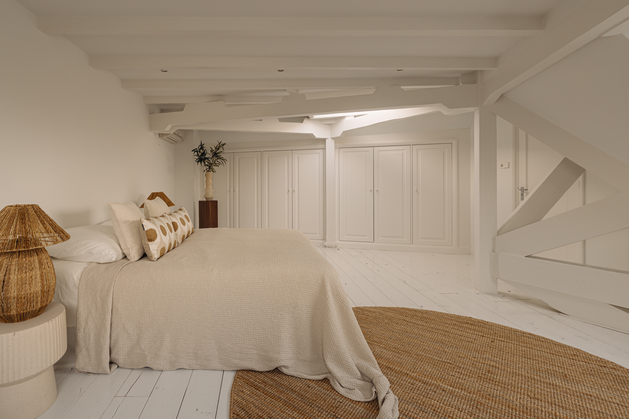 The second bedroom is situated on the fifth and top floor and comes with air conditioning, built-in wardrobes, and roof windows that flood the space with daylight. From the landing, a separate WC with washbasin is accessible.