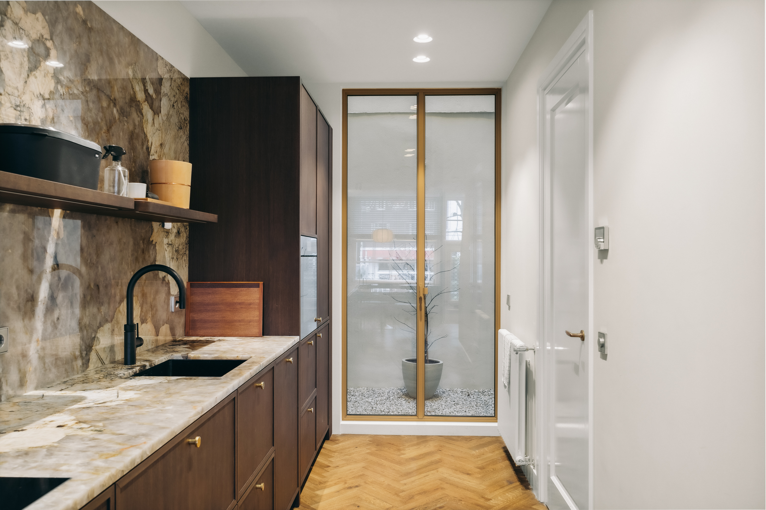 The property is accessed from the front, leading into the hallway with a staircase to the slightly elevated bel étage. This level features an inviting living/dining kitchen with a high-end, custom-made kitchen. The space is characterized by high ceilings, an oak herringbone parquet floor, and pleasant natural light. French doors provide access to a charming patio. A separate toilet is also located on this floor.