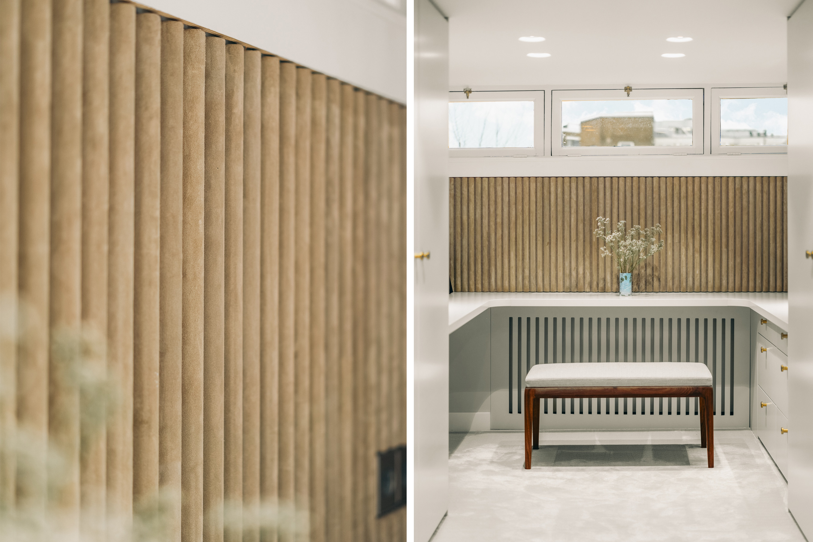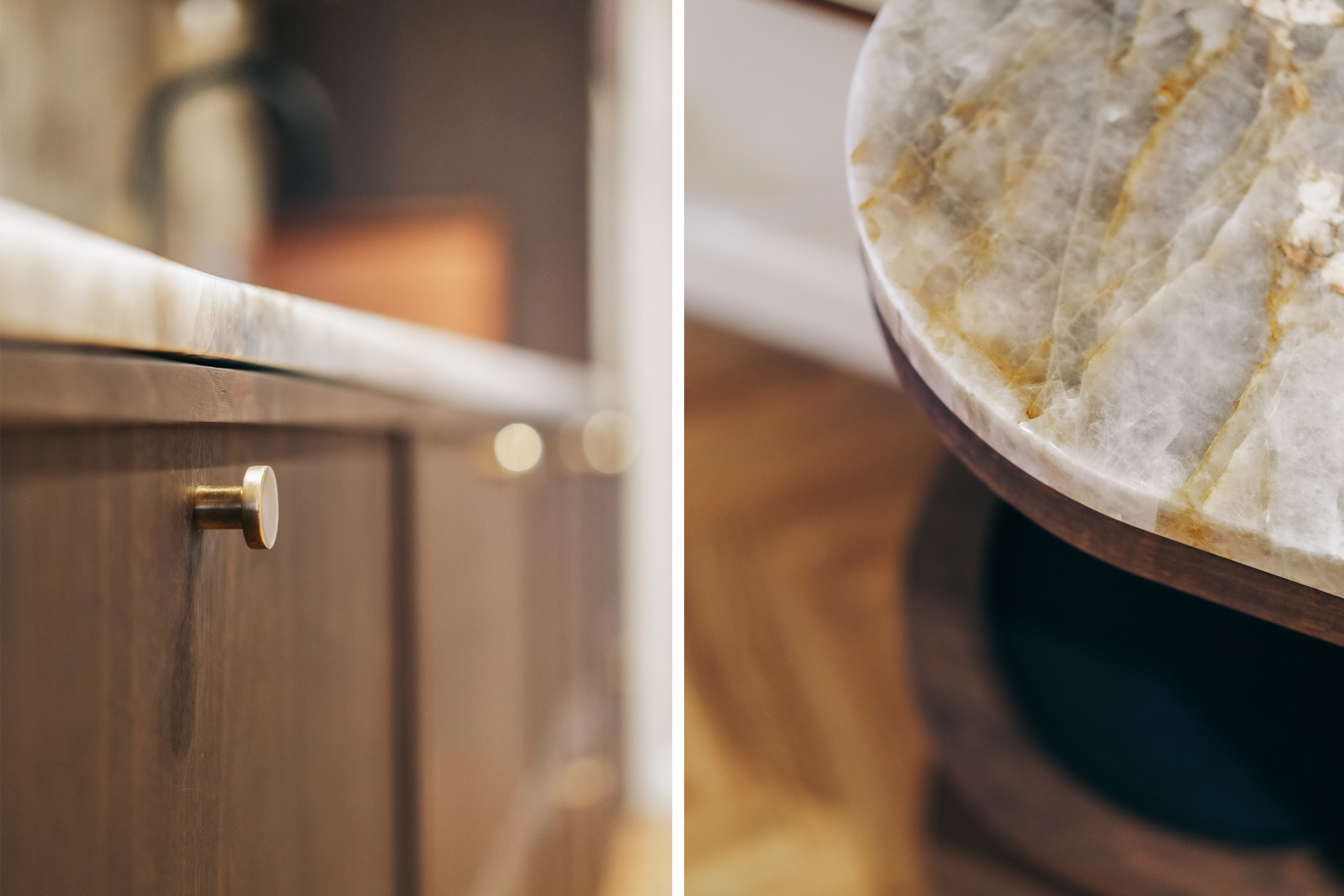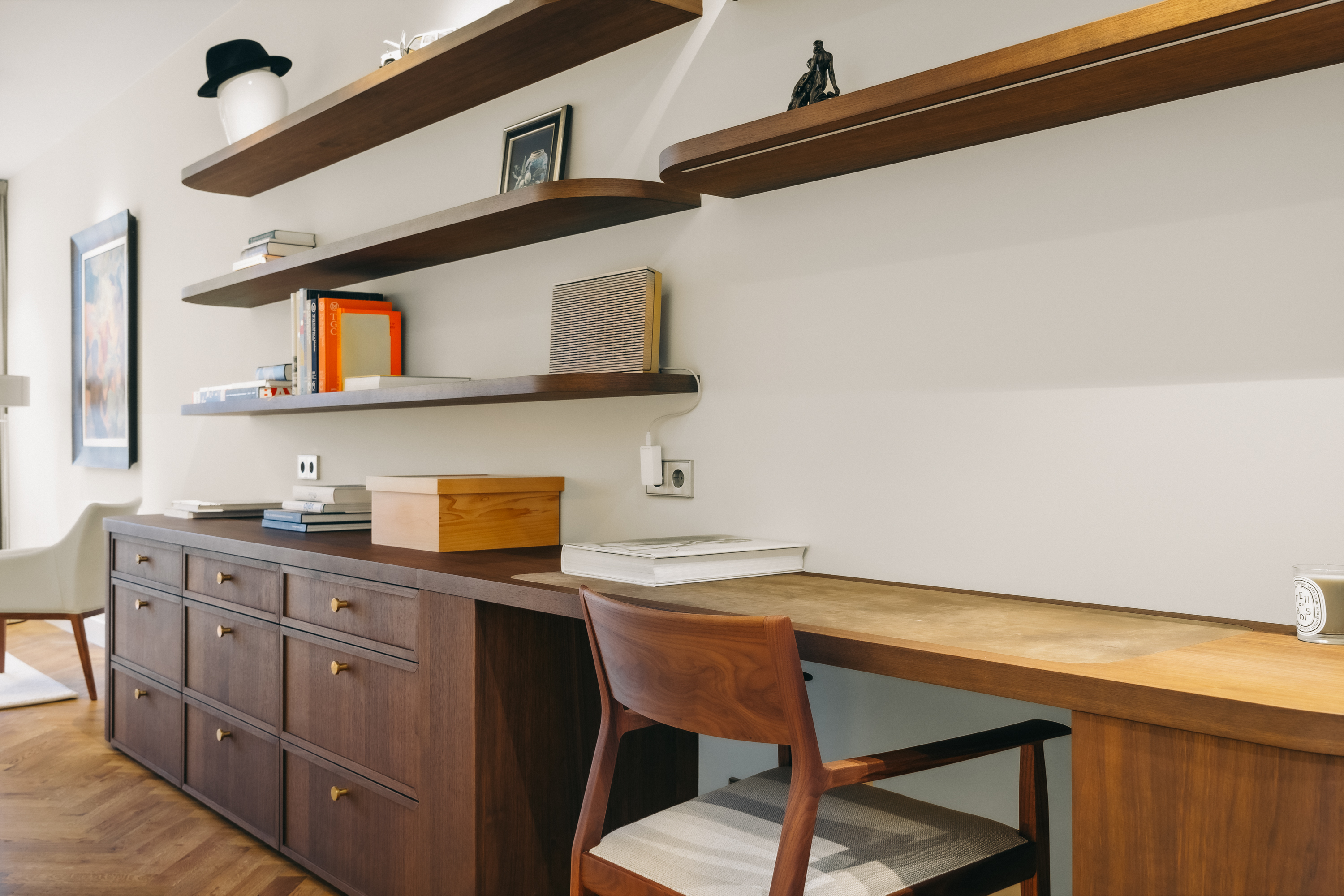 Along the wall, there is a custom-built cabinet with an integrated desk, finished in warm walnut veneer, providing generous storage and an elegant appearance. This bespoke solution makes the space highly suitable as a workspace, reading room, or reception area.