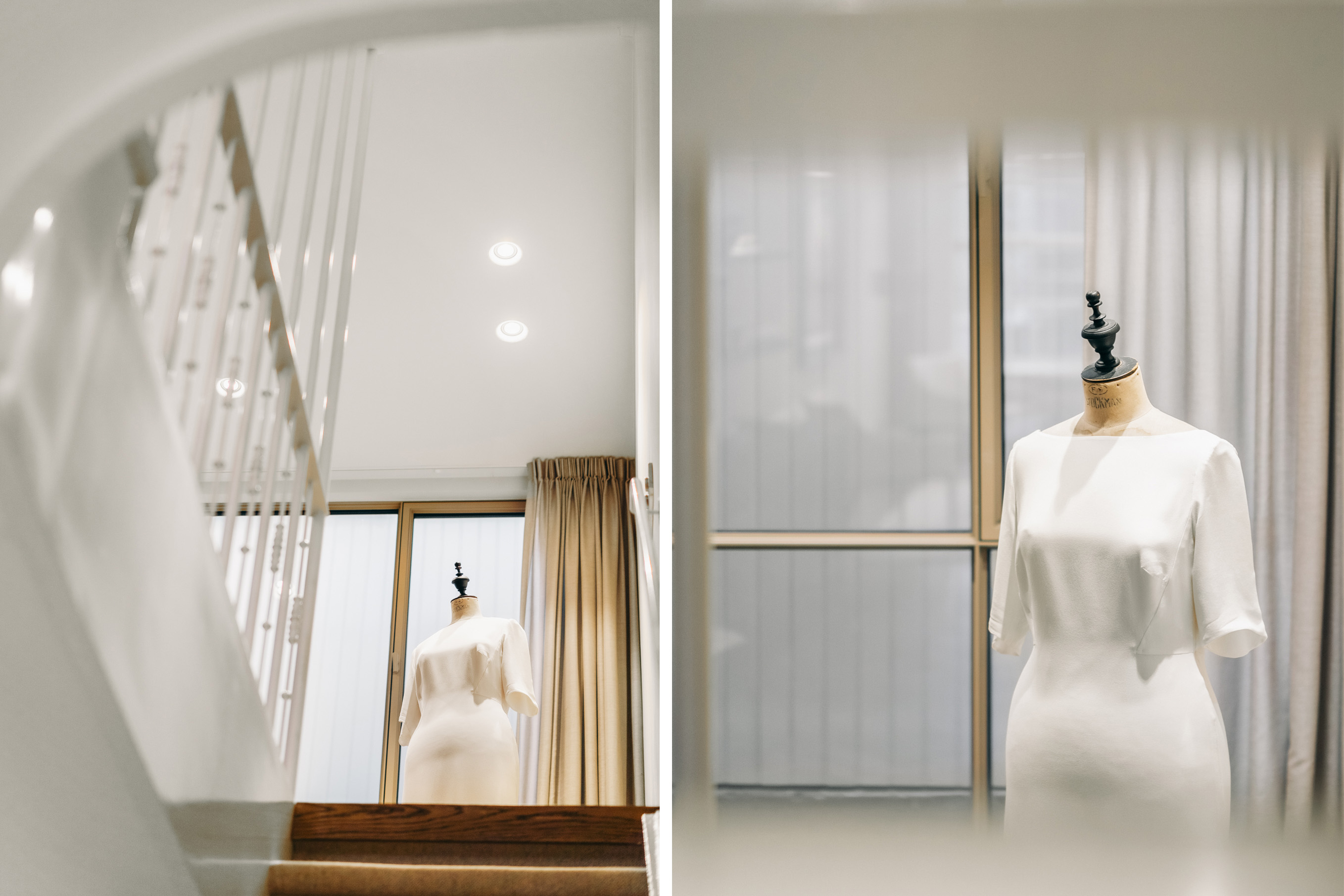 The third floor is arranged as a generous walk-in wardrobe with custom-built closets, a distinctive wall finish, and a skylight providing natural light. The space is also fitted with air conditioning.