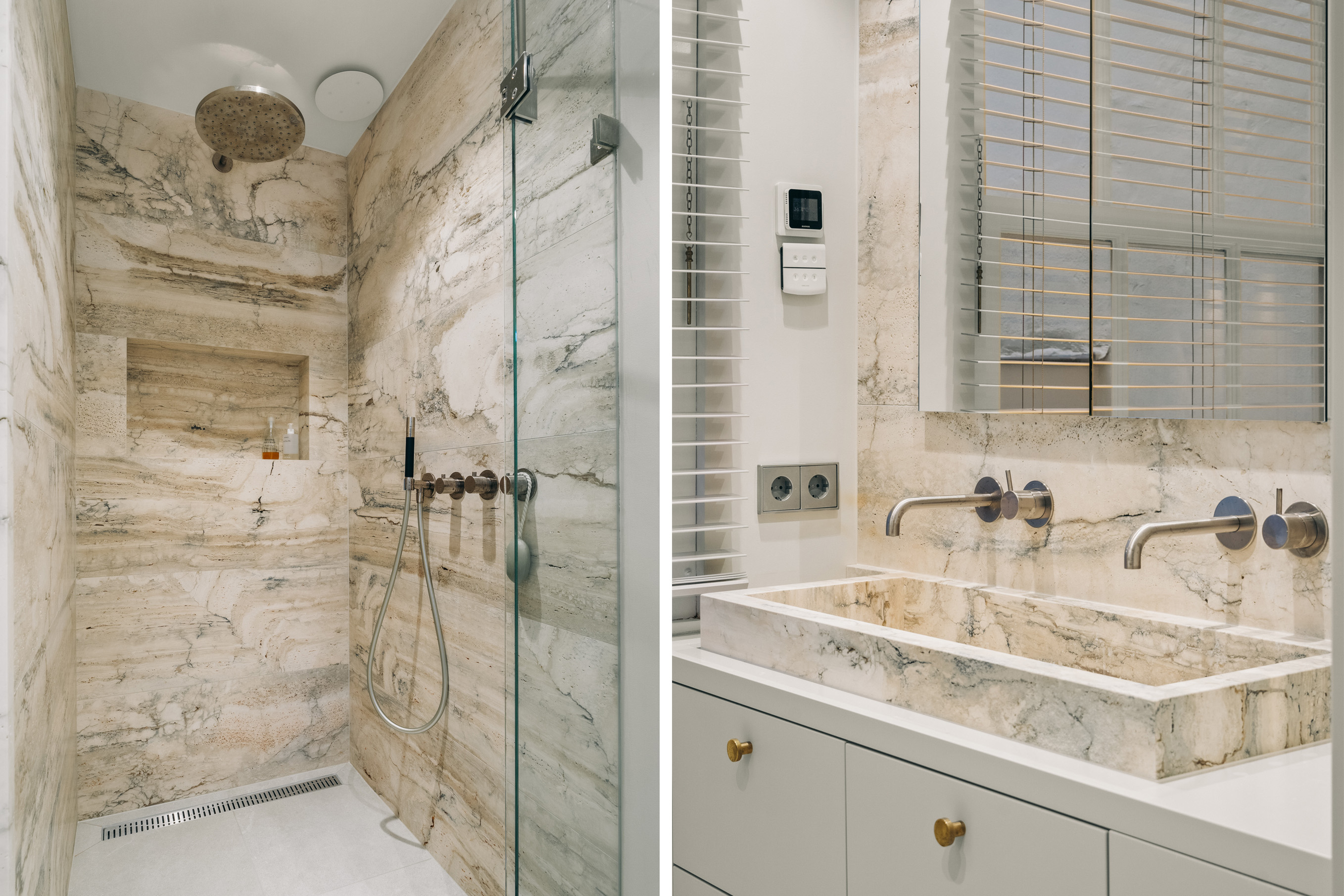 - Sanitary areas finished with travertine walls and ceramic floor tiles;