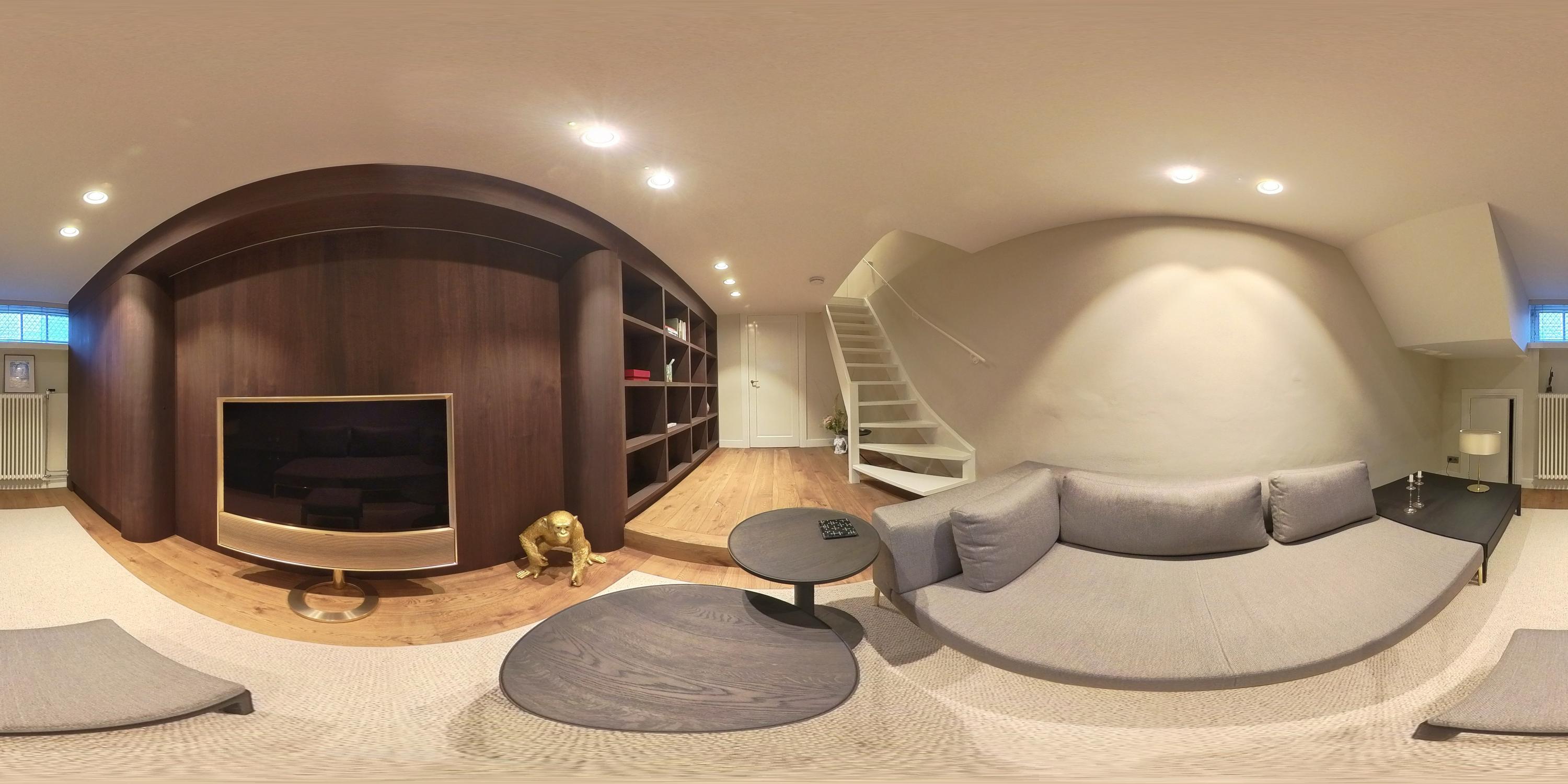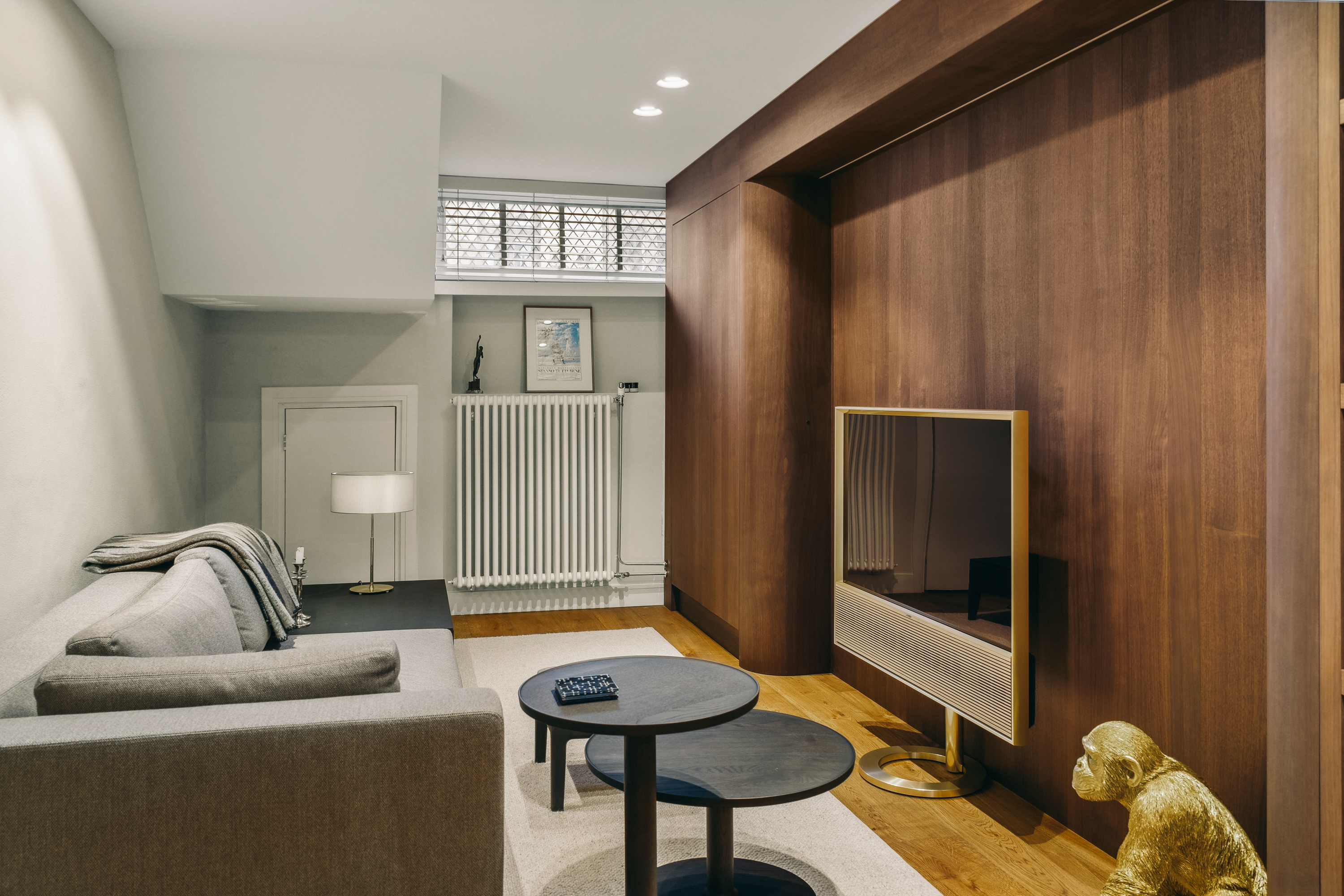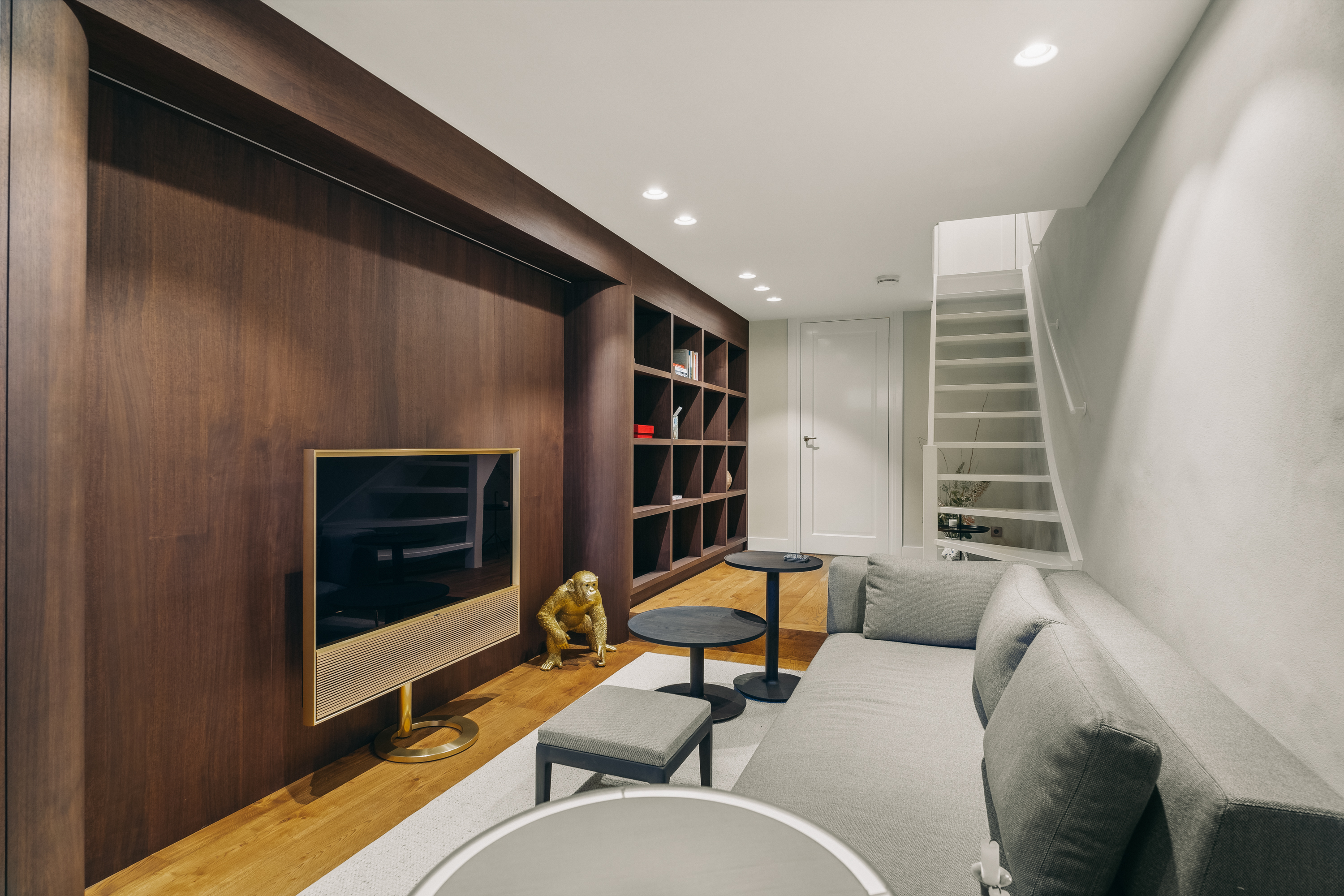 The lower ground floor is arranged as a comfortable and atmospheric living space, ideal as a second lounge. The room features custom-built cabinetry in warm wood tones and offers a calm, sheltered ambiance.
