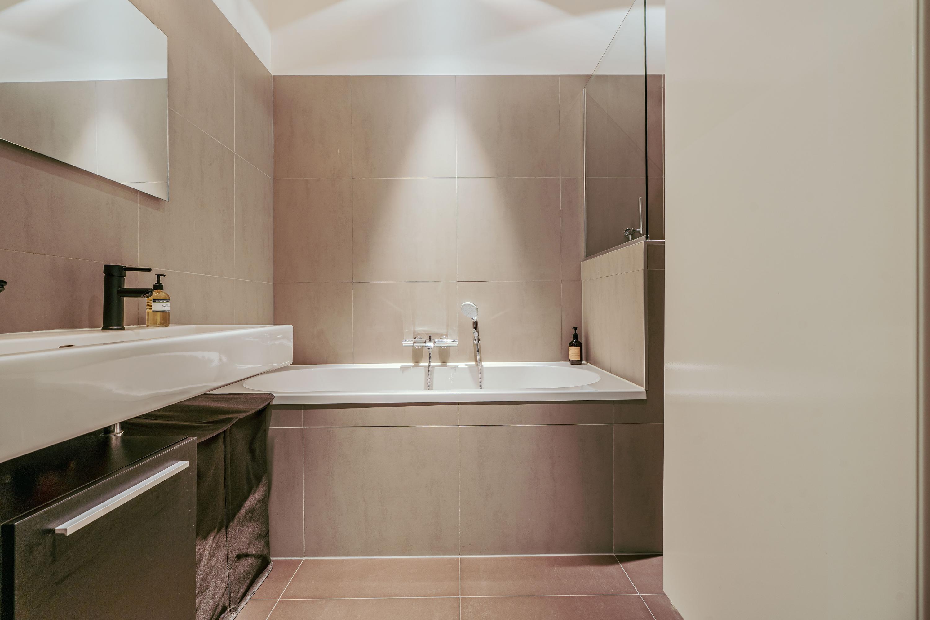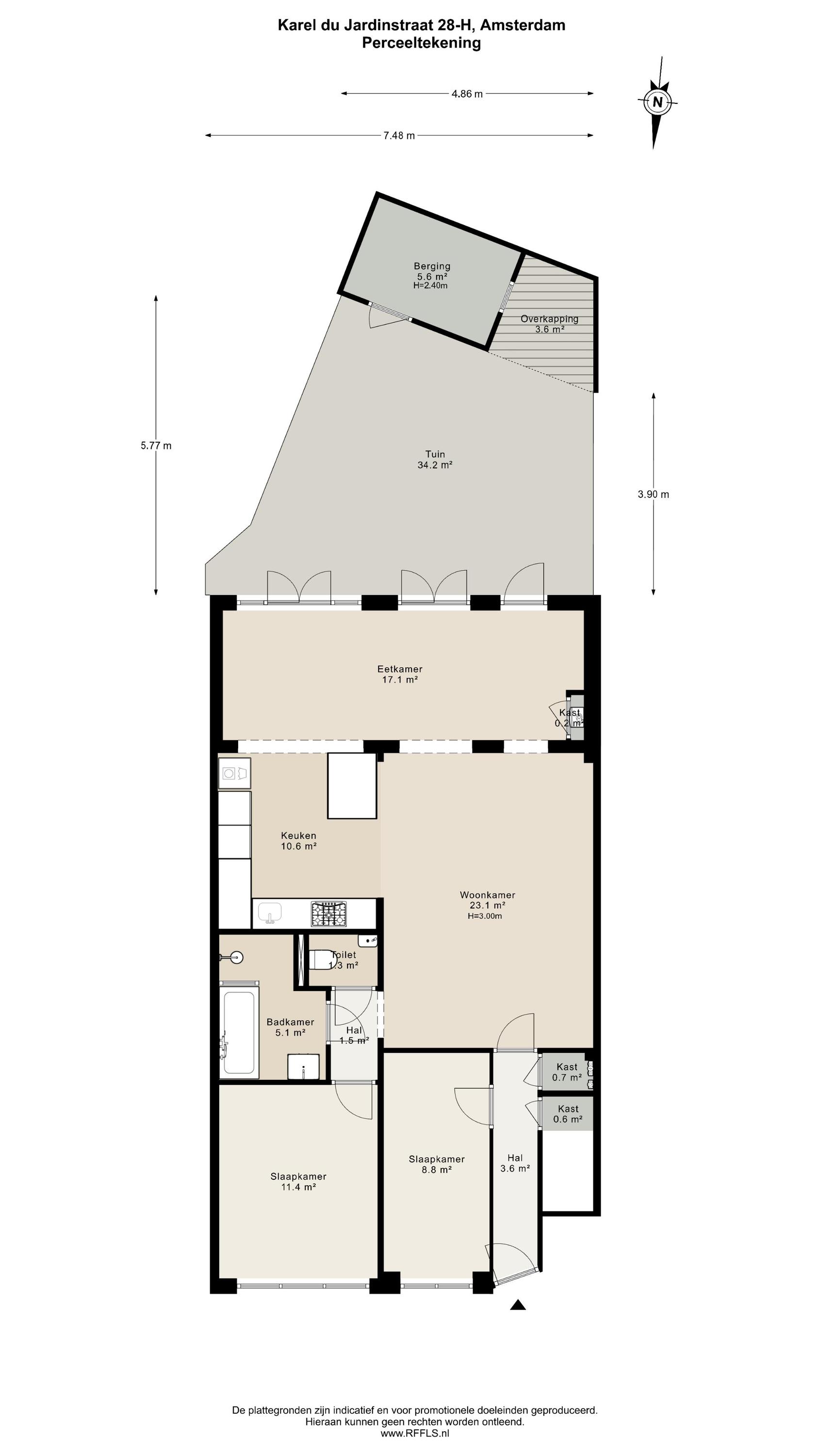 Via de hal bereikt u de ruime en lichte woonkamer, evenals de eerste goed bemeten slaapkamer aan de voorzijde van de woning. In de hal bevinden zich bovendien praktische inbouwkasten voor extra bergruimte. De woonkamer strekt zich uit tot aan de achterzijde van het appartement en profiteert van een prachtige lichtinval, mede dankzij de 2,5 meter diepe uitbouw, de grote raampartijen en de openslaande deuren naar de tuin. Indien gewenst kan hier eenvoudig een derde slaapkamer worden gerealiseerd. De zonnige achtertuin van circa 38 m² is gelegen op het zuiden en biedt uitzonderlijk veel privacy. Bovendien beschikt de tuin over een handige schuur met overkapping, ideaal voor extra opslag of fietsen. De moderne open keuken vormt het hart van de woning en is uitgerust met een 5-pits gasfornuis met afzuigkap, combi-oven, vaatwasser, koel-vriescombinatie, een extra vriezer, een Quooker en tot slot plintverwarming. Tevens beschikt de keuken over een karakteristiek eiland waaraan je gezellig hoog zit. Ook de wasmachine en droger zijn fraai weggewerkt achter een kast. De tweede royale slaapkamer bevindt zich eveneens aan de voorzijde en biedt voldoende ruimte voor een king-size bed en een ruime kastenwand. Centraal in het appartement treft u de stijlvolle badkamer, voorzien van een ligbad, dubbele wastafel met meubel en een inloopdouche. Aangrenzend bevindt zich nog een separaat toilet met fonteintje.