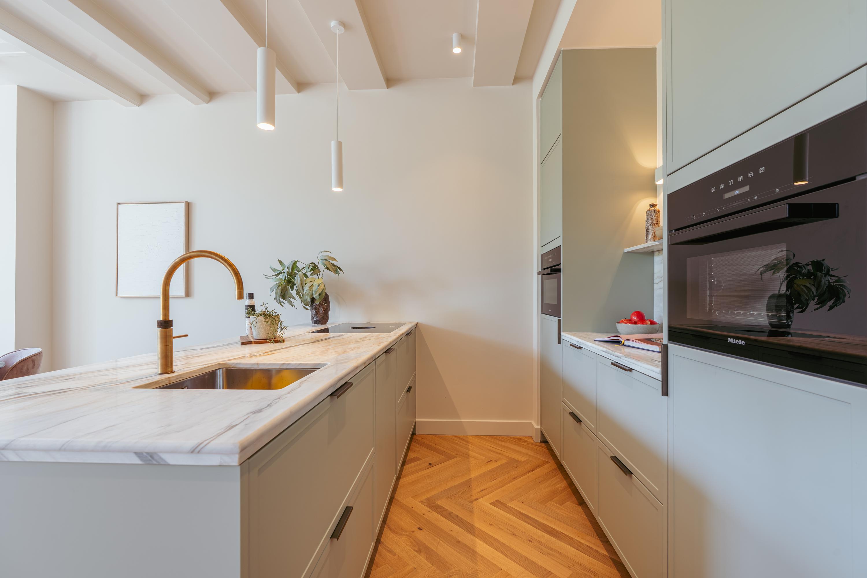 Entering via the stately communal hall, a split-level layout encourages a graceful flow between living and dining. The kitchen, equipped with a marble countertop, brass accents, and select appliances including Siemens Studioline ovens and a Bora induction cooktop, fosters both culinary excellence and convivial gatherings. A central island and marble-topped bar invite unhurried mornings and elegant evenings alike.