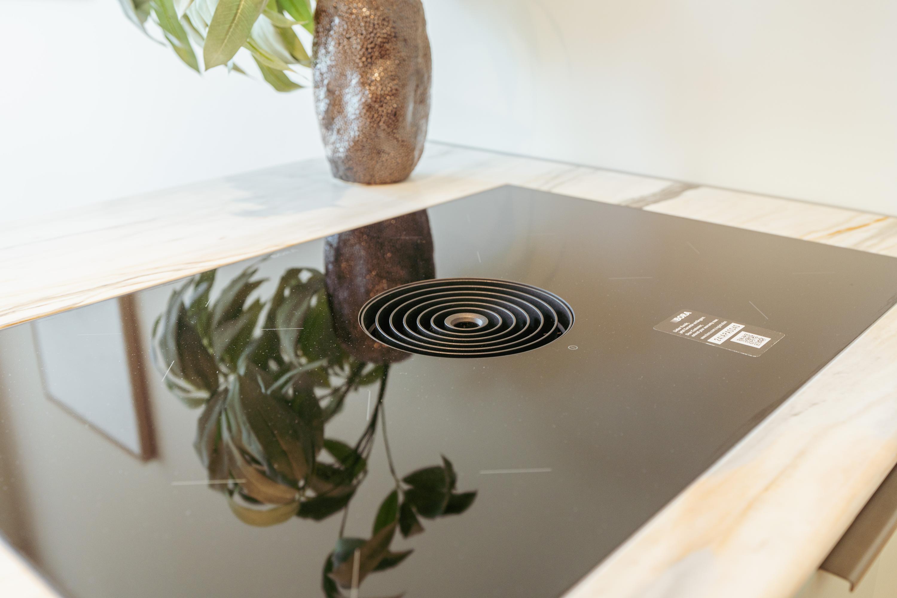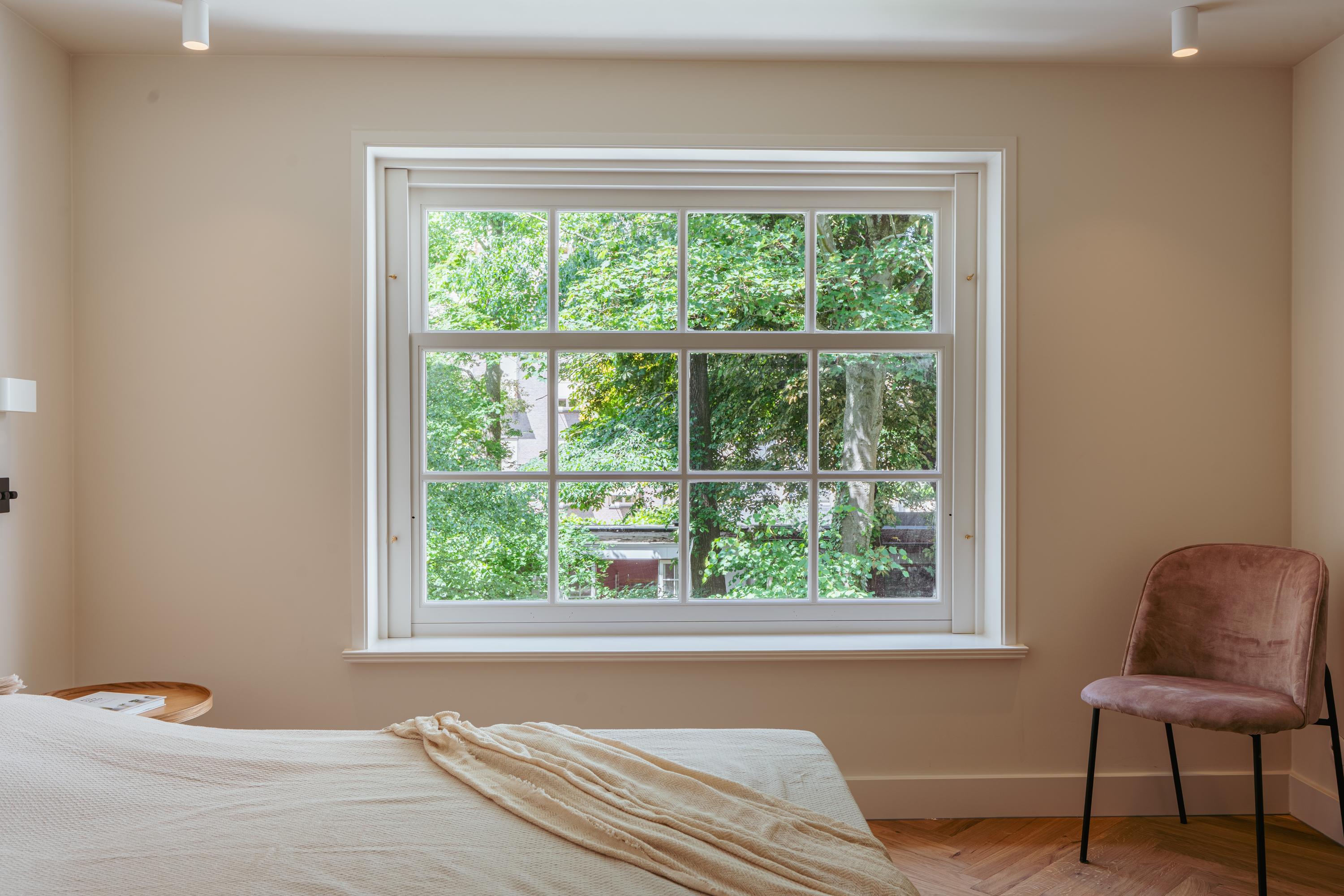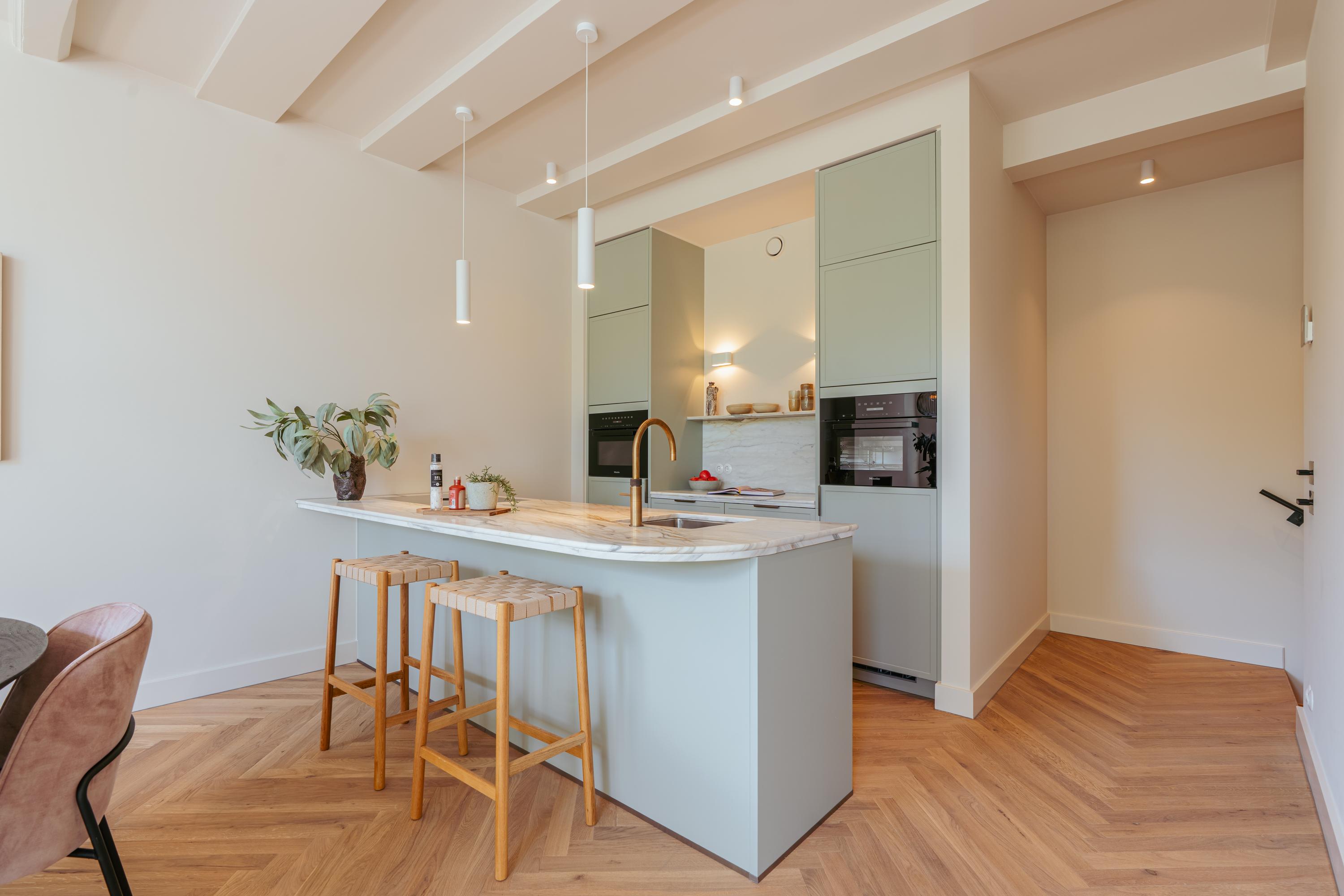 The living area and open kitchen are situated on a split level, creating a playful and spacious effect. The kitchen is equipped with every imaginable built-in appliance, including a Quooker, Siemens Studioline combination oven and oven, Bora induction cooktop with integrated extractor, dishwasher, and ample storage space. A marble countertop and brass accents complete the elegant design. The bar area, featuring a marble top and wooden bar stools, makes the space perfect for both elaborate cooking and relaxed entertaining. At the front, the living room features three impressive tall windows offering stunning views of the majestic Keizersgracht. Natural light floods the space, while original ceiling beams add a warm, atmospheric touch. A modern gas fireplace forms the cozy centerpiece of this inviting room.