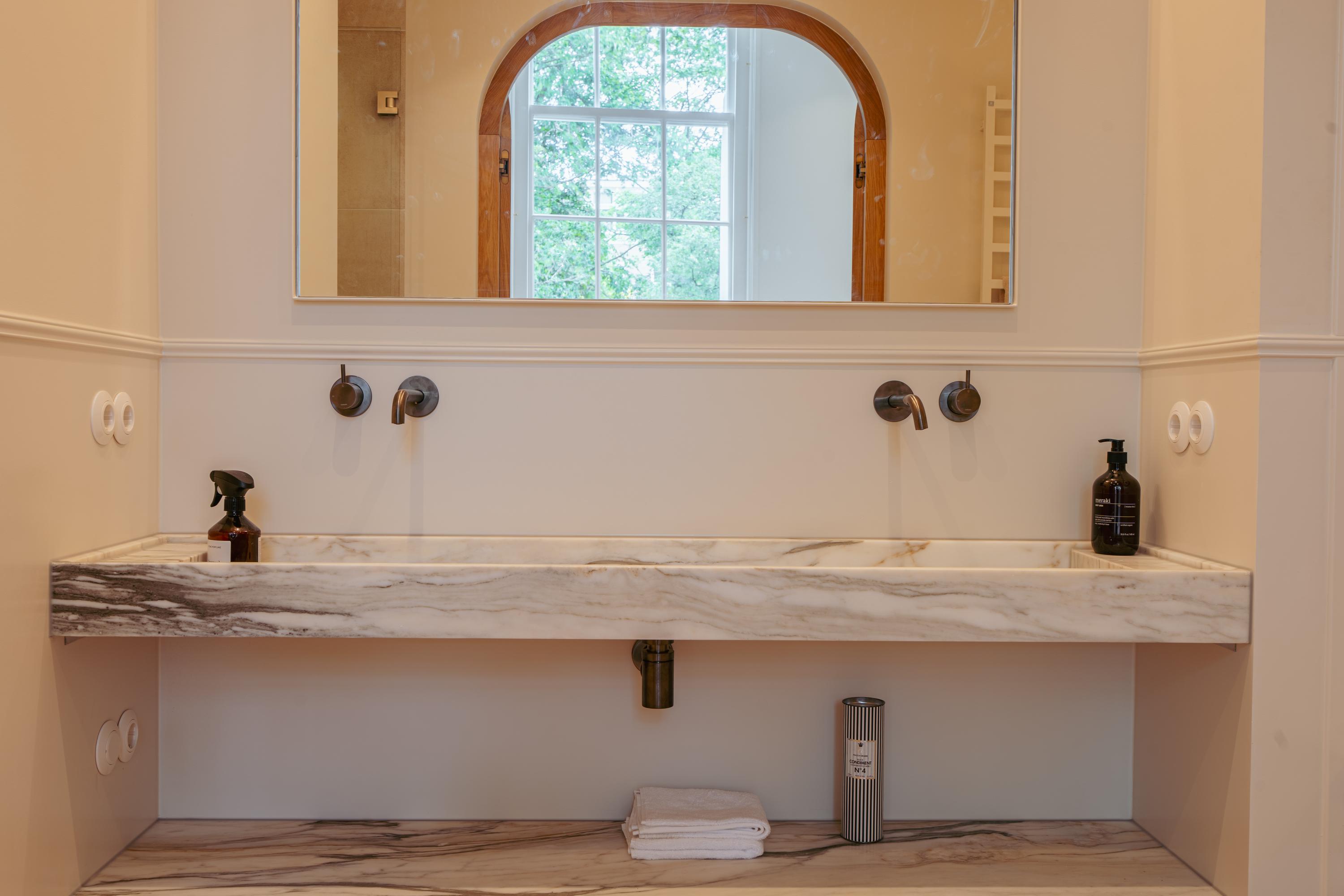 Through the hallway, you reach the primary bedroom with an en-suite bathroom. Characterful wooden arched doors lead to a spacious bathroom with a bathtub and double sink, both finished in beautiful marble. French doors open to a walk-in rain shower. The bedroom features a wall of custom-made built-in wardrobes, with additional storage above the sink area. At the rear of the apartment, you will find the second bathroom with a walk-in rain shower and double sink, as well as the second generously sized bedroom overlooking the lush green gardens.