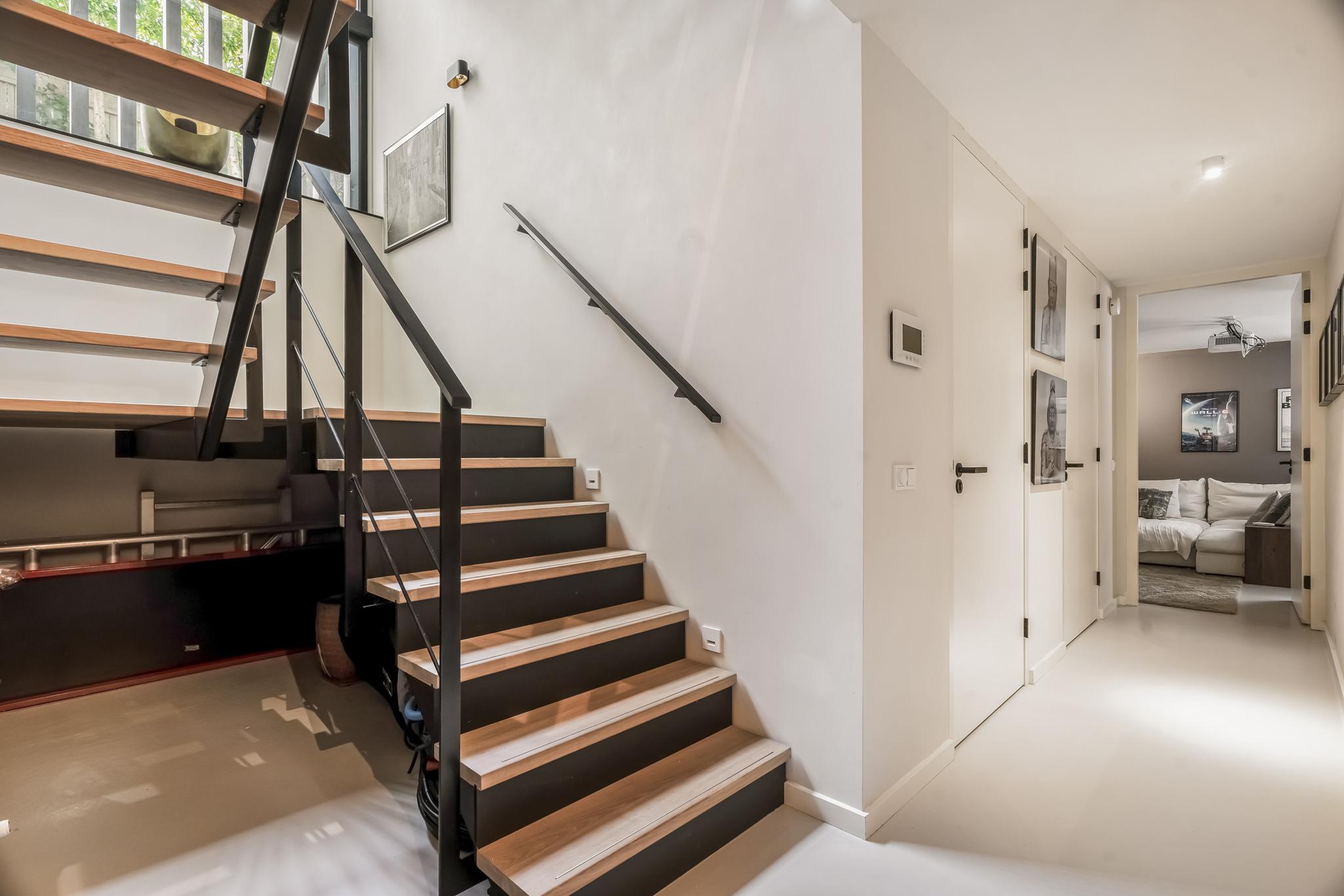 From the spacious hall with high ceilings, you enter the generous living area with large glass windows that immediately offer a beautiful view. The space has an impressive ceiling height and a cozy fireplace. Various sliding doors lead to the carefully landscaped garden with its own dock on the water. The garden features a large hardwood terrace, lawn and green borders.