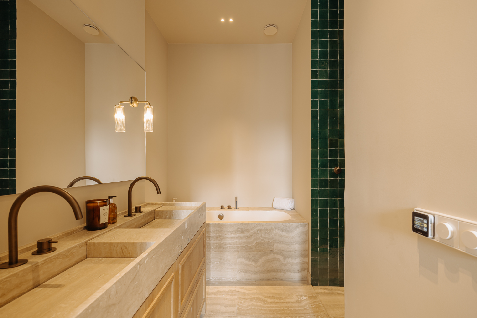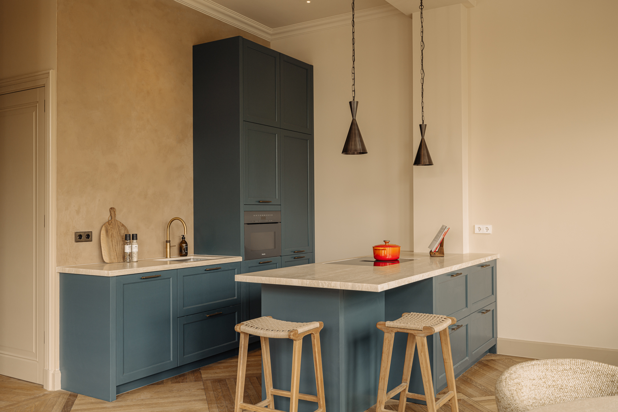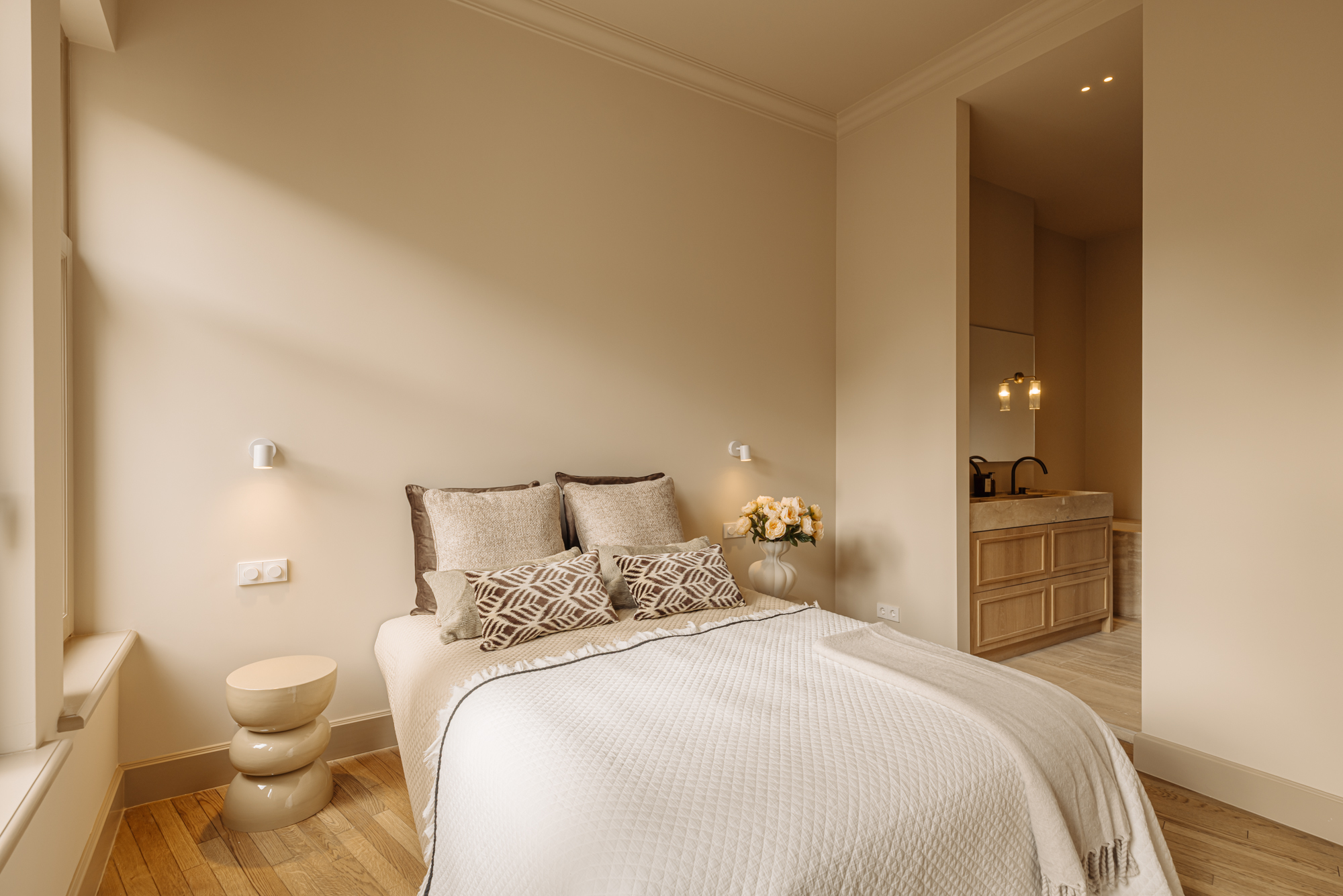 The open plan living room rises to impressive ceiling heights, creating a sense of volume and calm. At its center is a modern kitchen, where a travertine-topped island and high-end appliances, including an induction hob with integrated extractor and Quooker, set a stage for daily life and entertaining. Two generously proportioned bedrooms each provide air conditioning and private en-suite bathrooms, distinguished by carefully selected brass fixtures and zellige tiles. Storage echoes the same attention to detail, with a €10,000 buyer's voucher allowing further individualization.