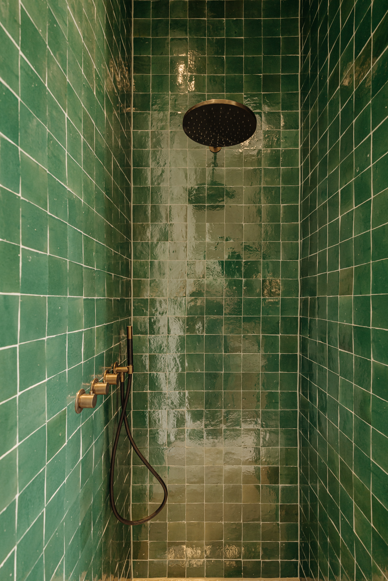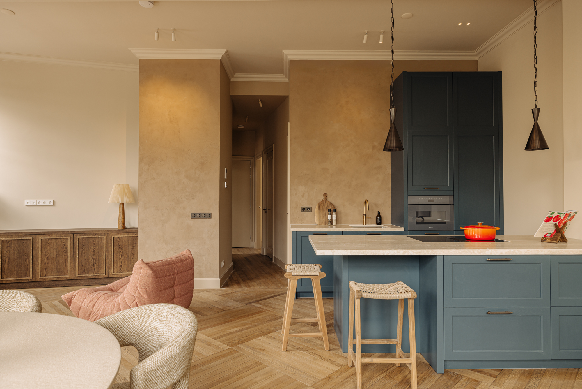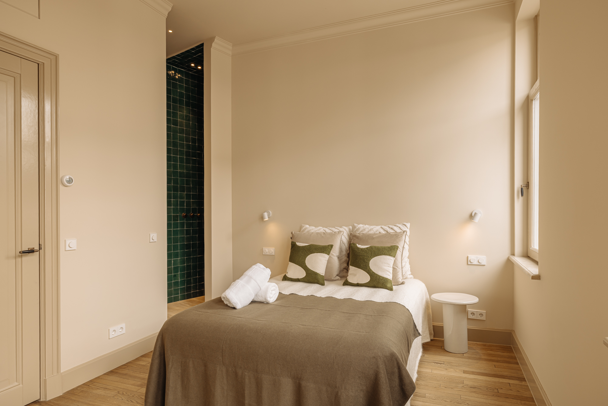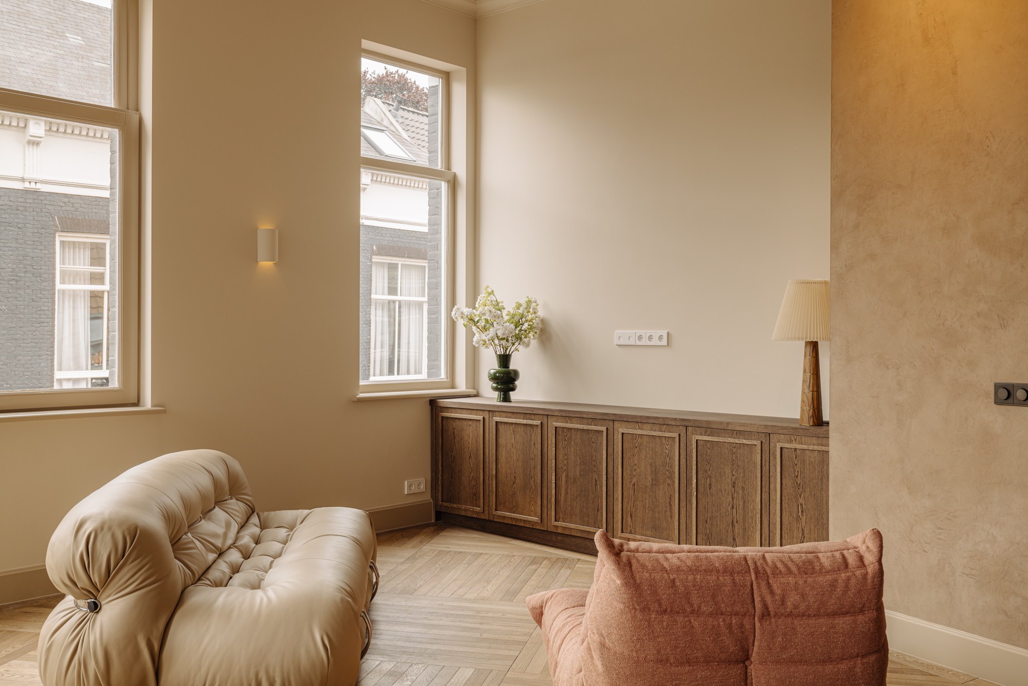 The open plan living room rises to impressive ceiling heights, creating a sense of volume and calm. At its center is a modern kitchen, where a travertine-topped island and high-end appliances, including an induction hob with integrated extractor and Quooker, set a stage for daily life and entertaining. Two generously proportioned bedrooms each provide air conditioning and private en-suite bathrooms, distinguished by carefully selected brass fixtures and zellige tiles. Storage echoes the same attention to detail, with a €10,000 buyer's voucher allowing further individualization.