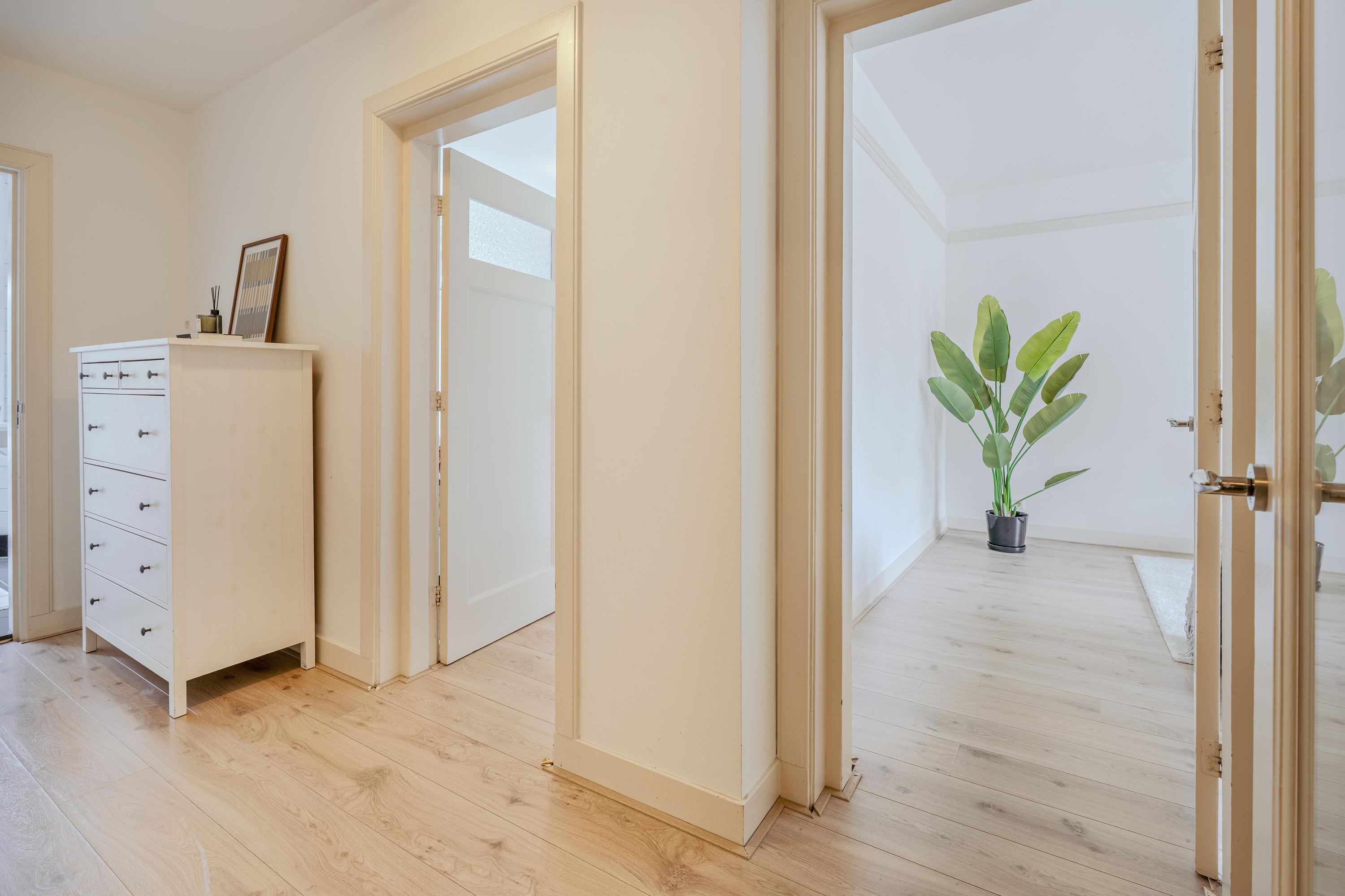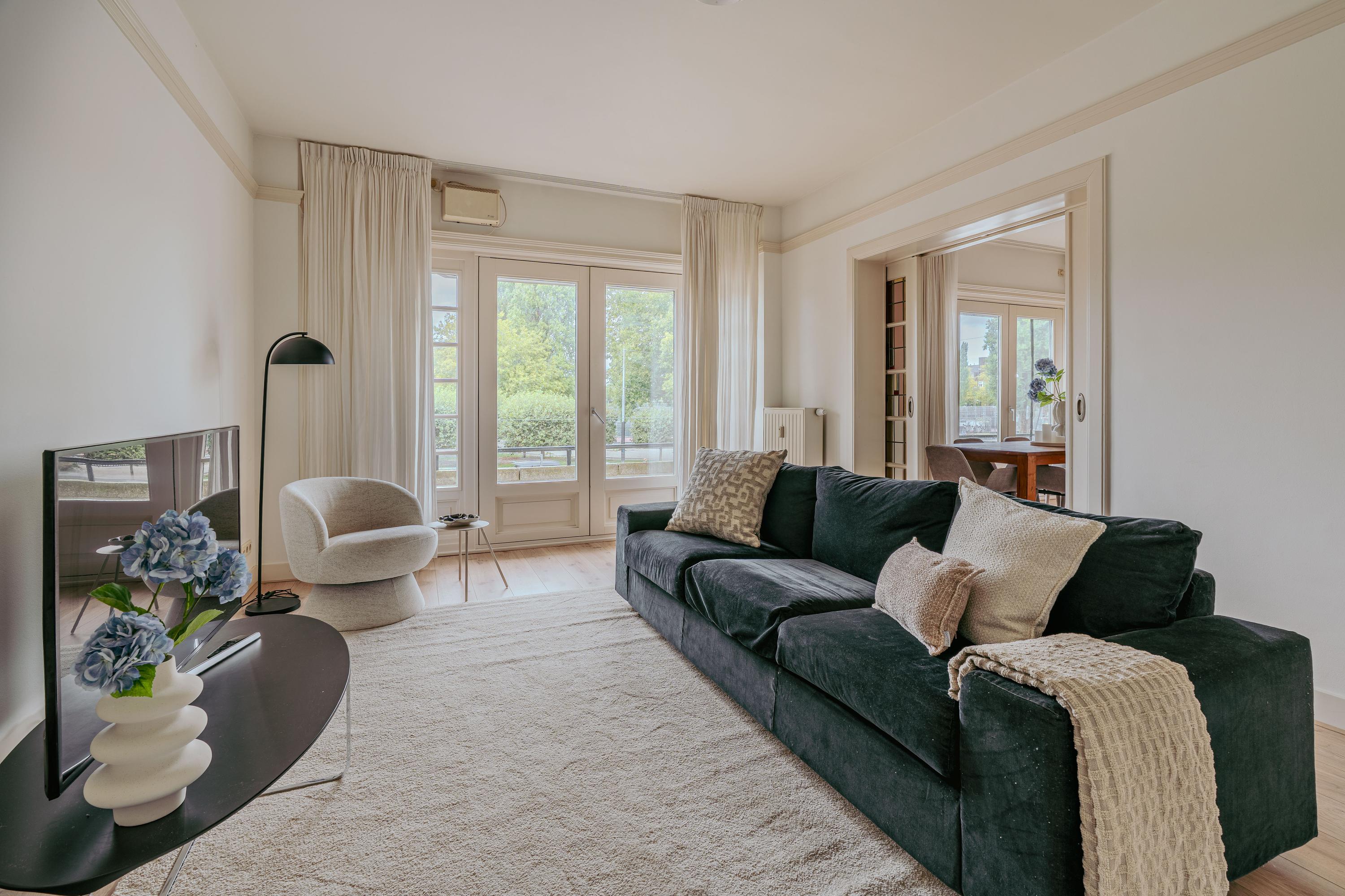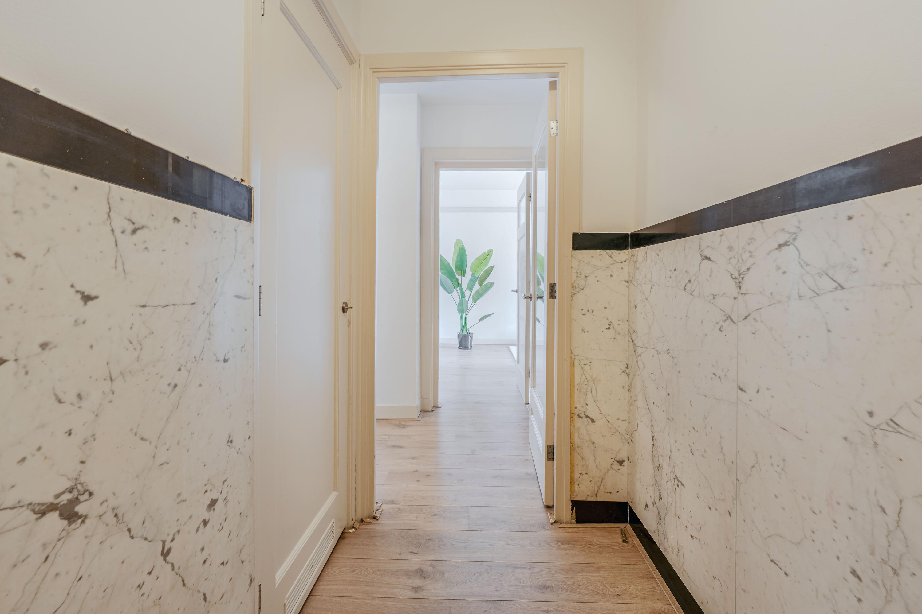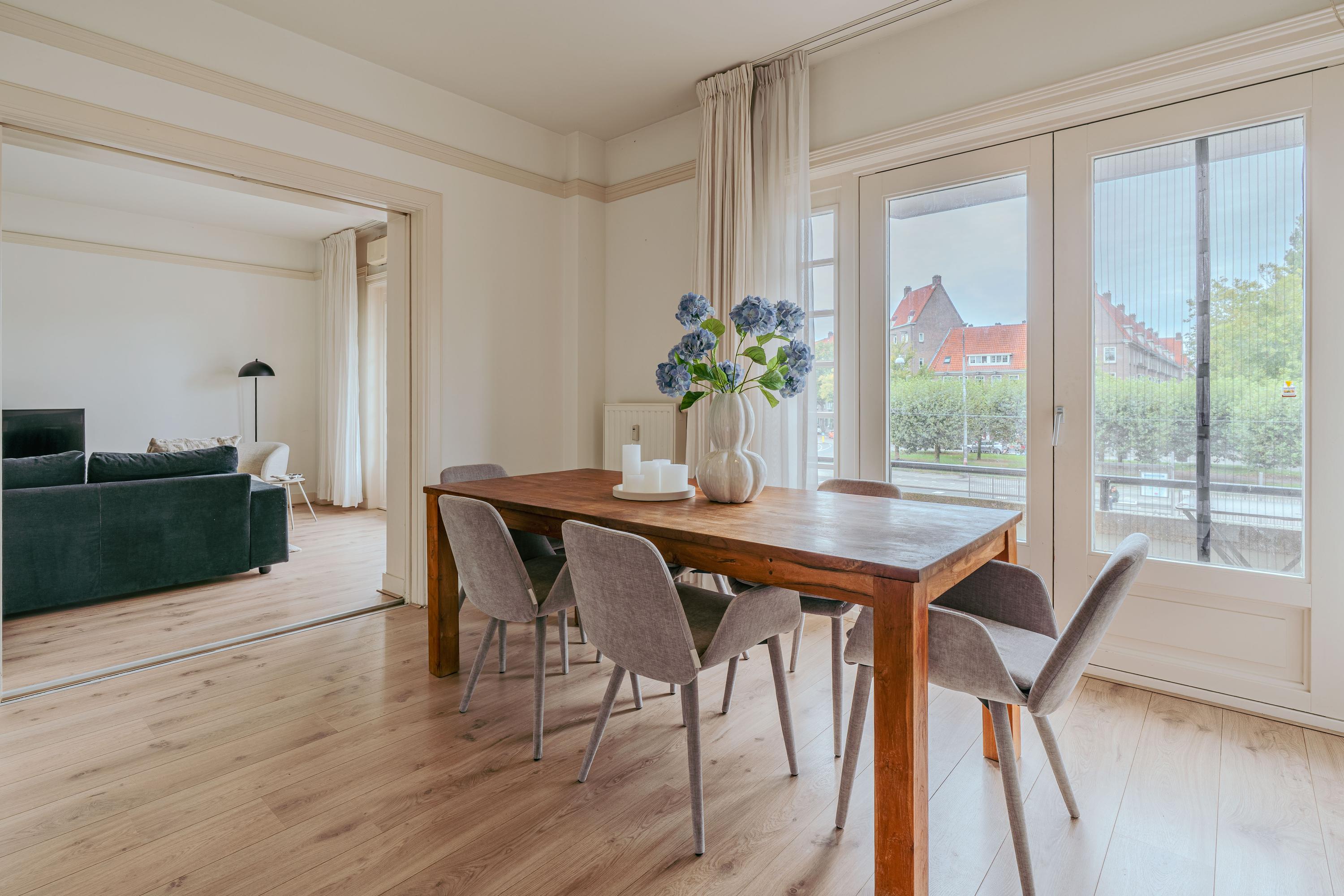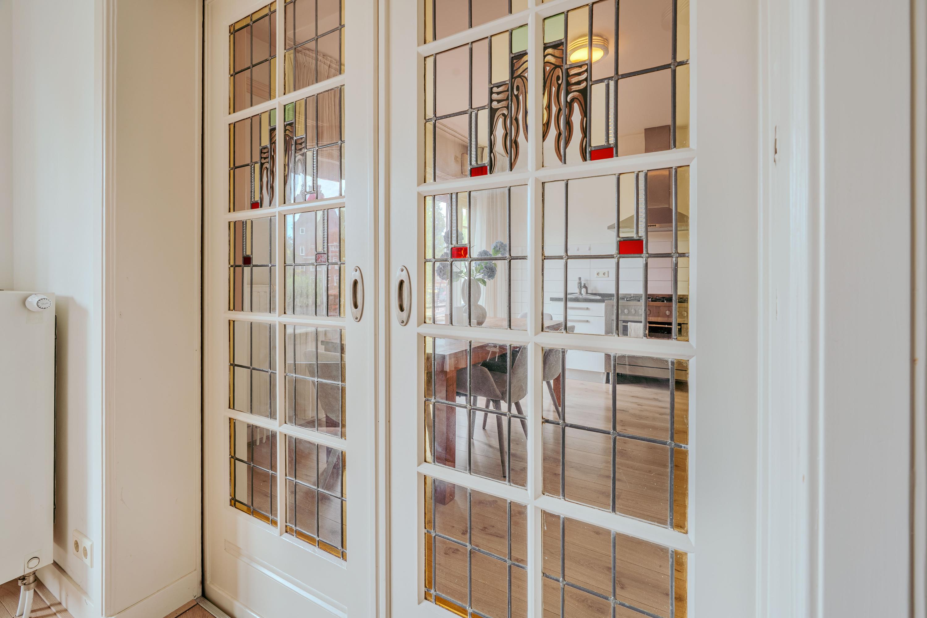 Middels het gemeenschappelijke trappenhuis bereikt u de eigen entree. Vanuit de marmeren hal heeft u toegang tot de verschillende vertrekken van de woning. Aan de voorzijde bevindt zich de lichte woonkamer met grote raampartijen en openslaande deuren naar twee balkons. Aangrenzend ligt de ruime eetkeuken, welke middels karakteristieke glas-in-lood schuifdeuren kan worden afgesloten. De keuken is voorzien van alle denkbare inbouwapparatuur waaronder een spoelbak, afzuigkap, vaatwasser en meer dan voldoende opbergruimte. Ook vanuit de keuken is er toegang tot het balkon.