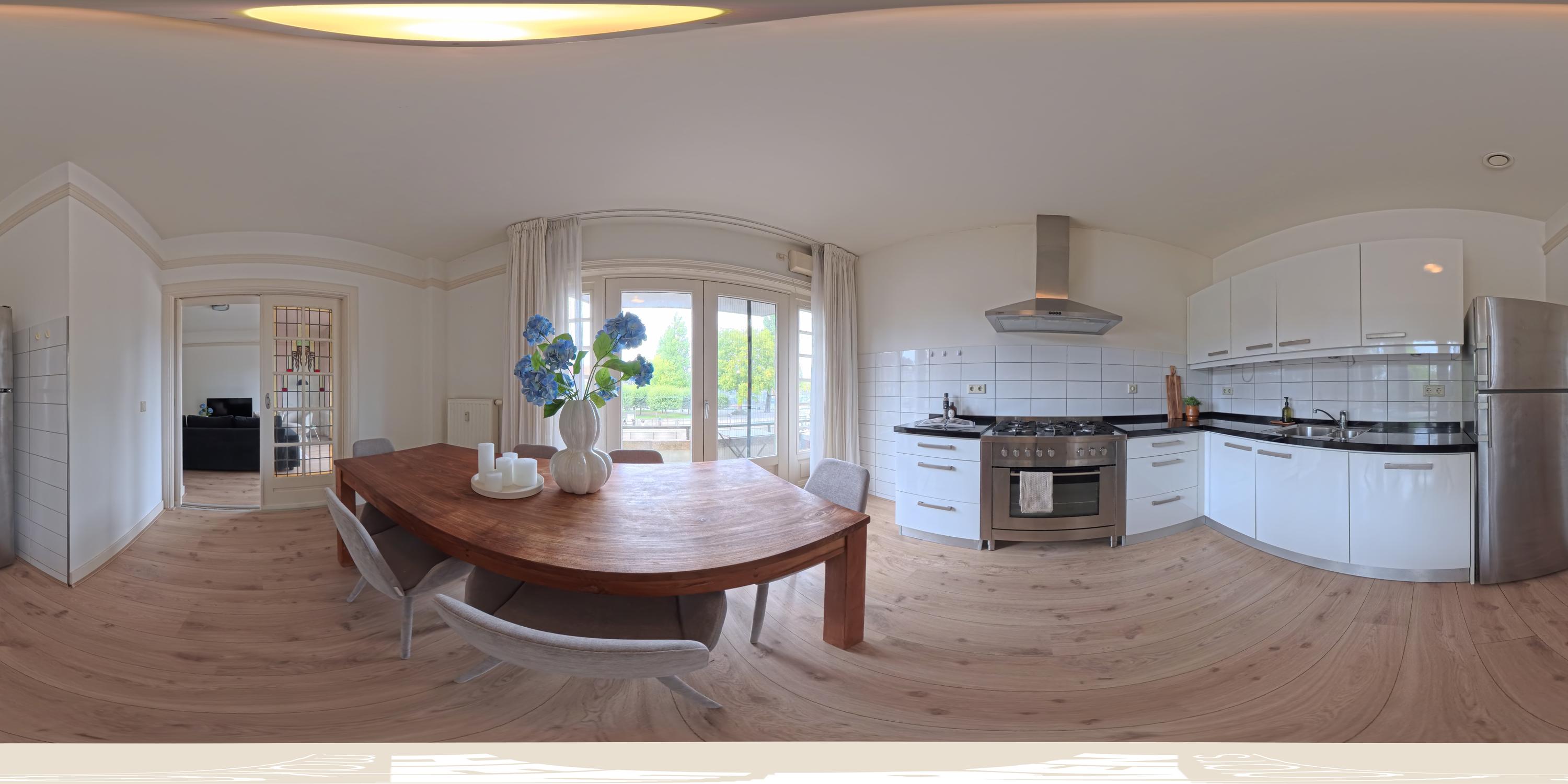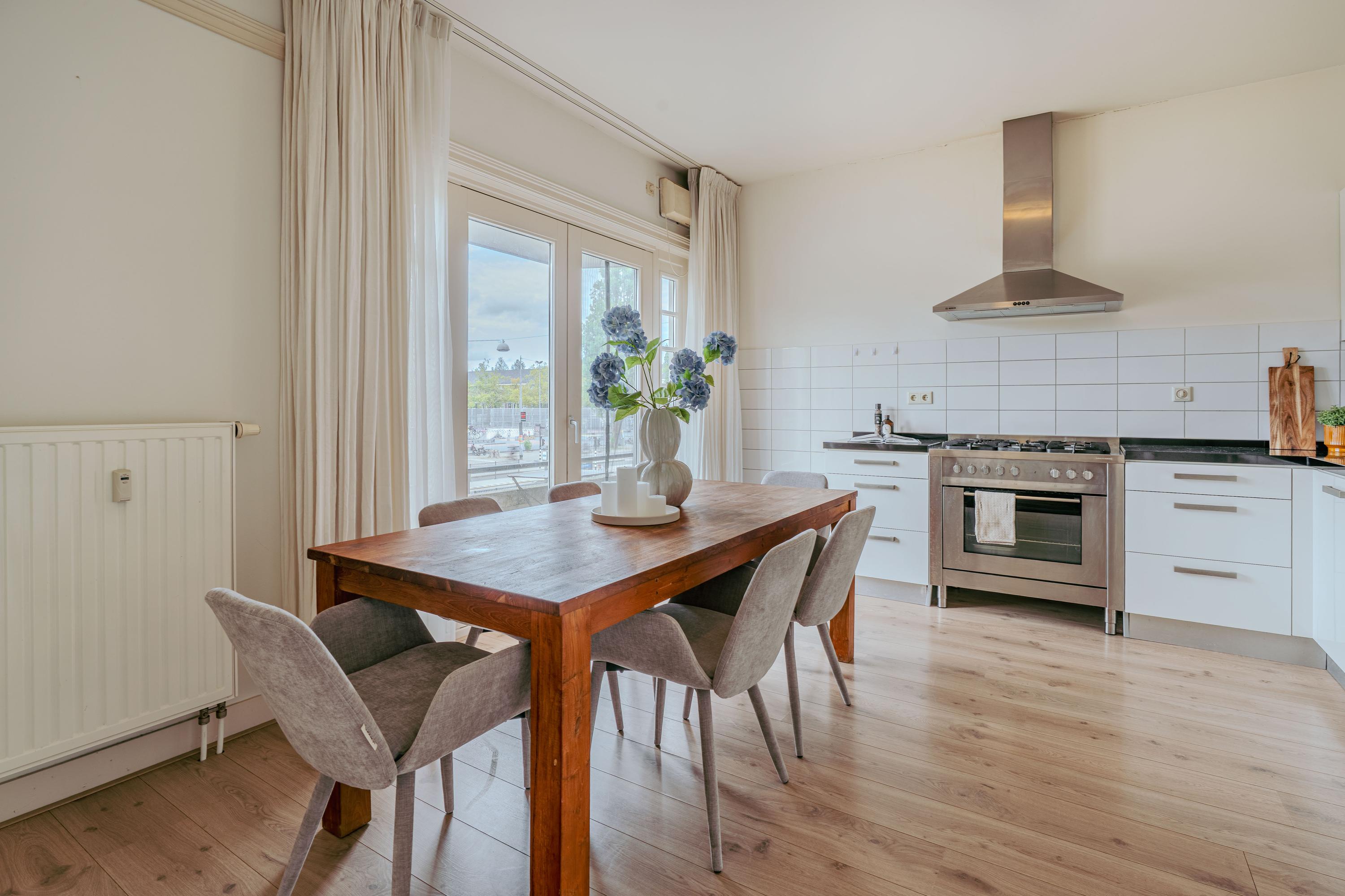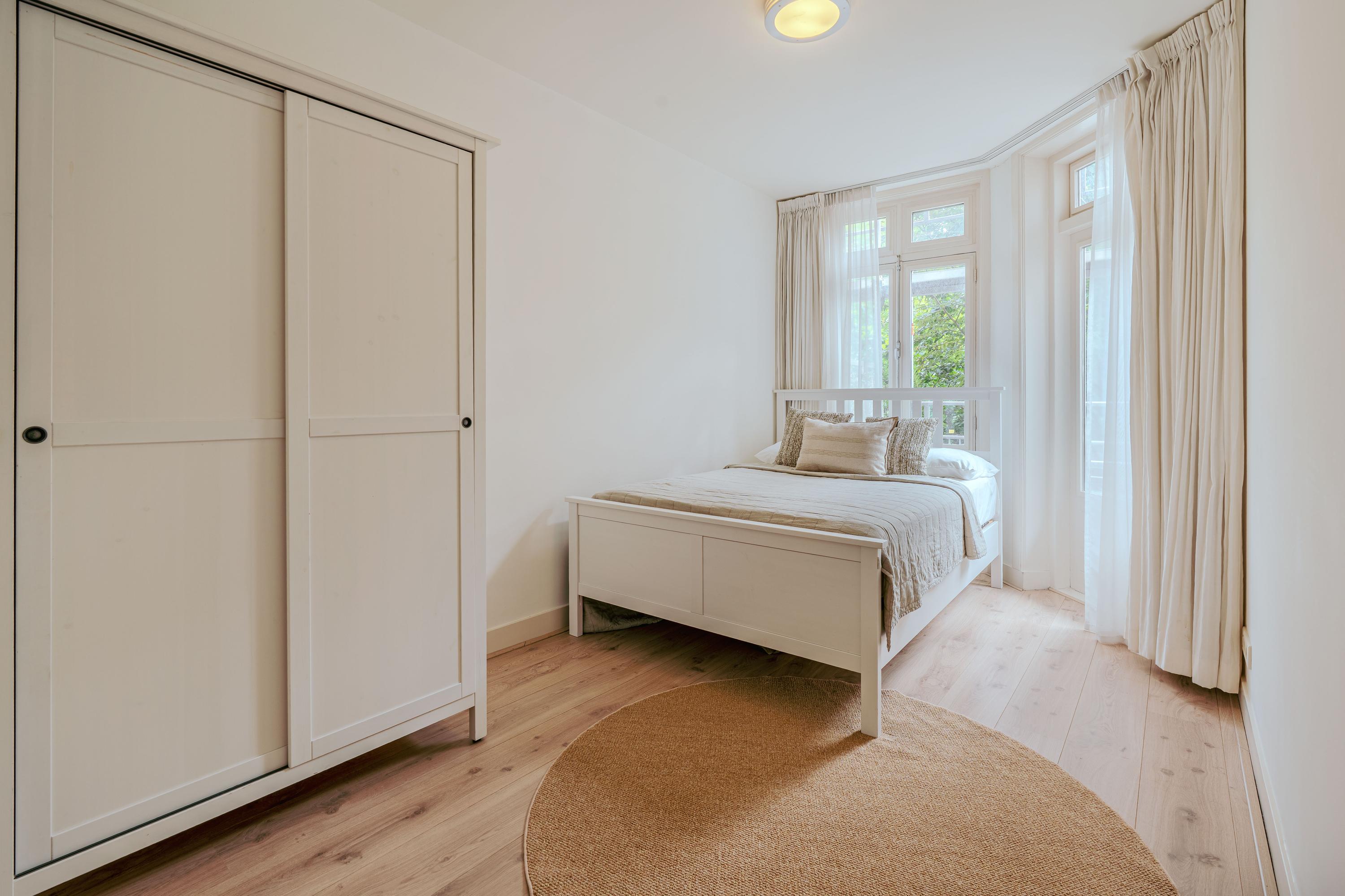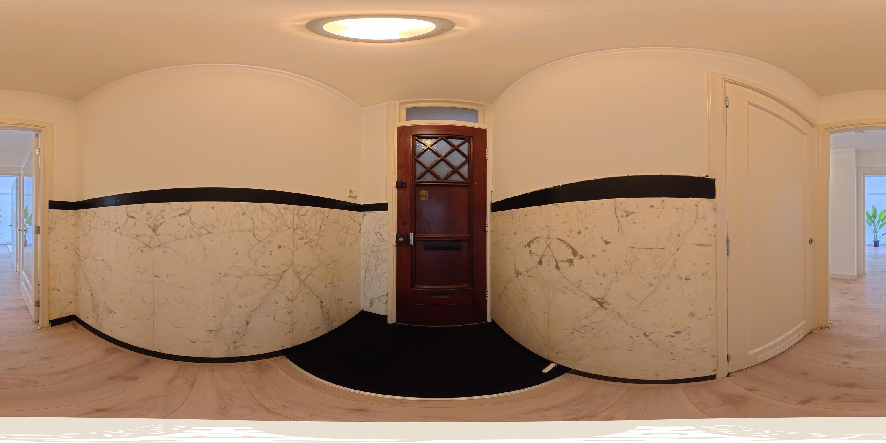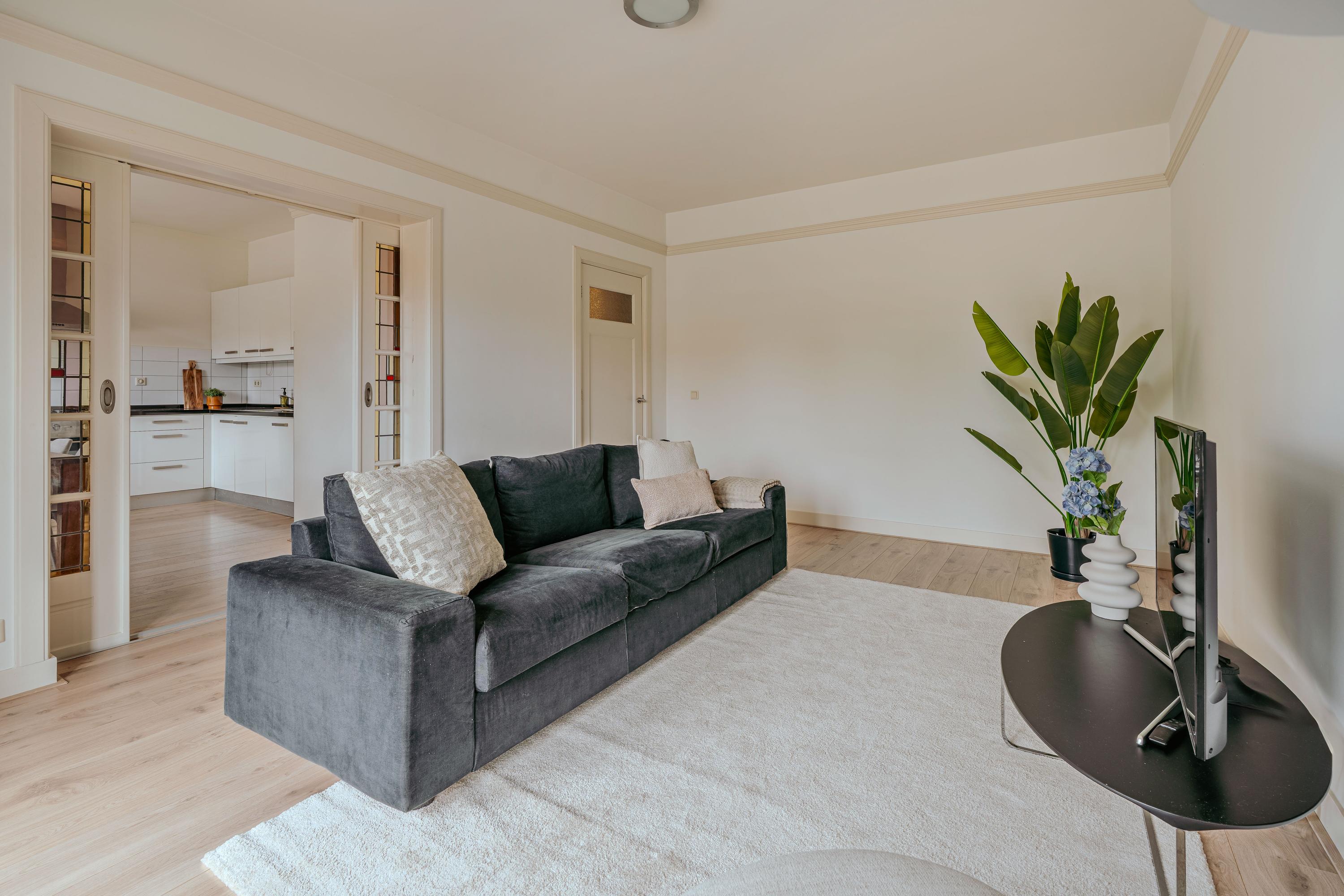 Middels het gemeenschappelijke trappenhuis bereikt u de eigen entree. Vanuit de marmeren hal heeft u toegang tot de verschillende vertrekken van de woning. Aan de voorzijde bevindt zich de lichte woonkamer met grote raampartijen en openslaande deuren naar twee balkons. Aangrenzend ligt de ruime eetkeuken, welke middels karakteristieke glas-in-lood schuifdeuren kan worden afgesloten. De keuken is voorzien van alle denkbare inbouwapparatuur waaronder een spoelbak, afzuigkap, vaatwasser en meer dan voldoende opbergruimte. Ook vanuit de keuken is er toegang tot het balkon.